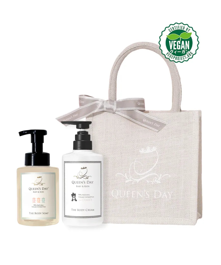 天然由来成分99%のボディソープとボディクリームを、ナチュラルなジュートバッグに詰め合わせました。赤ちゃんから大人まで、家族全員の肌を優しく守るオーガニック処方。