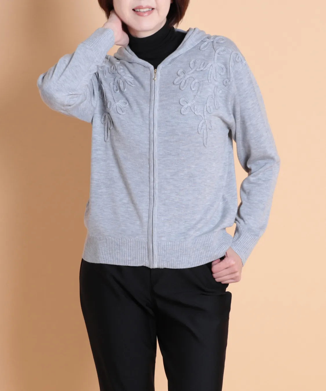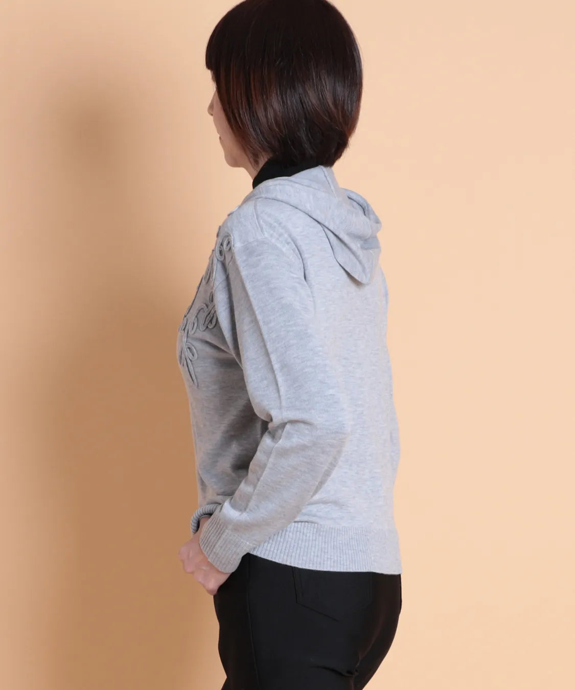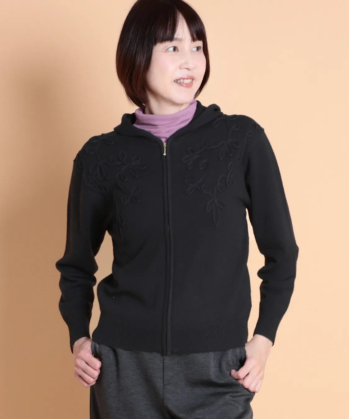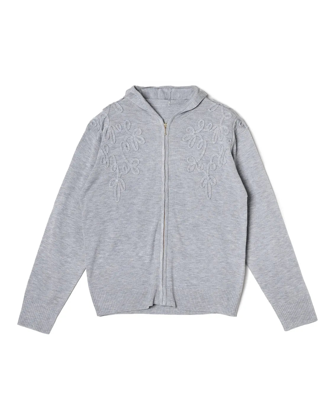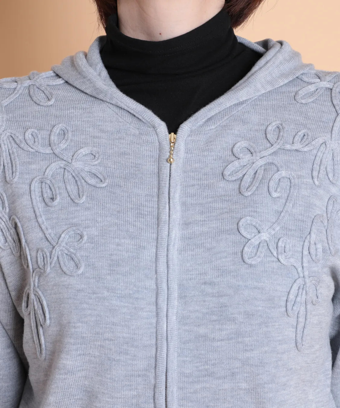 胸元の立体的なコード刺繍がアクセントになる、フード付きニットジャケット。