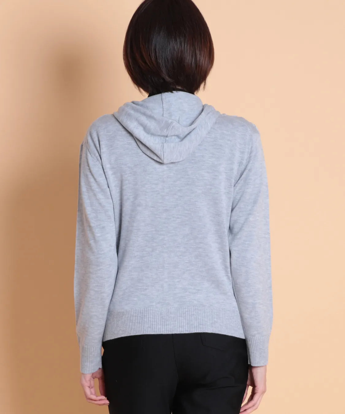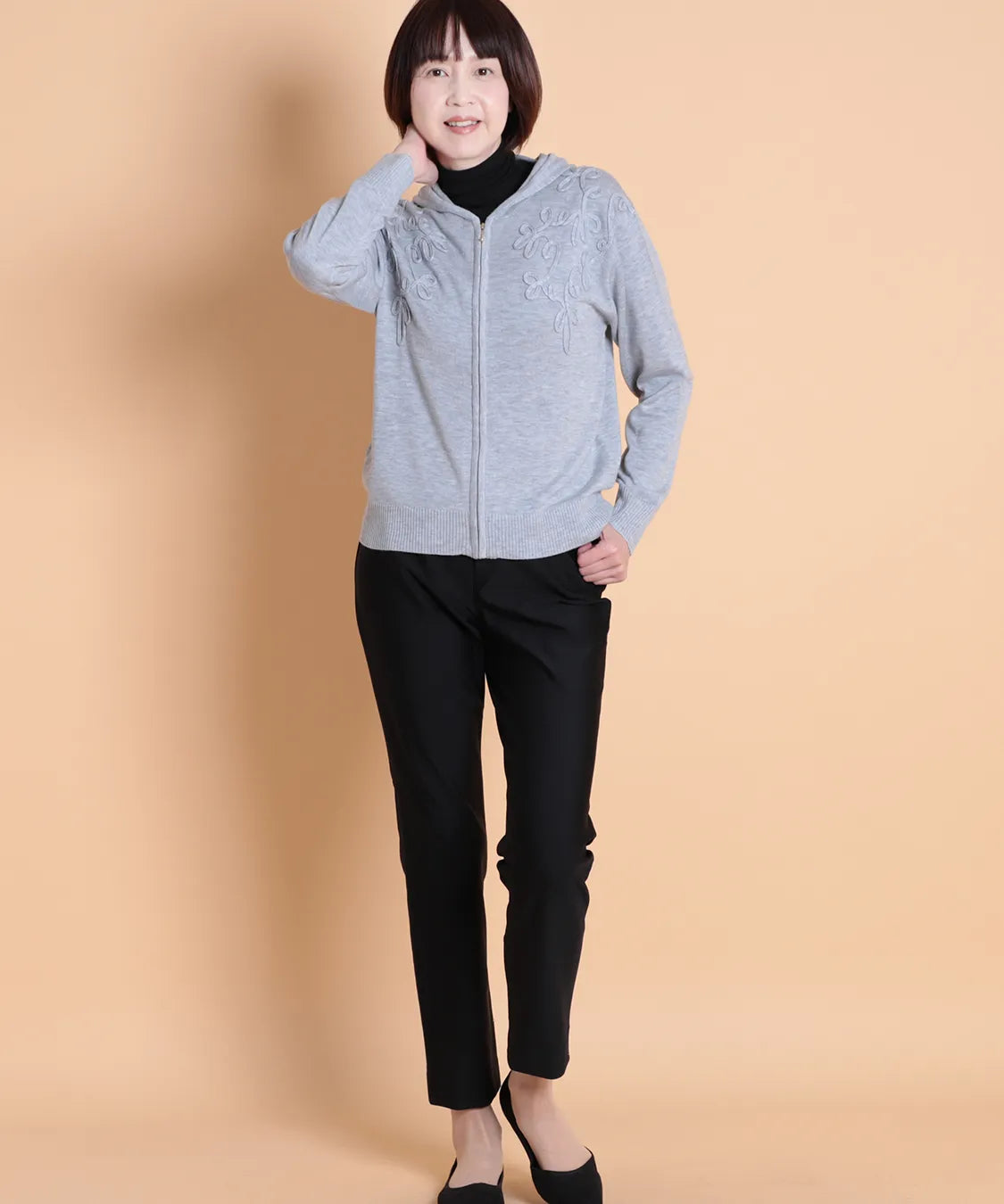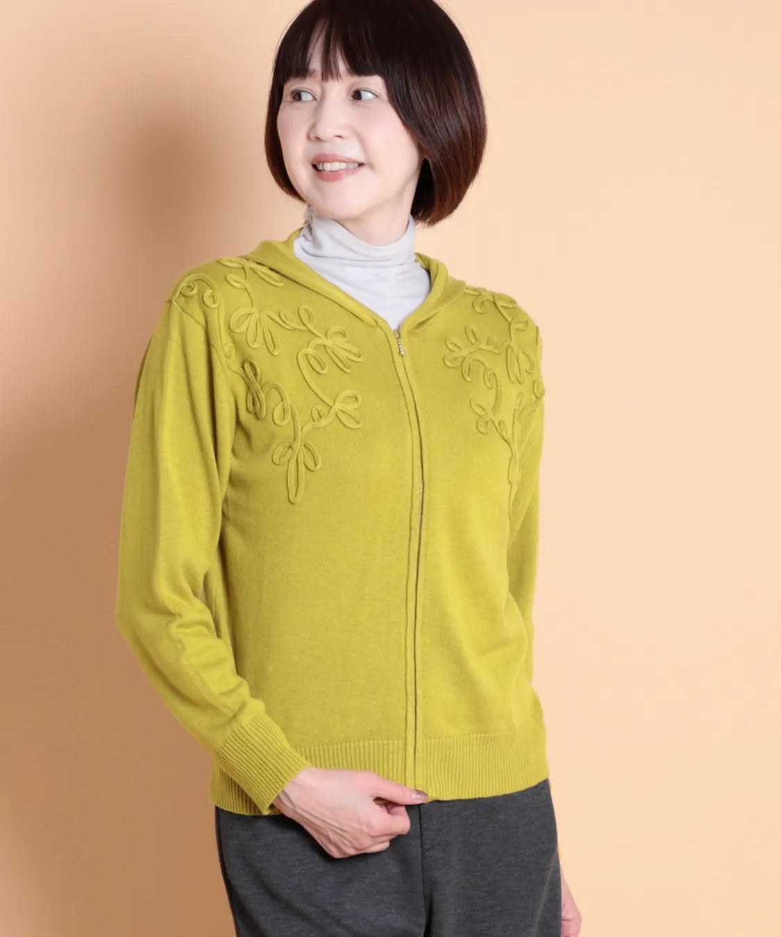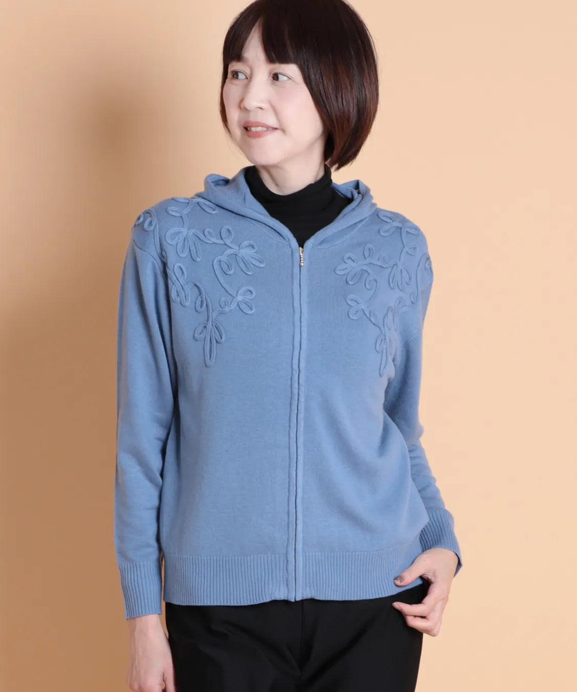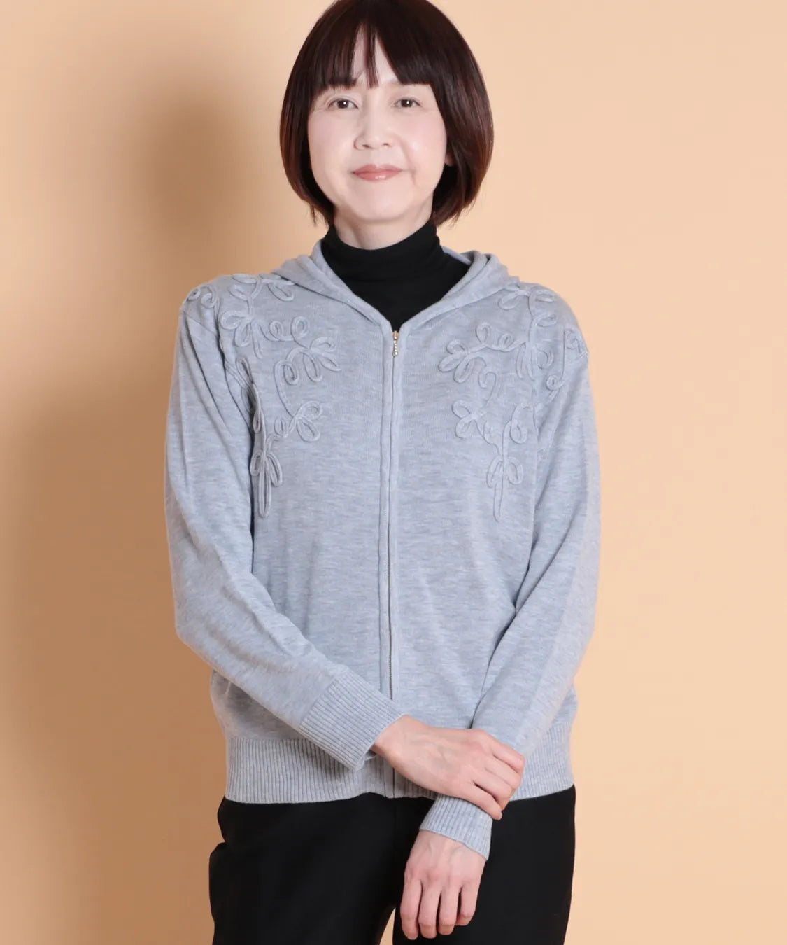 胸元の立体的なコード刺繍がアクセントになる、フード付きニットジャケット。