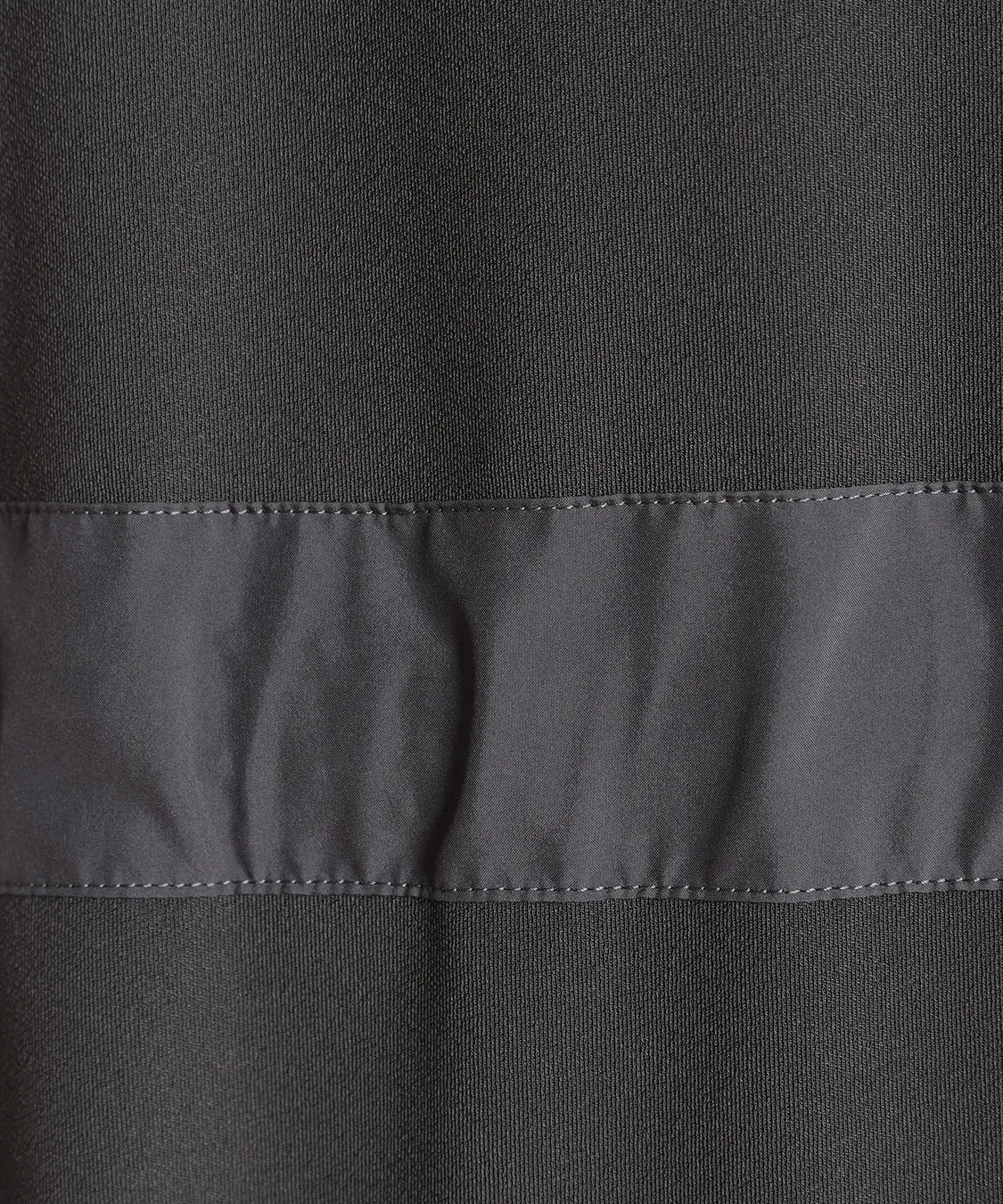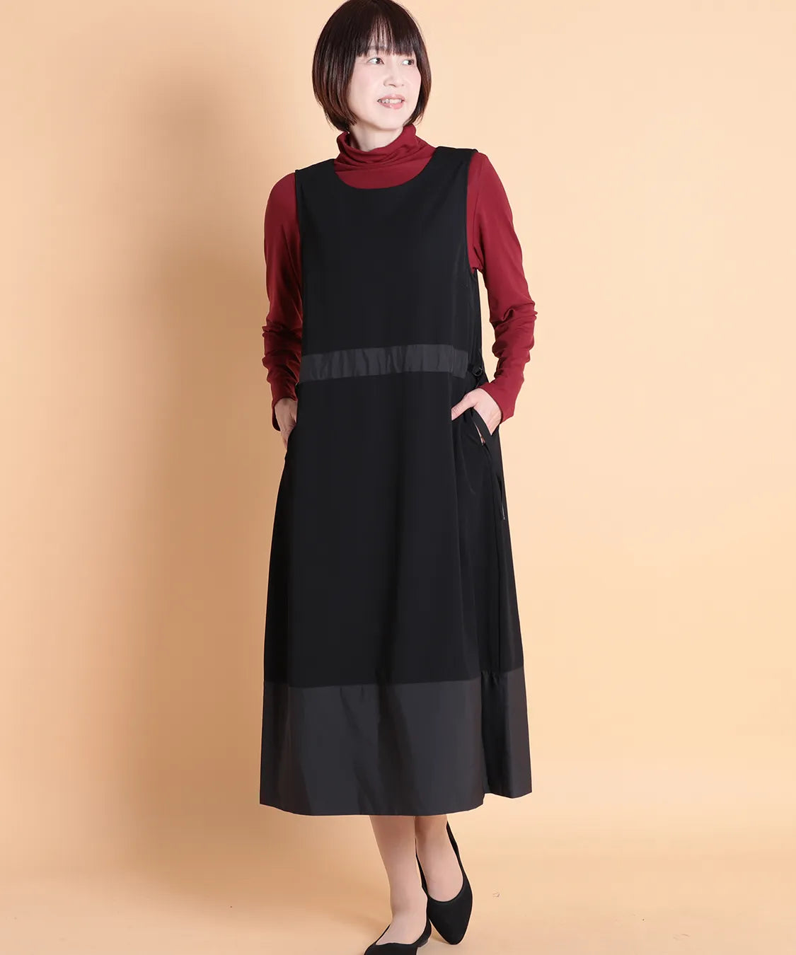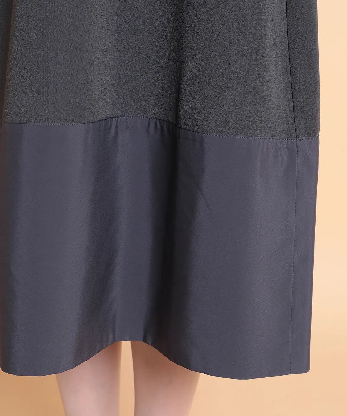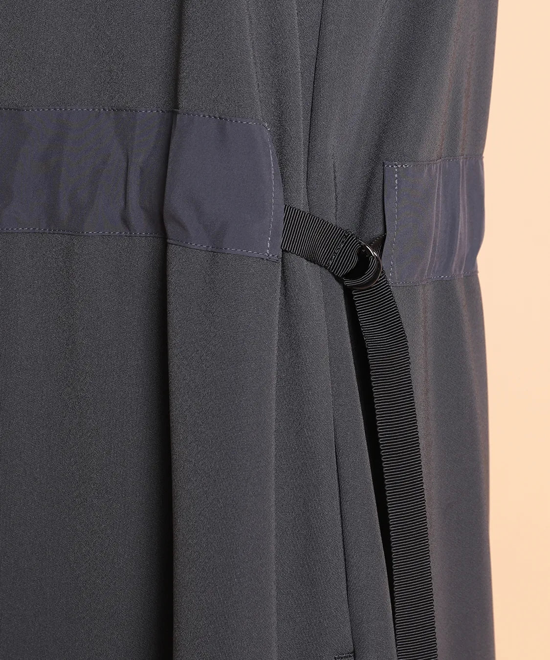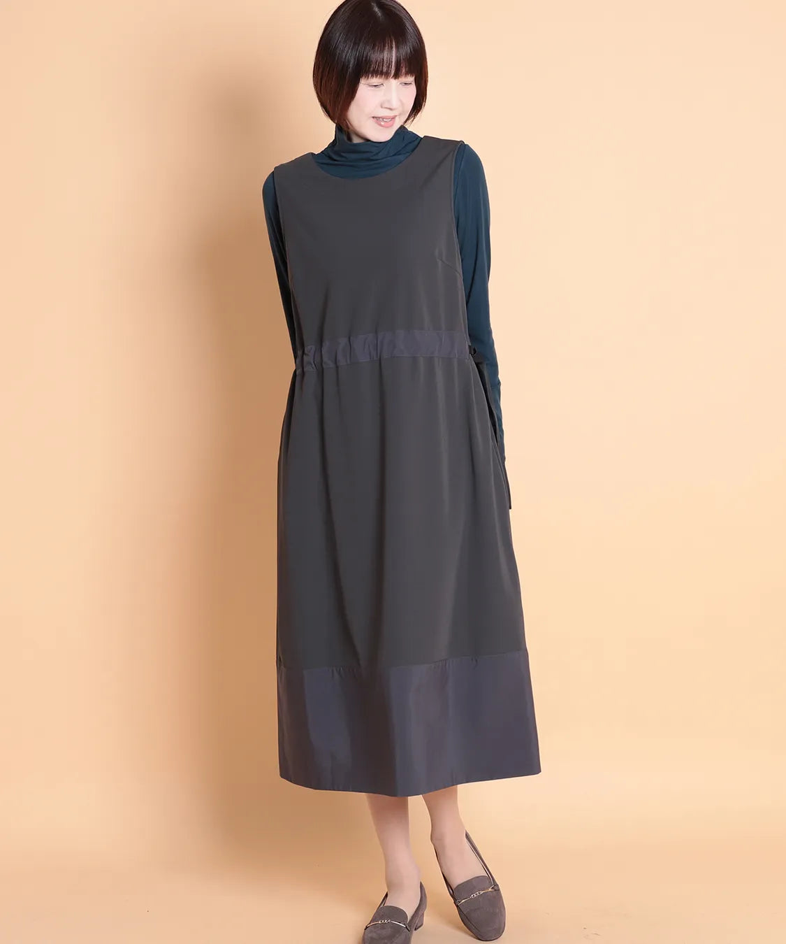 程良い厚みと落ち感、ハリ感を兼ね備えた軽やかな素材を使用。ポリウレタン入りで軽やかな着心地とシワになりにくい実用性も兼ね備えています。ウエストの配色切り替えで腰高効果を狙いました。またウエストを絞れば、シルエットを変えて着用可能です。