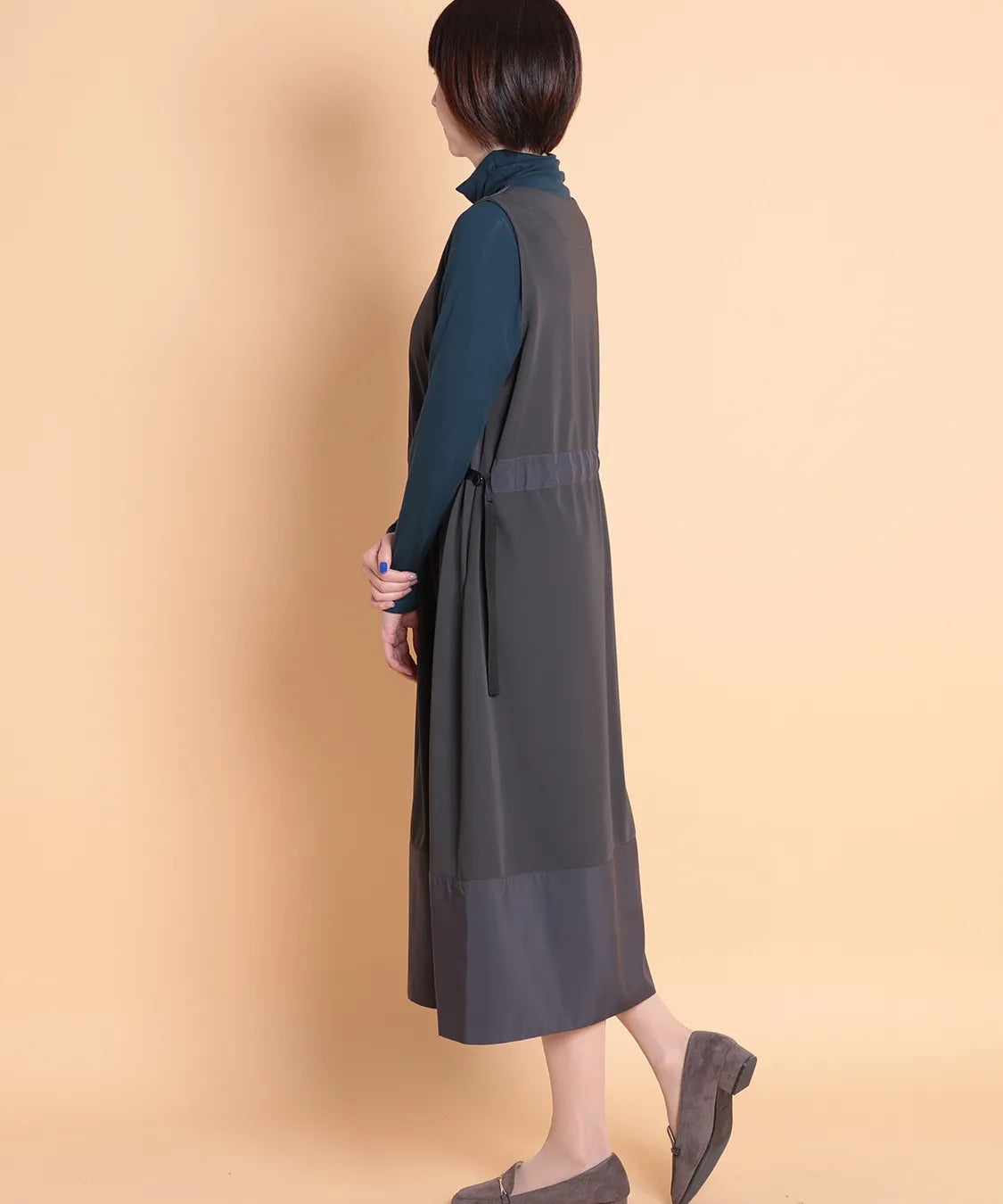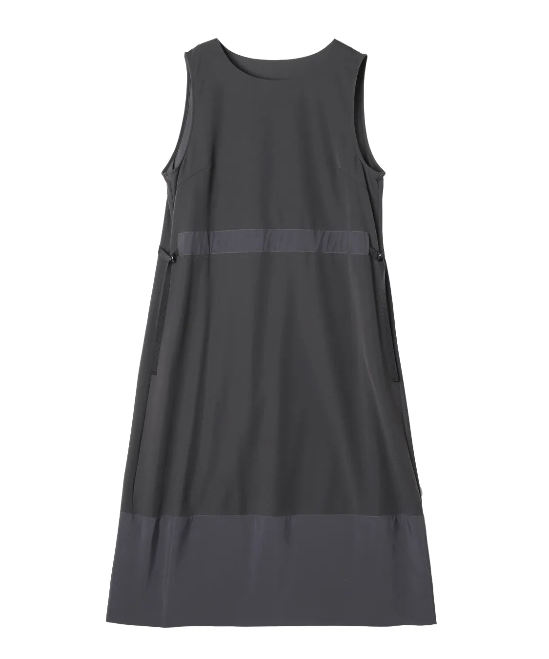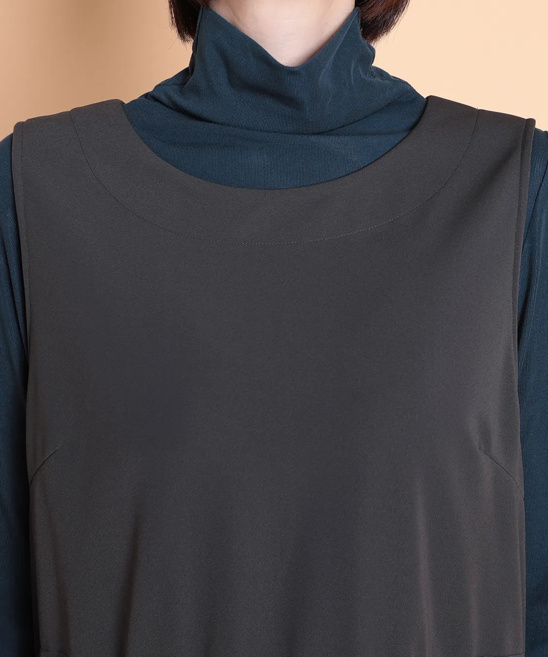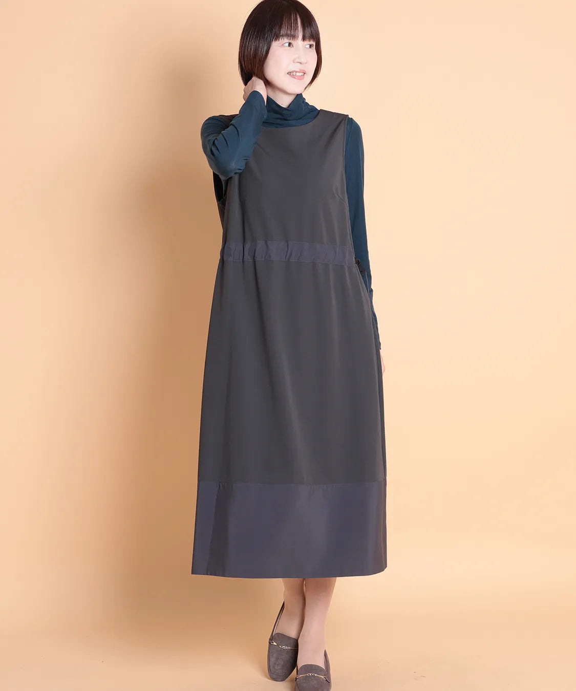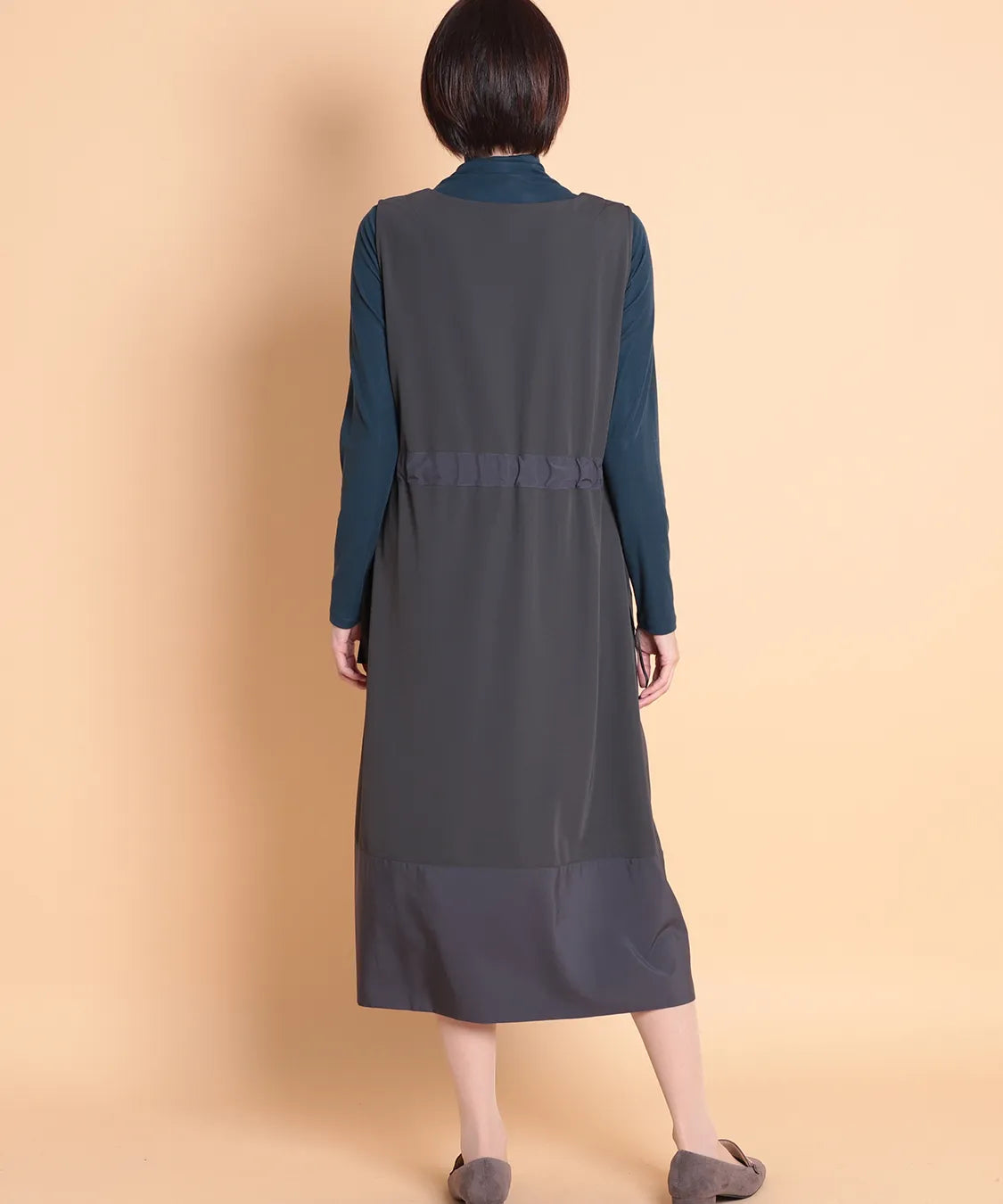 程良い厚みと落ち感、ハリ感を兼ね備えた軽やかな素材を使用。ポリウレタン入りで軽やかな着心地とシワになりにくい実用性も兼ね備えています。ウエストの配色切り替えで腰高効果を狙いました。またウエストを絞れば、シルエットを変えて着用可能です。