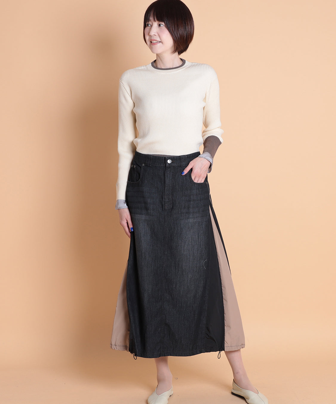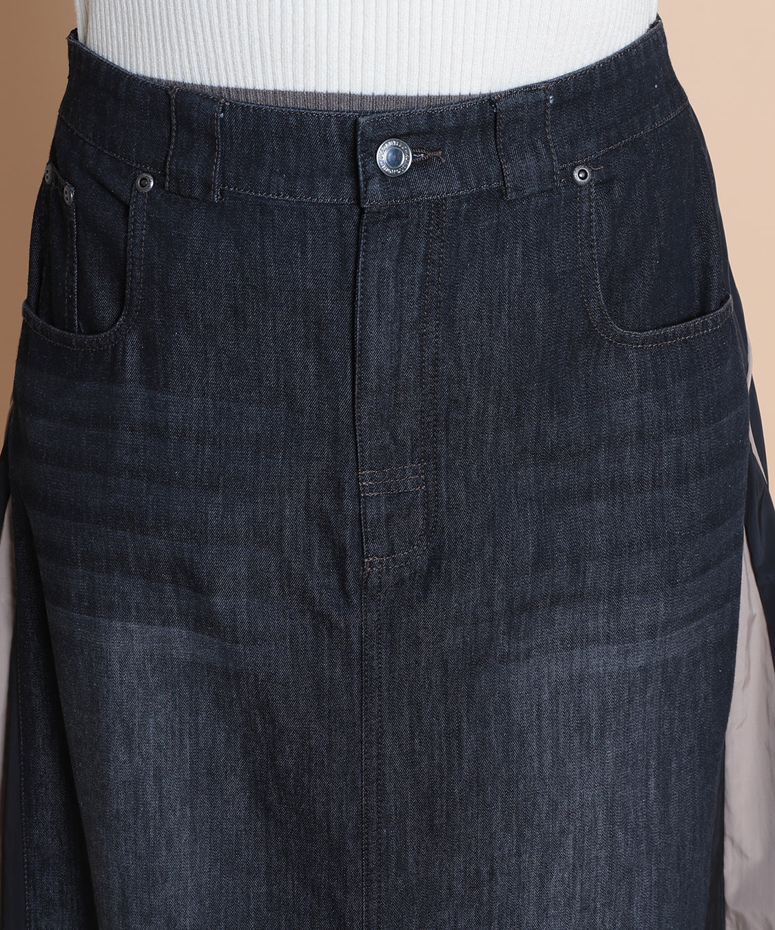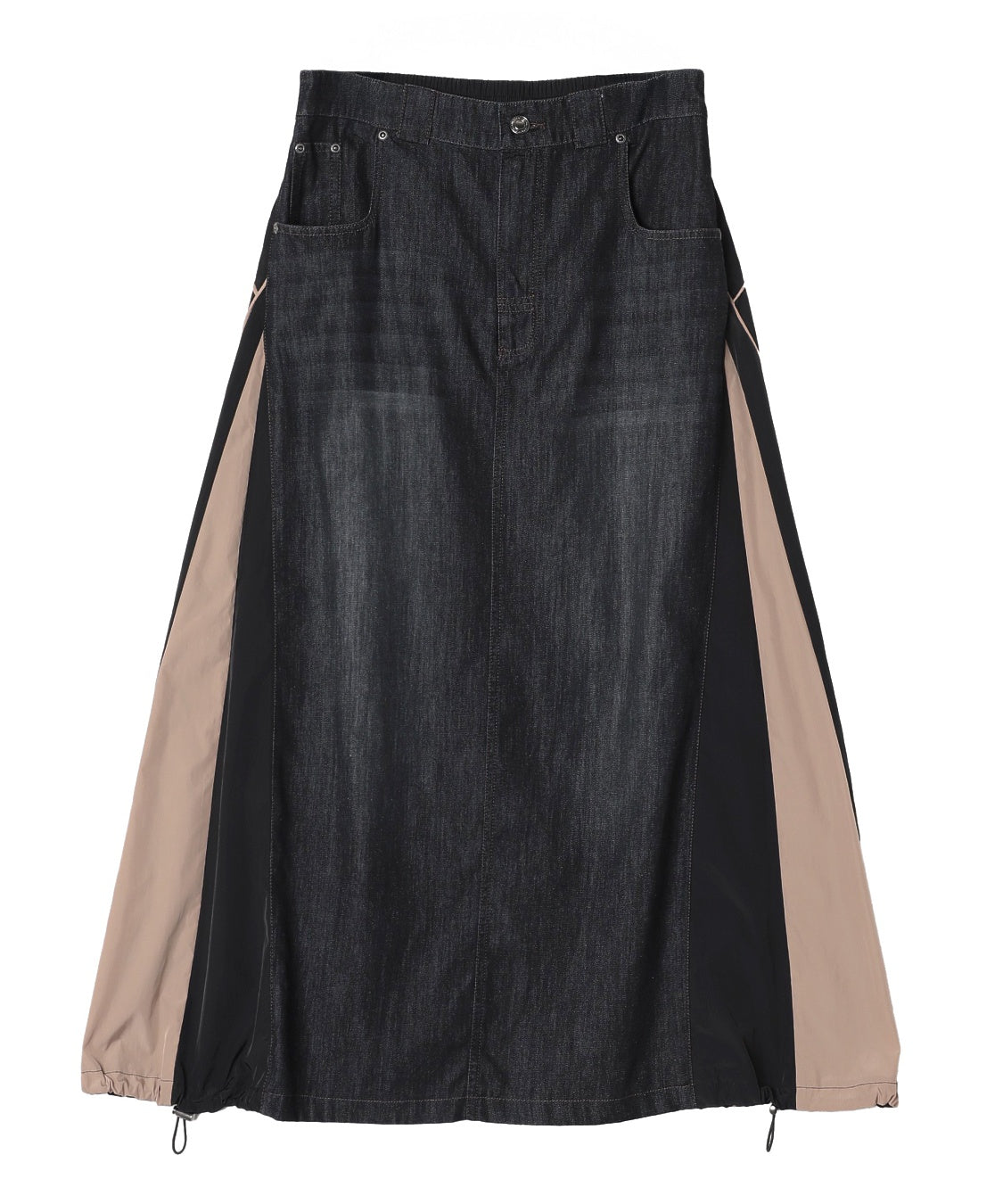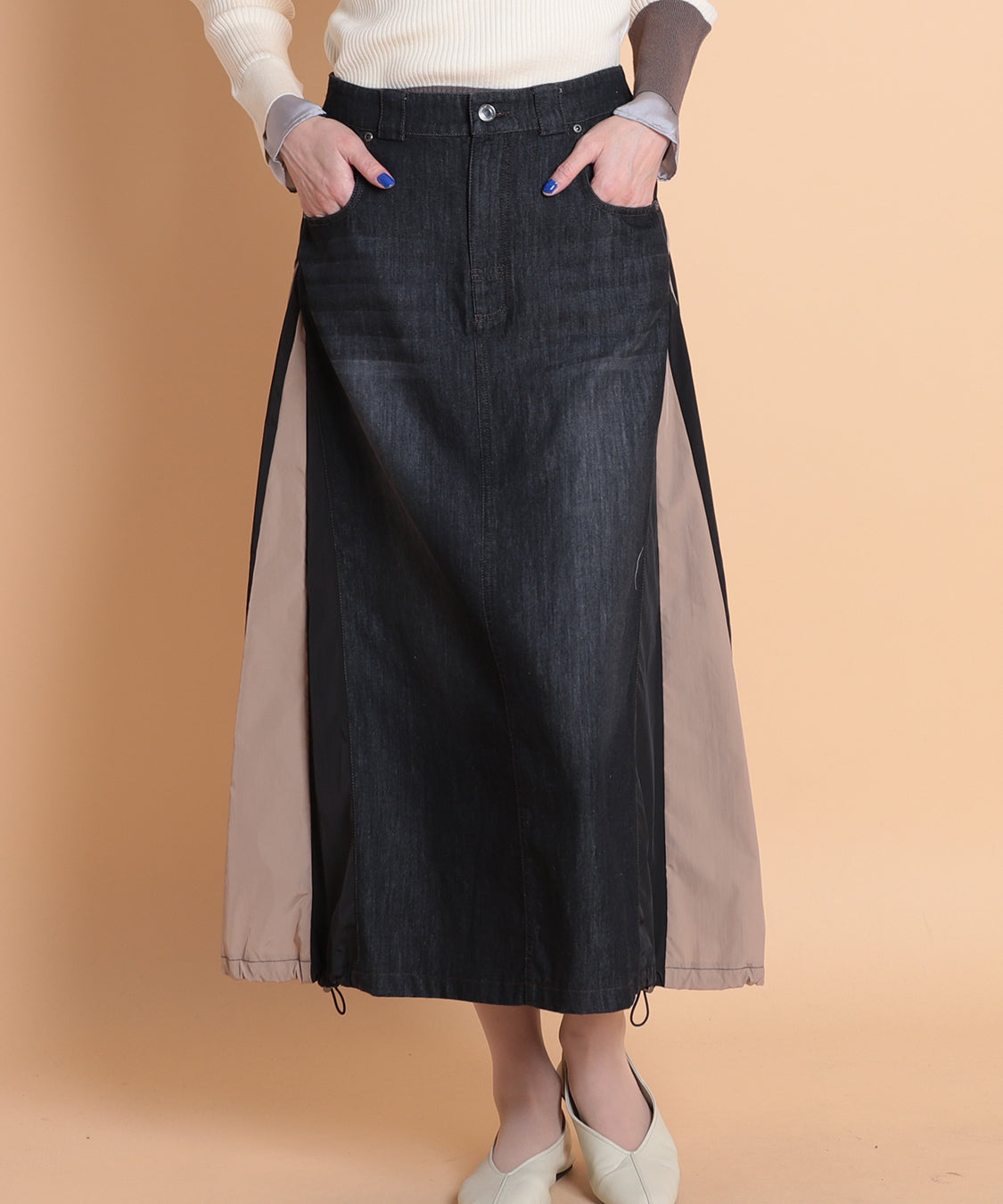 前後&両サイドを異素材で切り替え、スタイルアップ効果抜群のデニムスカート。ウエストから広がるAラインシルエットが気になる脚を美しくカバー◎シンプルなTシャツを合わせるだけで今年らしいスタイリングが完成するアイテムです。