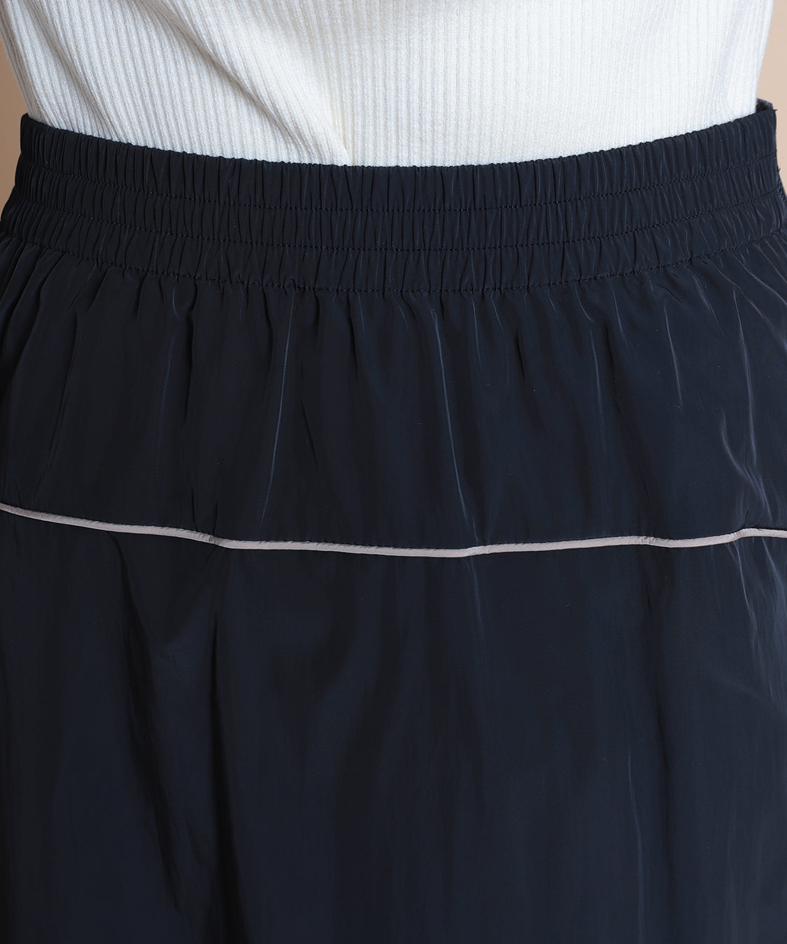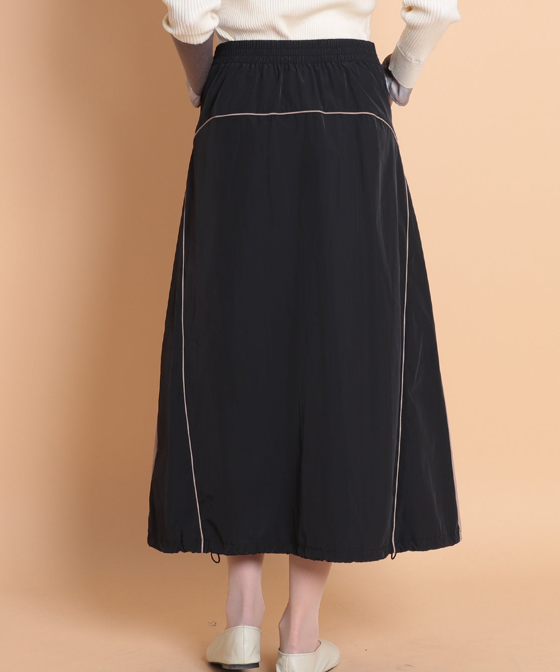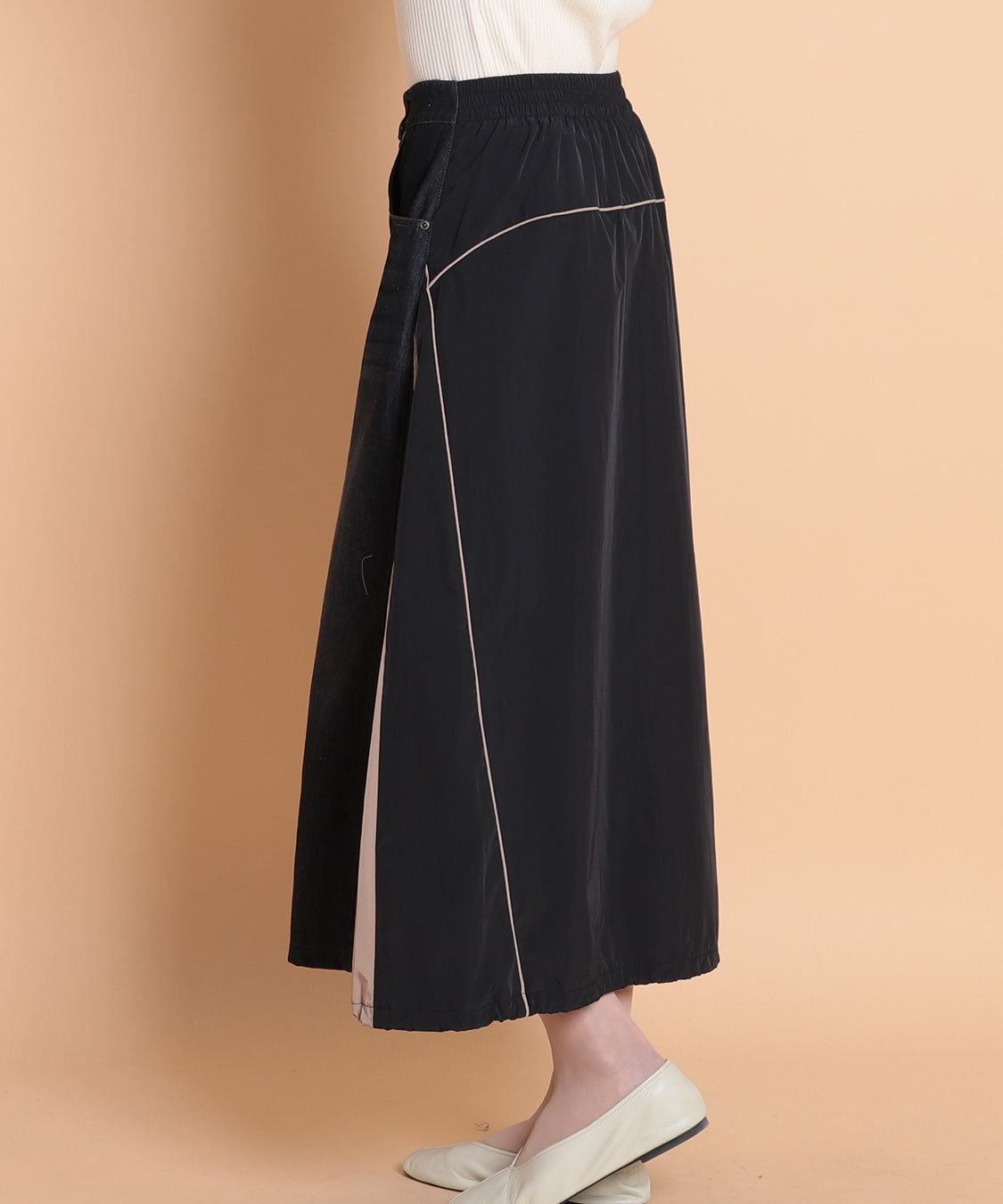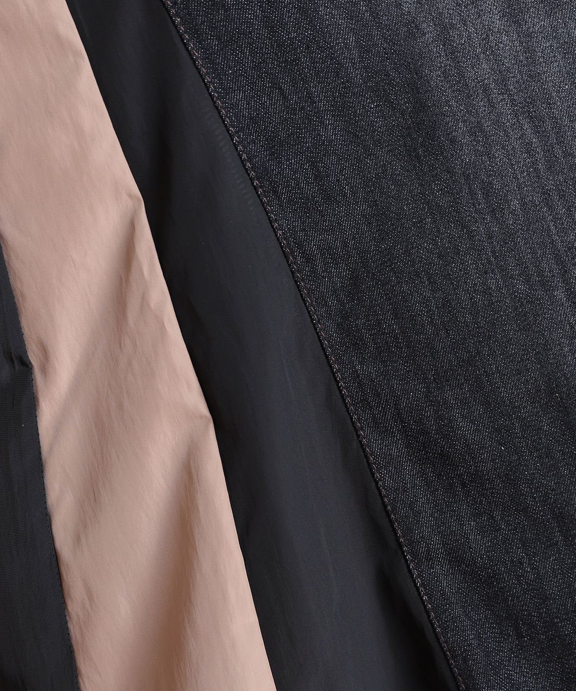 前後&両サイドを異素材で切り替え、スタイルアップ効果抜群のデニムスカート。ウエストから広がるAラインシルエットが気になる脚を美しくカバー◎シンプルなTシャツを合わせるだけで今年らしいスタイリングが完成するアイテムです。