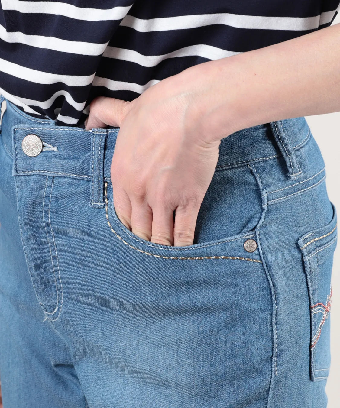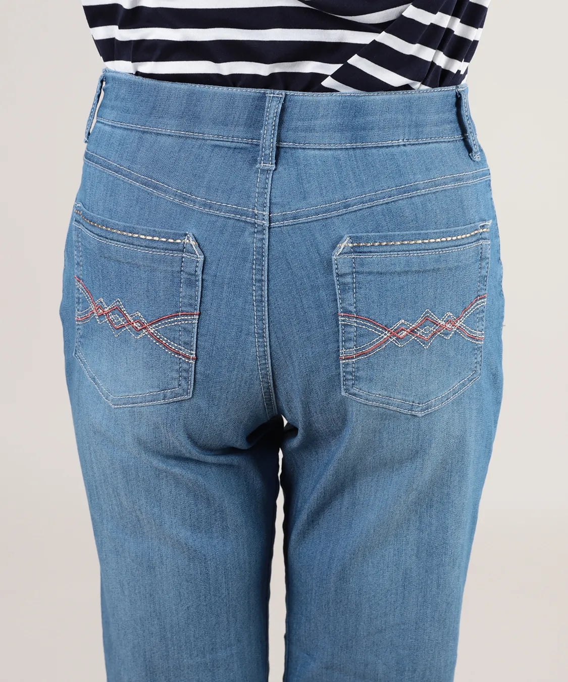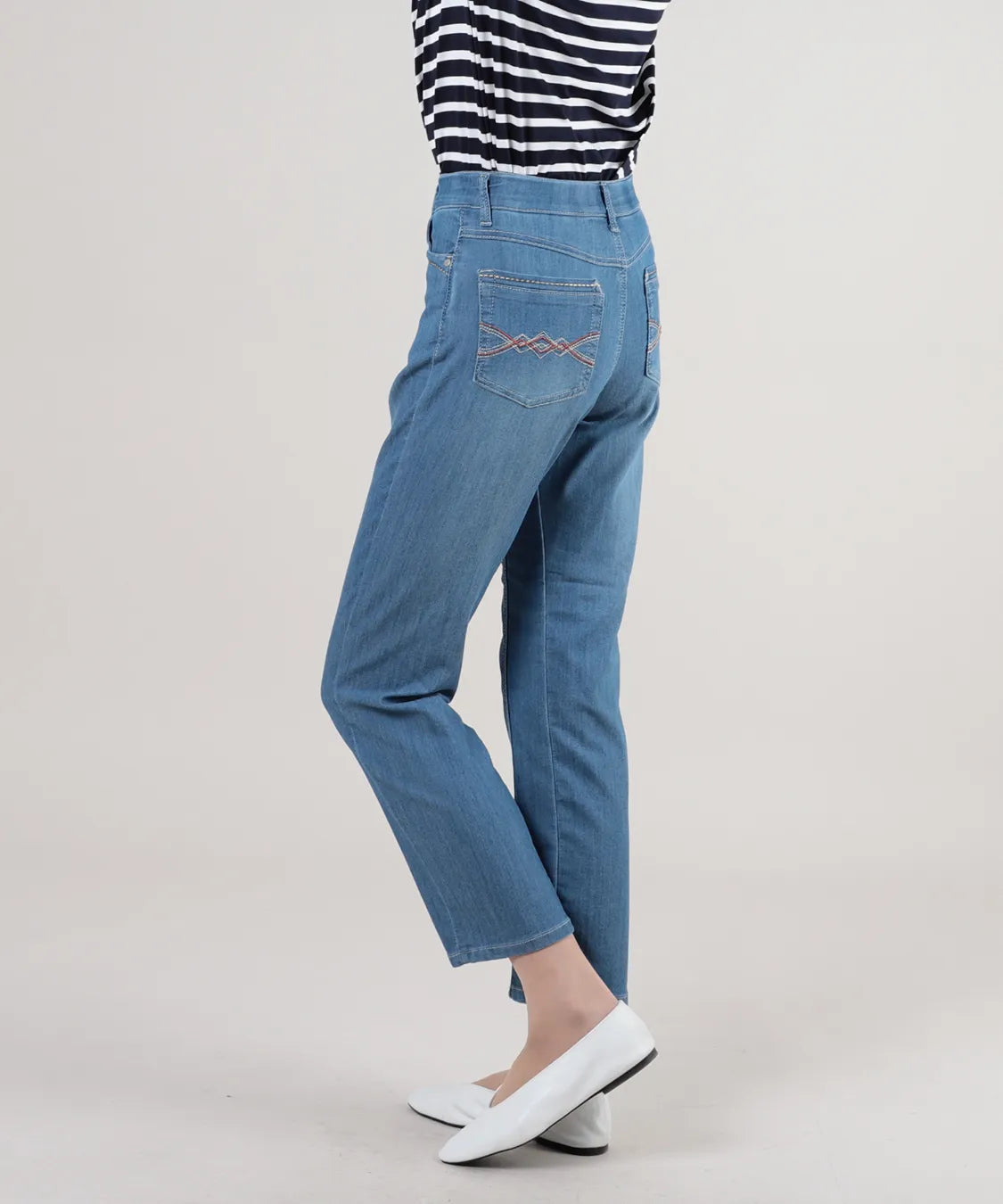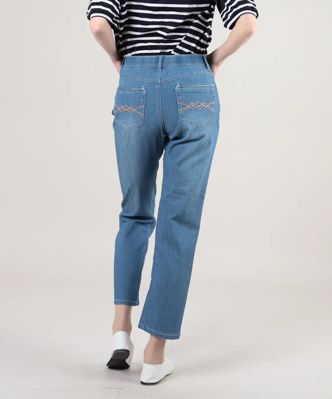 程よいストレッチ性と柔らかな風合いで、快適な履き心地に仕上げました。すっきりとしたストレートシルエットが脚のラインを美しく見せ、軽やかなクロップド丈で足元も爽やかな印象に。後ろポケットのステッチデザインがさりげないアクセントとなり、カジュアルからきれいめまで幅広いコーディネートに活躍する一本です。