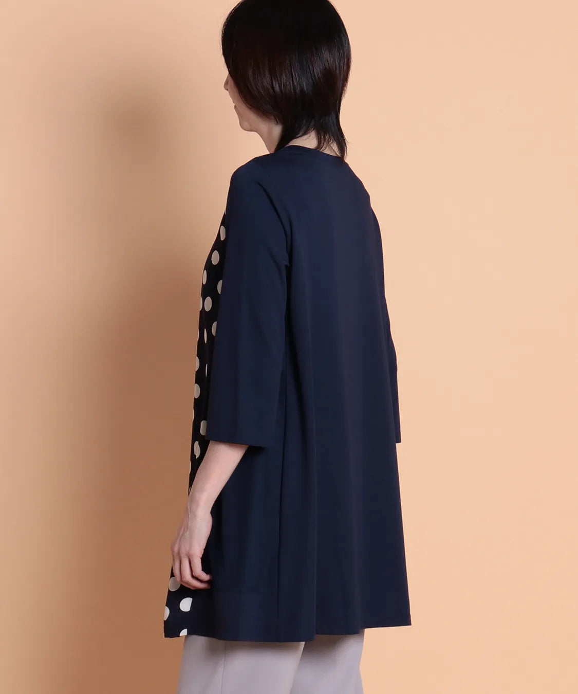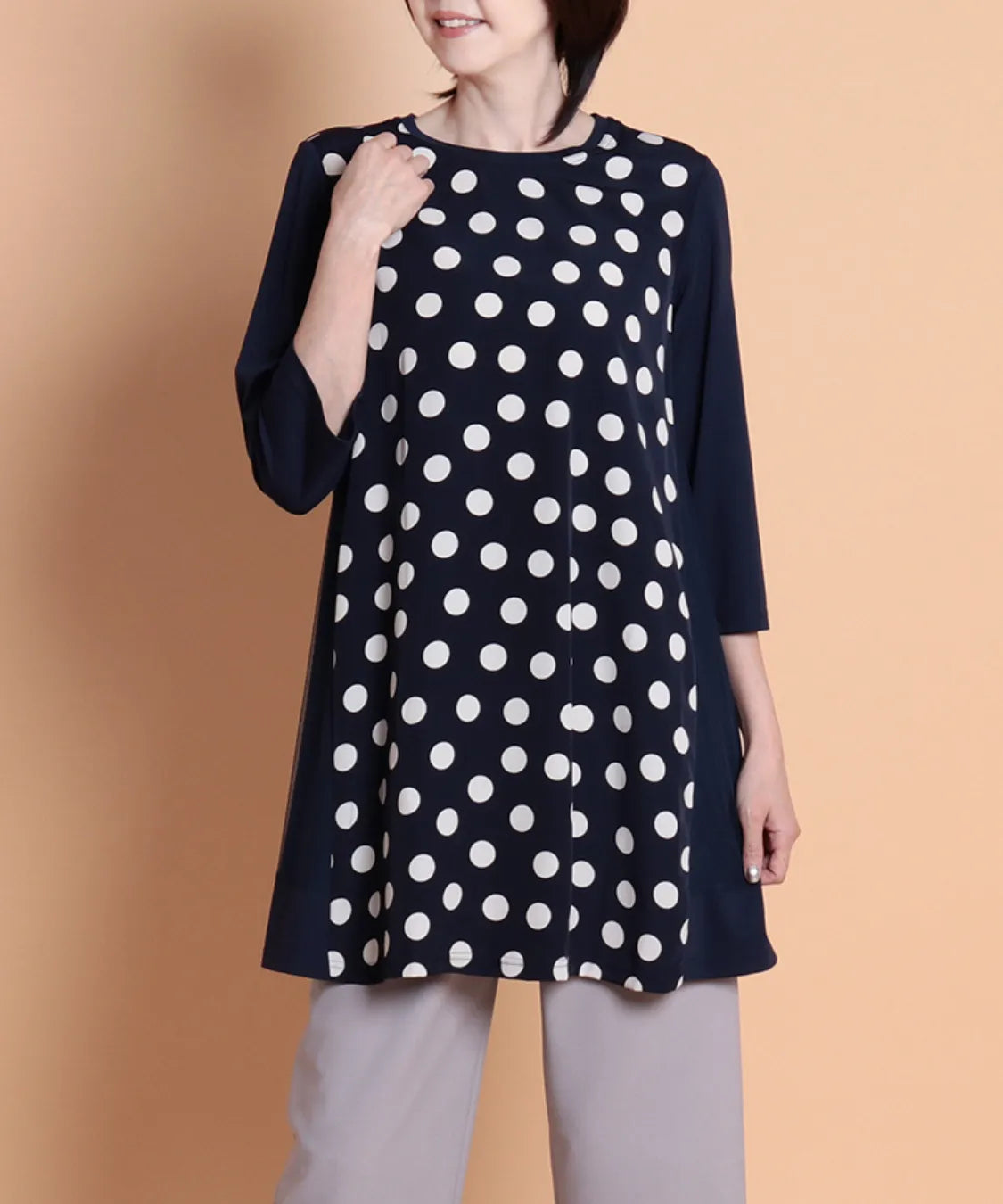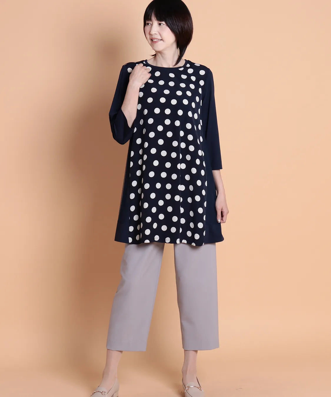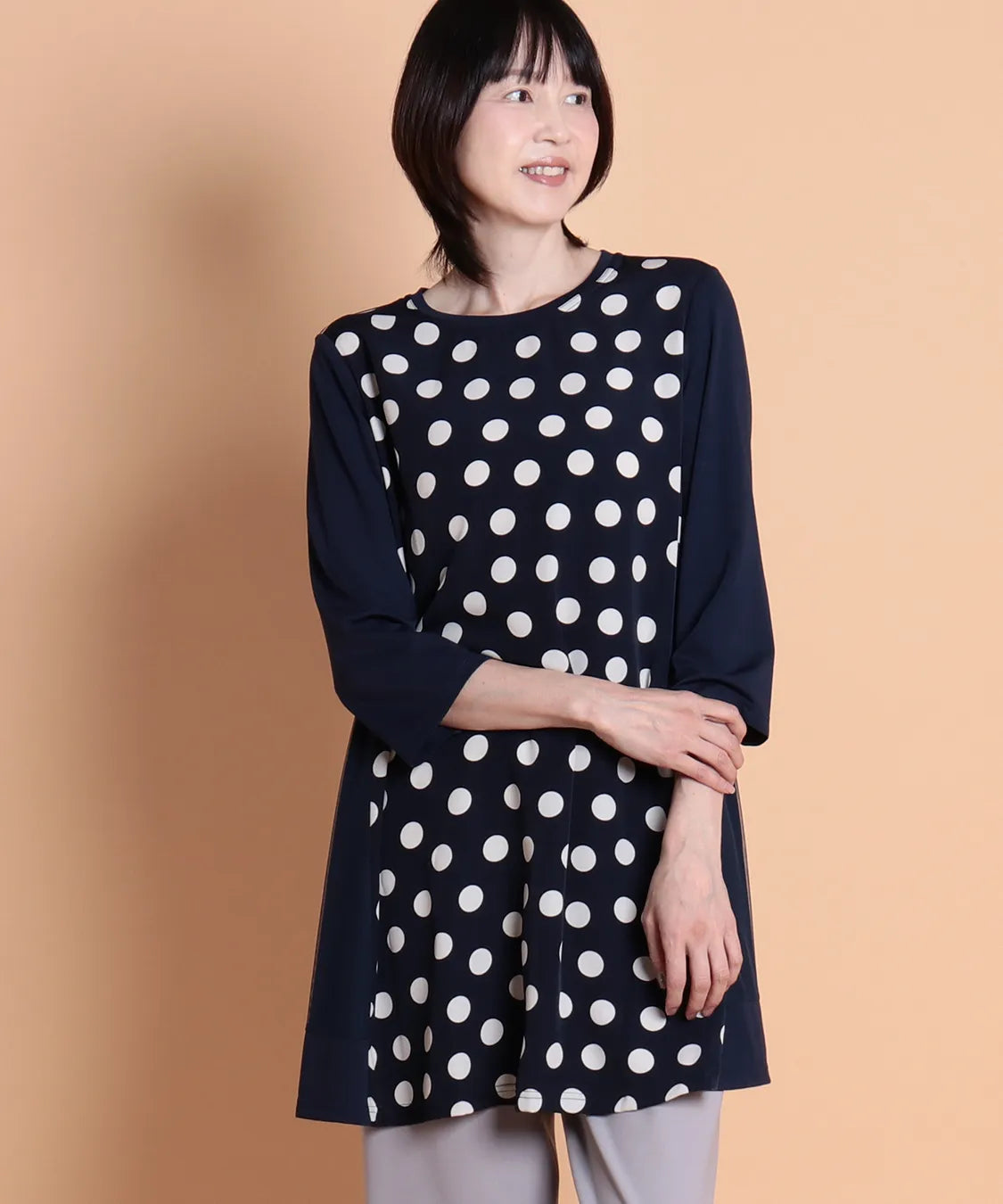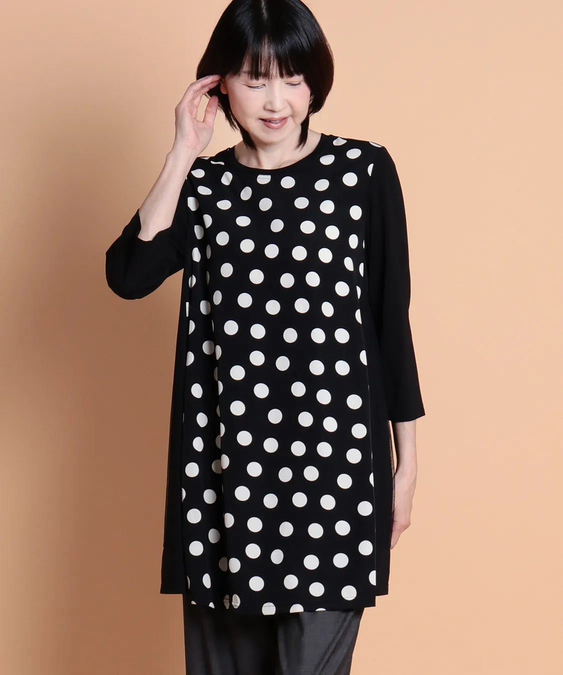 遊び心溢れるランダムドットが主役の、大人可愛いチュニック。