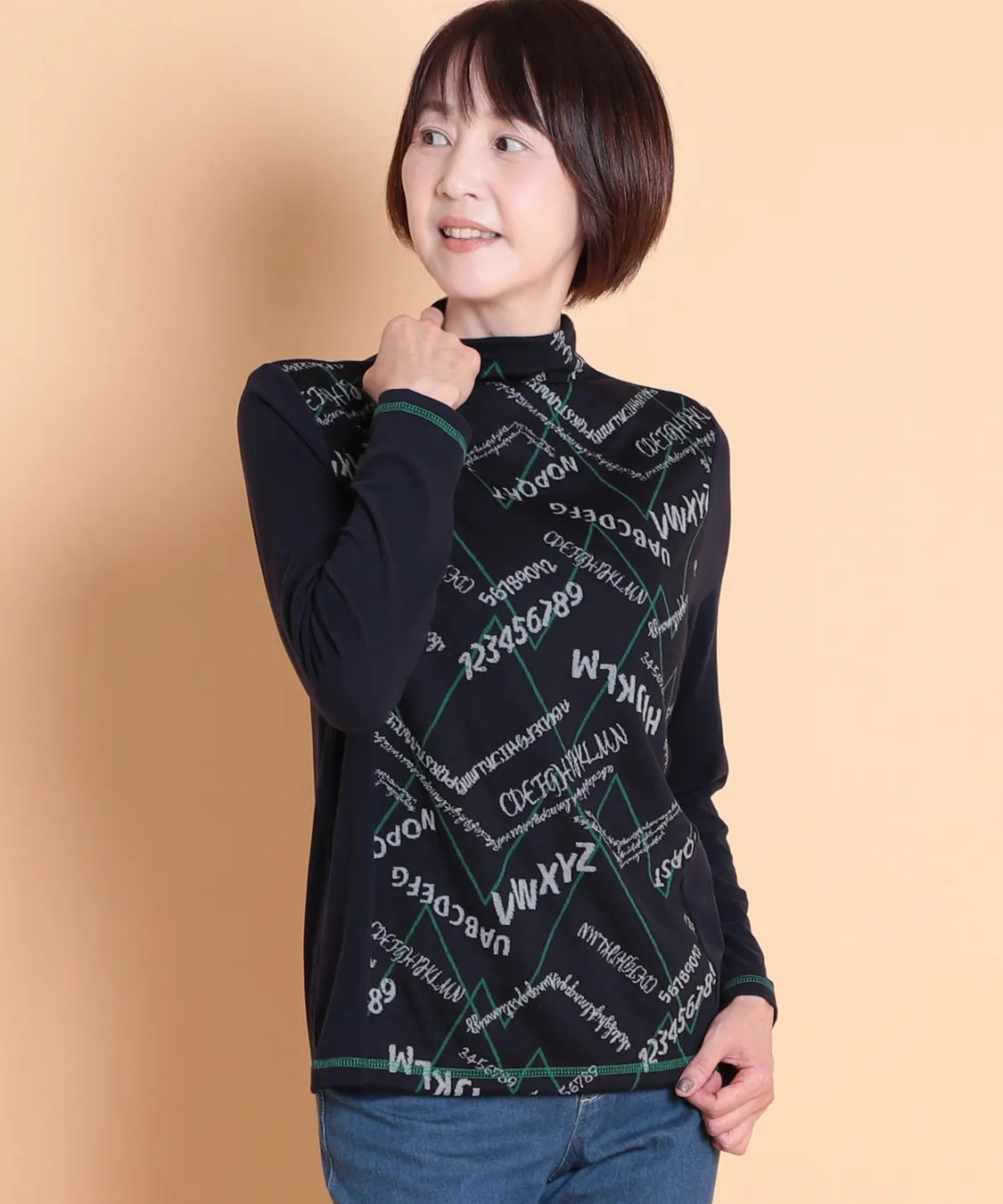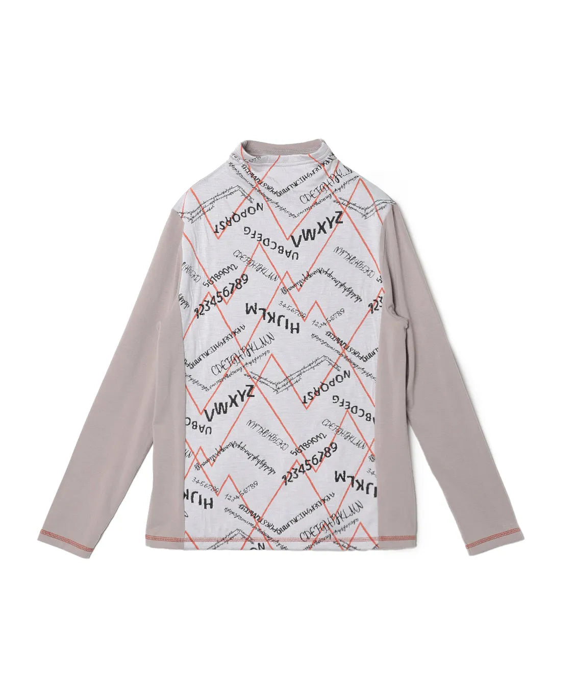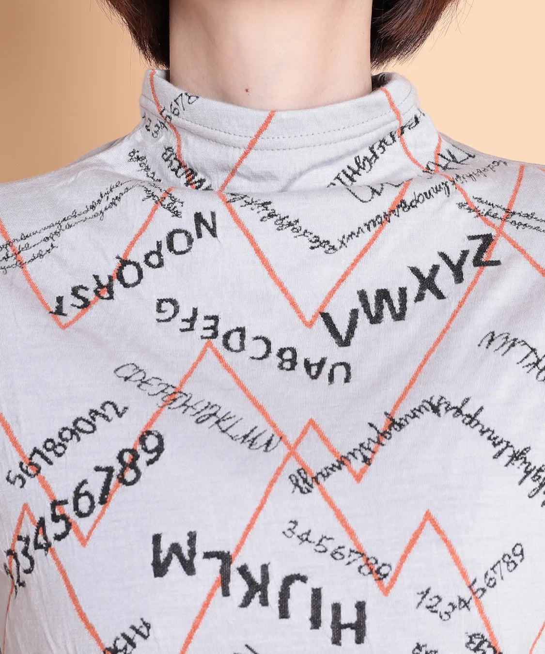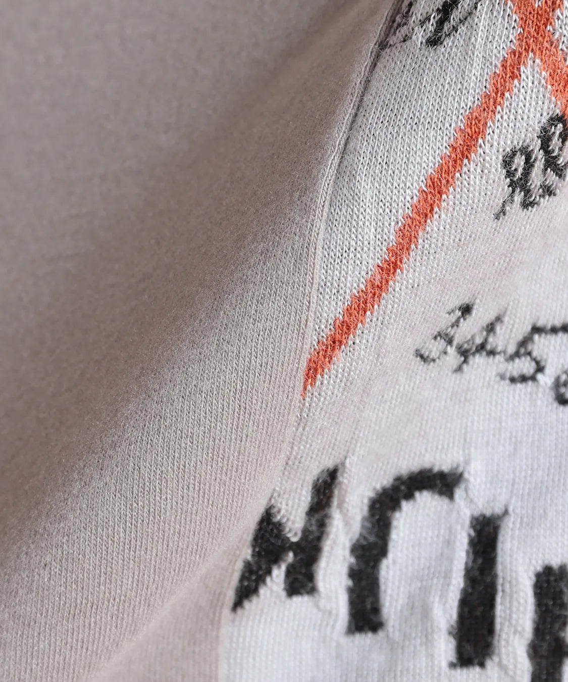 ・ジャカード柄の前身頃で、英字や数字が並ぶグラフィカルなデザイン。一枚でスタイリングが決まる存在感