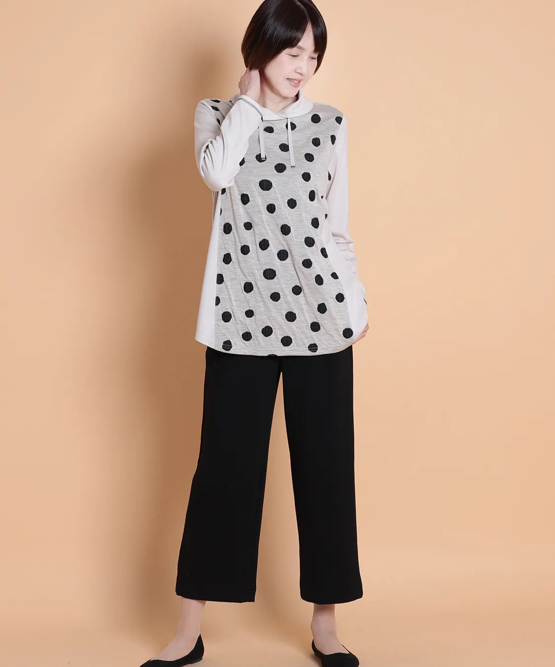 シンプルなブラックパンツと合わせれば、ドット柄が引き立つスタイリッシュなスタイルに。