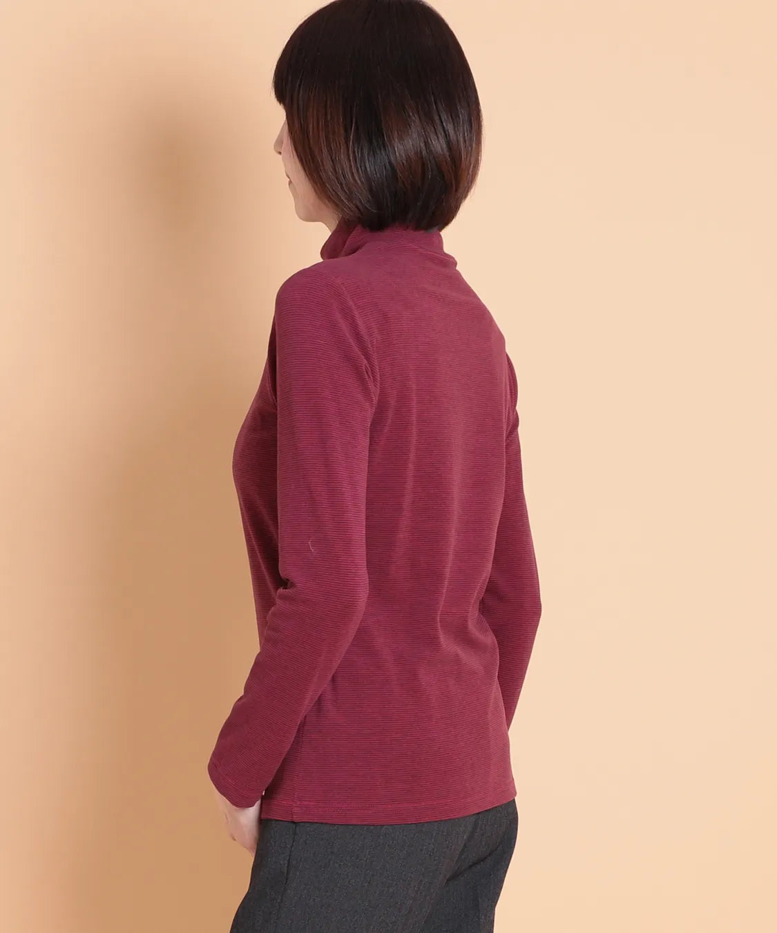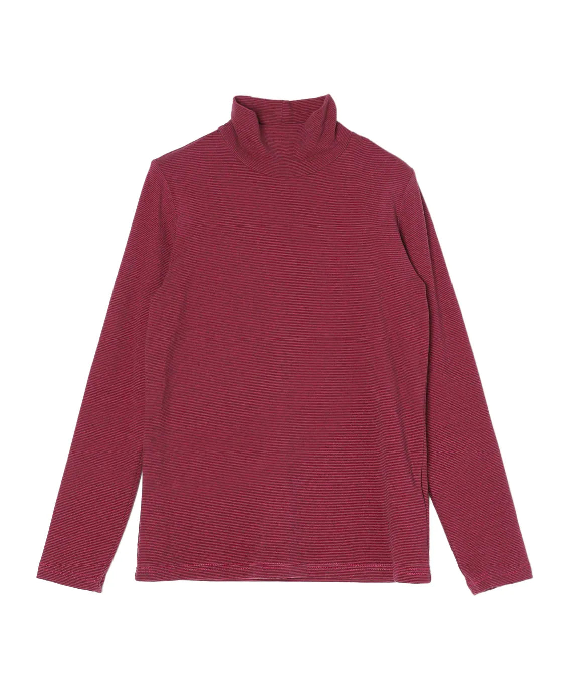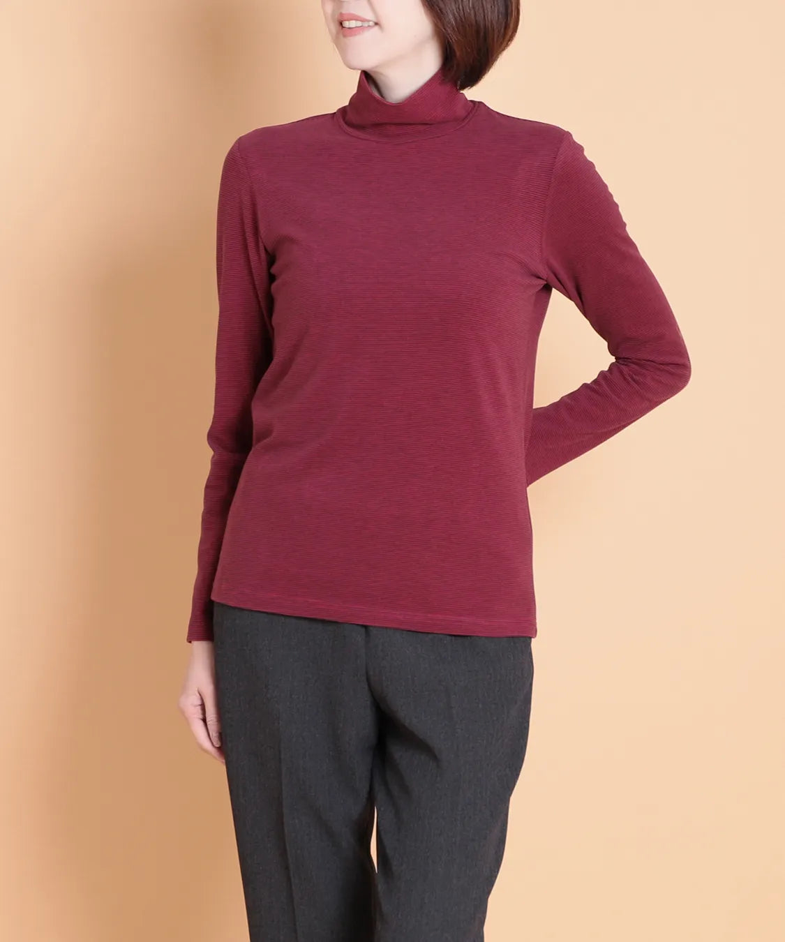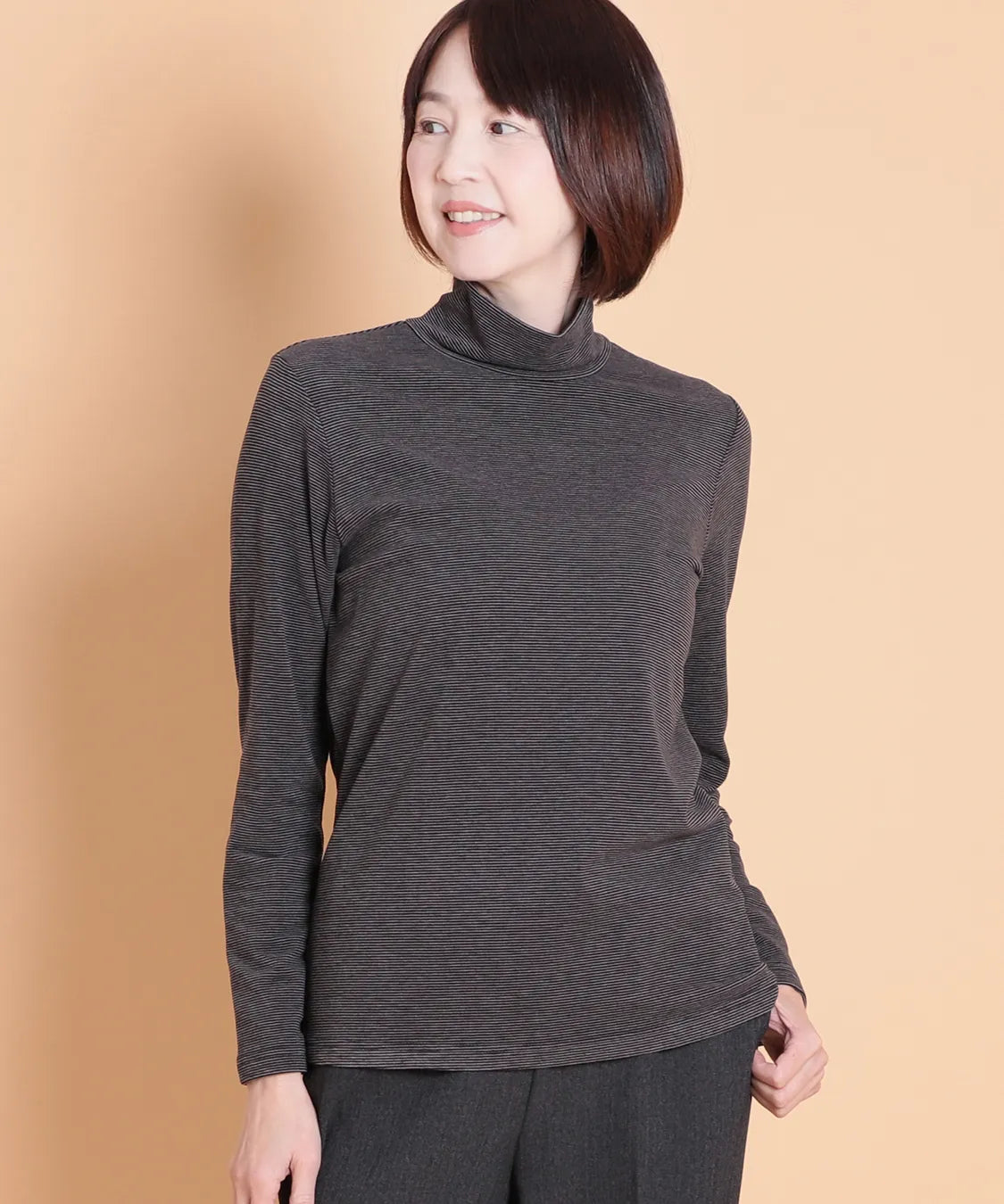 しなやかで肌ざわりの良い天竺素材を使用した、細ボーダー柄のタートルネックカットソー。