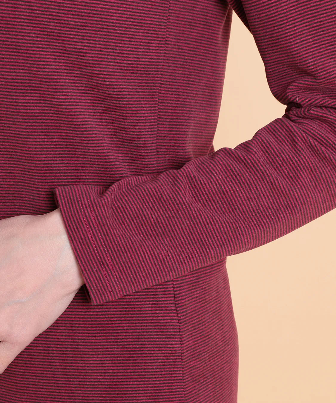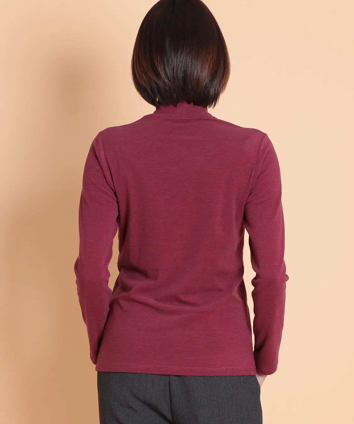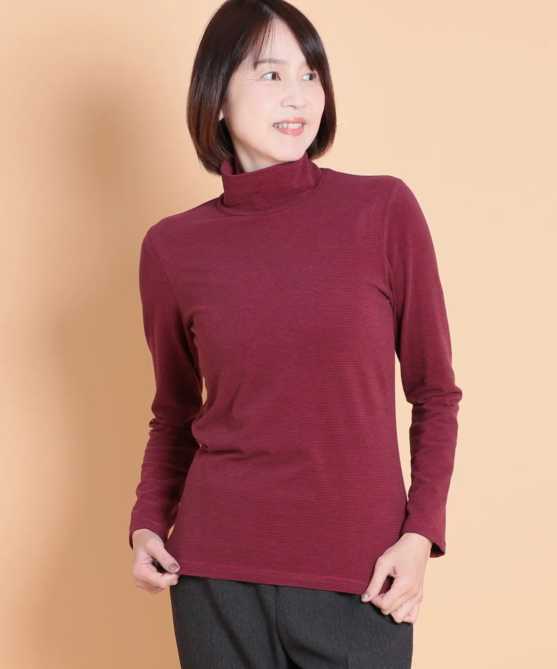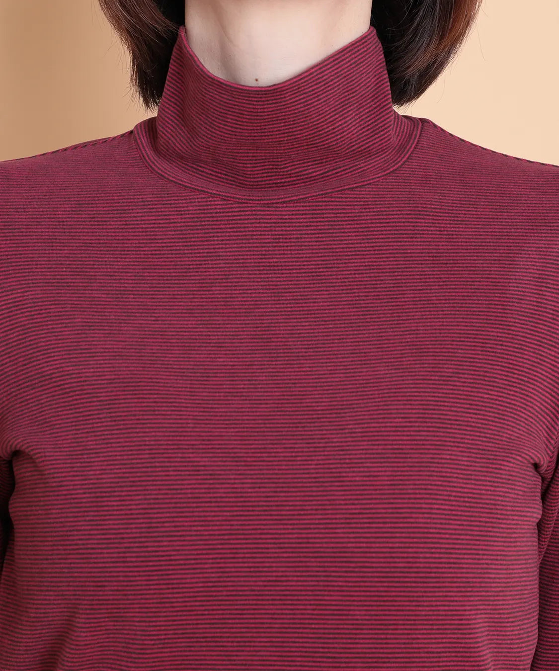 しなやかで肌ざわりの良い天竺素材を使用した、細ボーダー柄のタートルネックカットソー。