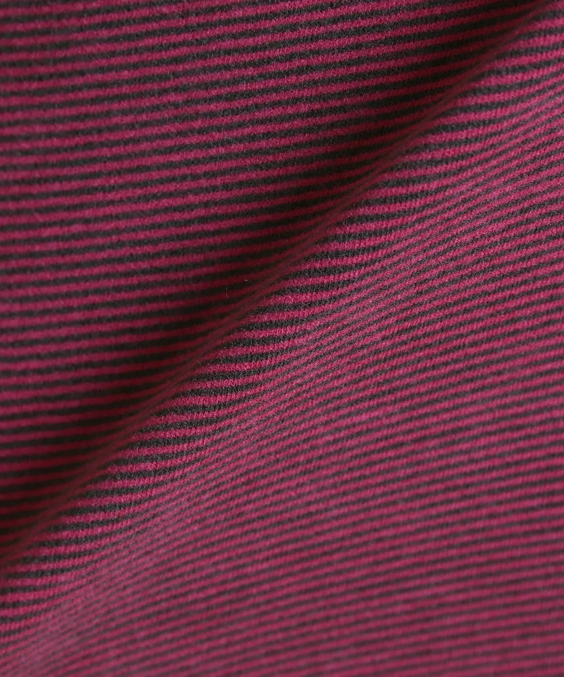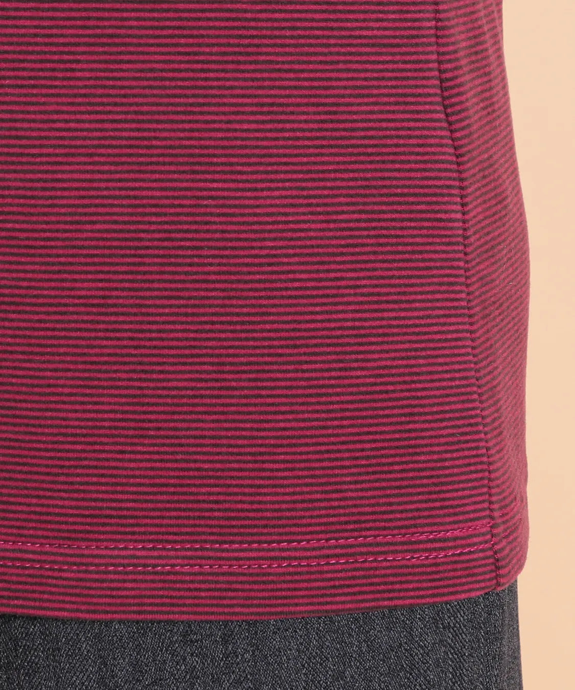 細めのボーダー柄がさりげなく表情を加え、シンプルながらも上品な印象。ジャケットやニット、ワンピースとの重ね着にも相性抜群です。