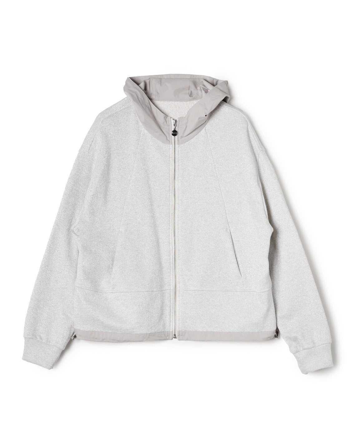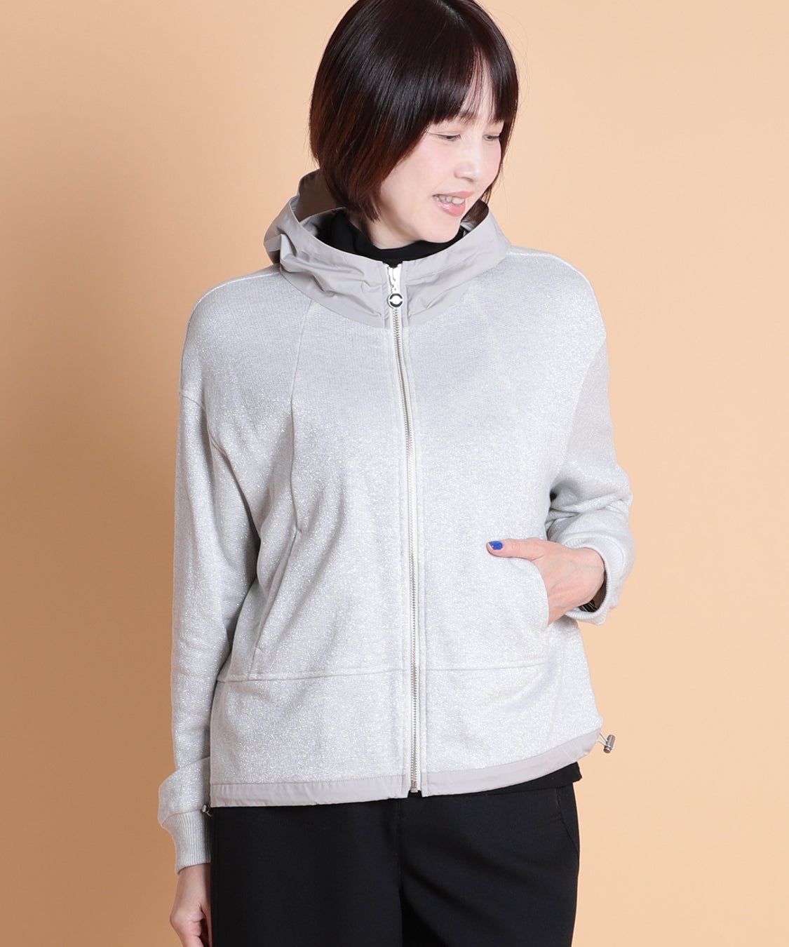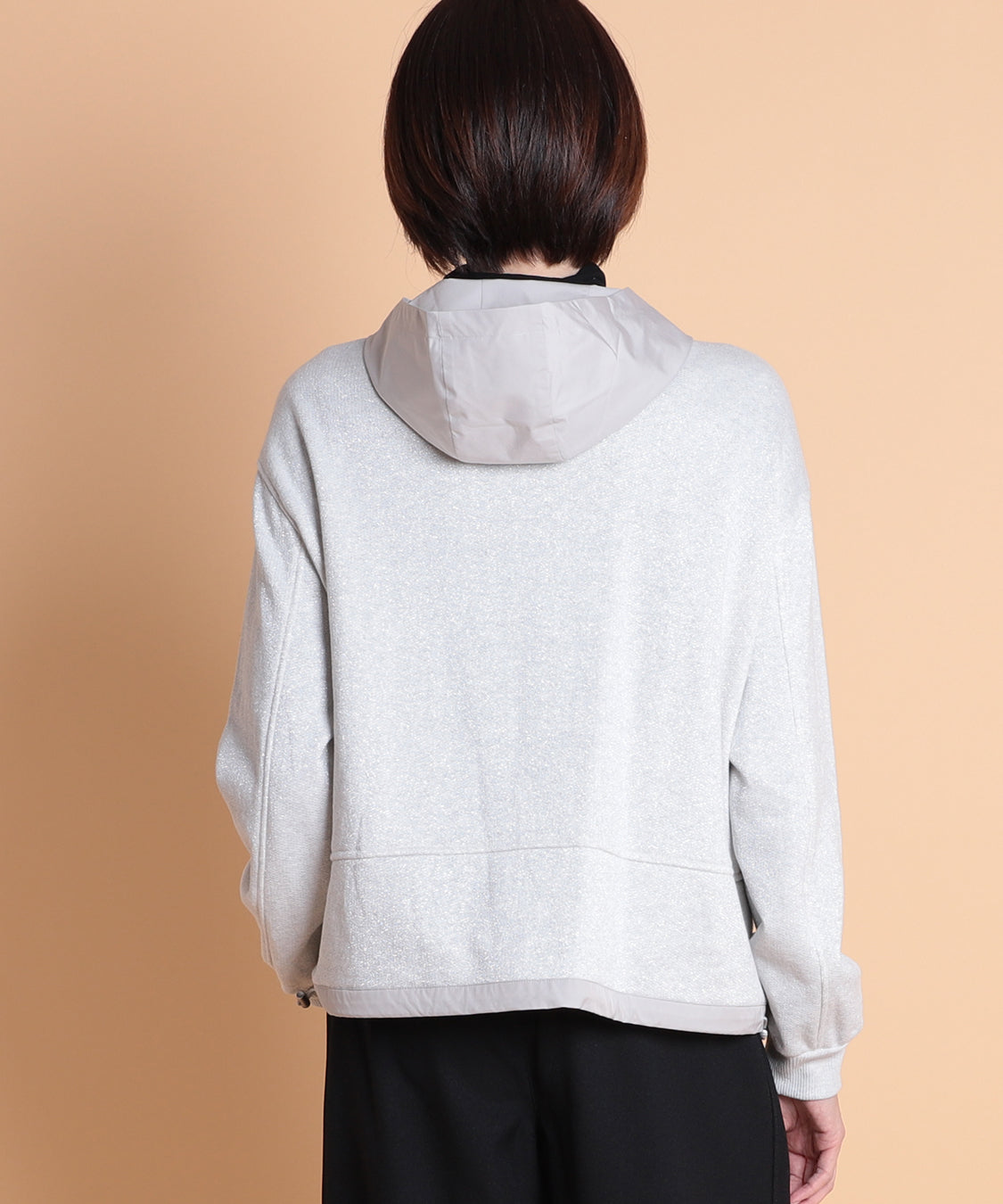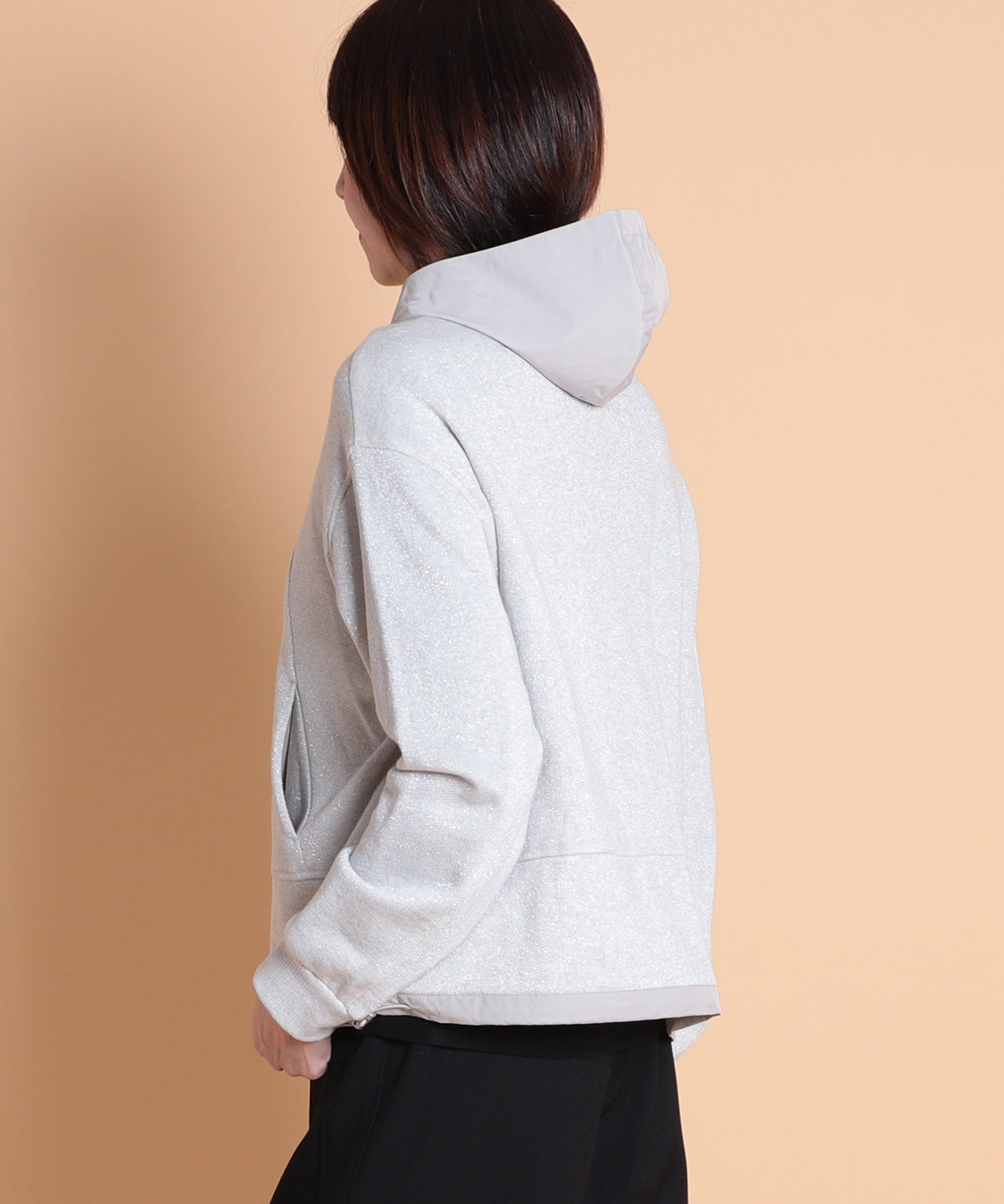 ラメ糸を使用していながらも裏面に響かないのでチクチク感を感じにくいのが嬉しいポイント。フードと裾部分は異素材で切り替え、メリハリをつけています。ボリューム控えめでコートインもしやすく、シーズンレスに着回しが出来る汎用性の高いアイテムです