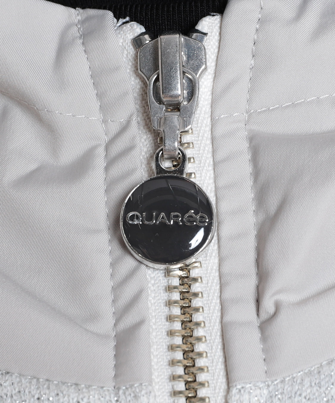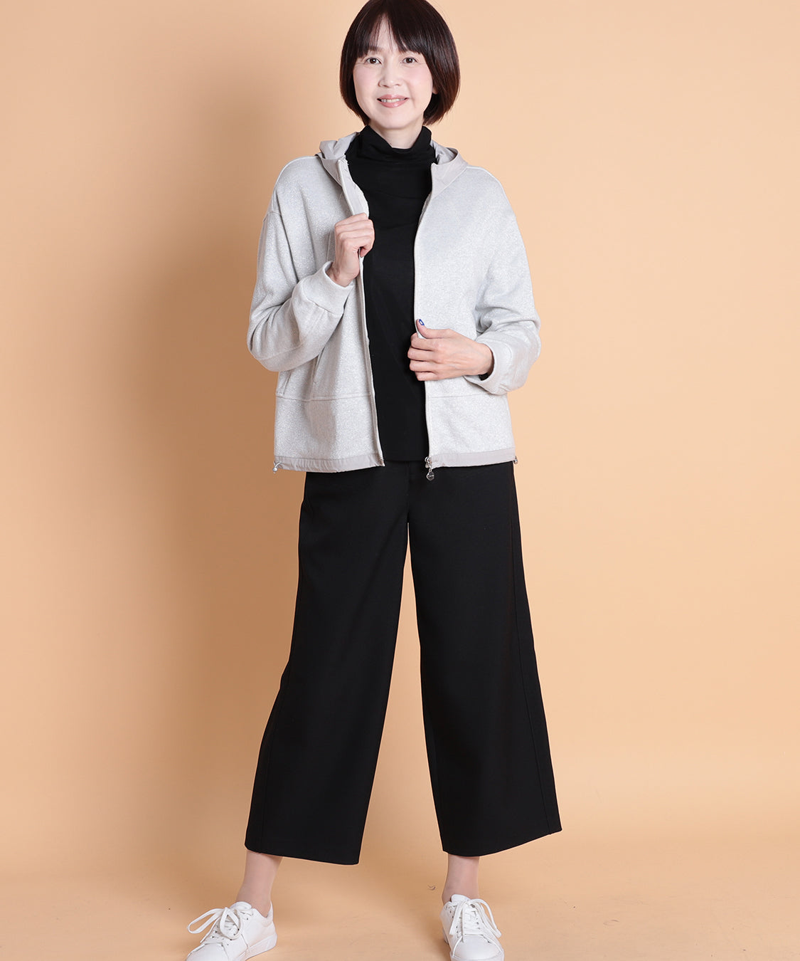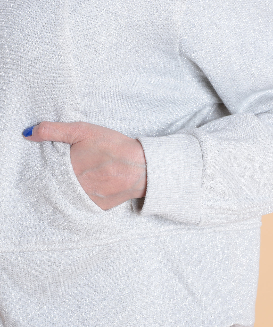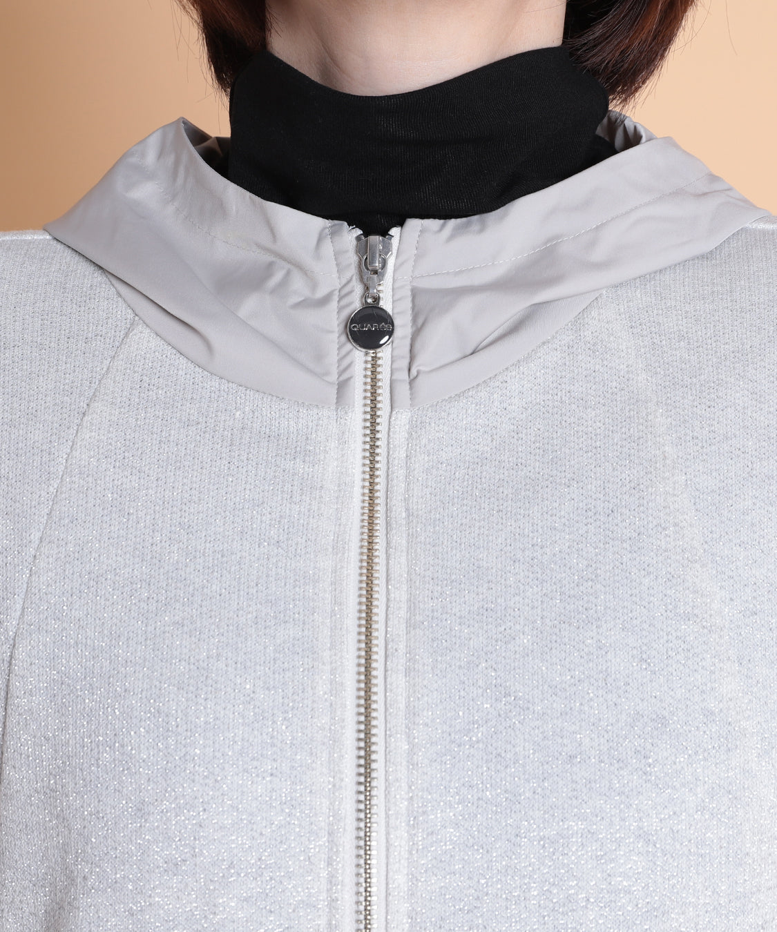 ラメ糸を使用していながらも裏面に響かないのでチクチク感を感じにくいのが嬉しいポイント。フードと裾部分は異素材で切り替え、メリハリをつけています。ボリューム控えめでコートインもしやすく、シーズンレスに着回しが出来る汎用性の高いアイテムです