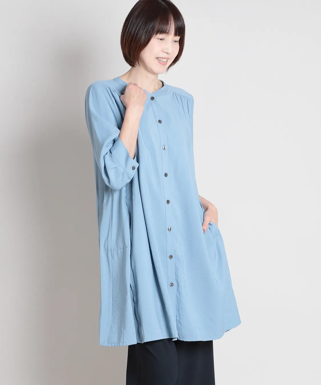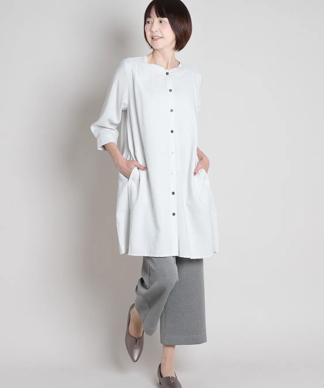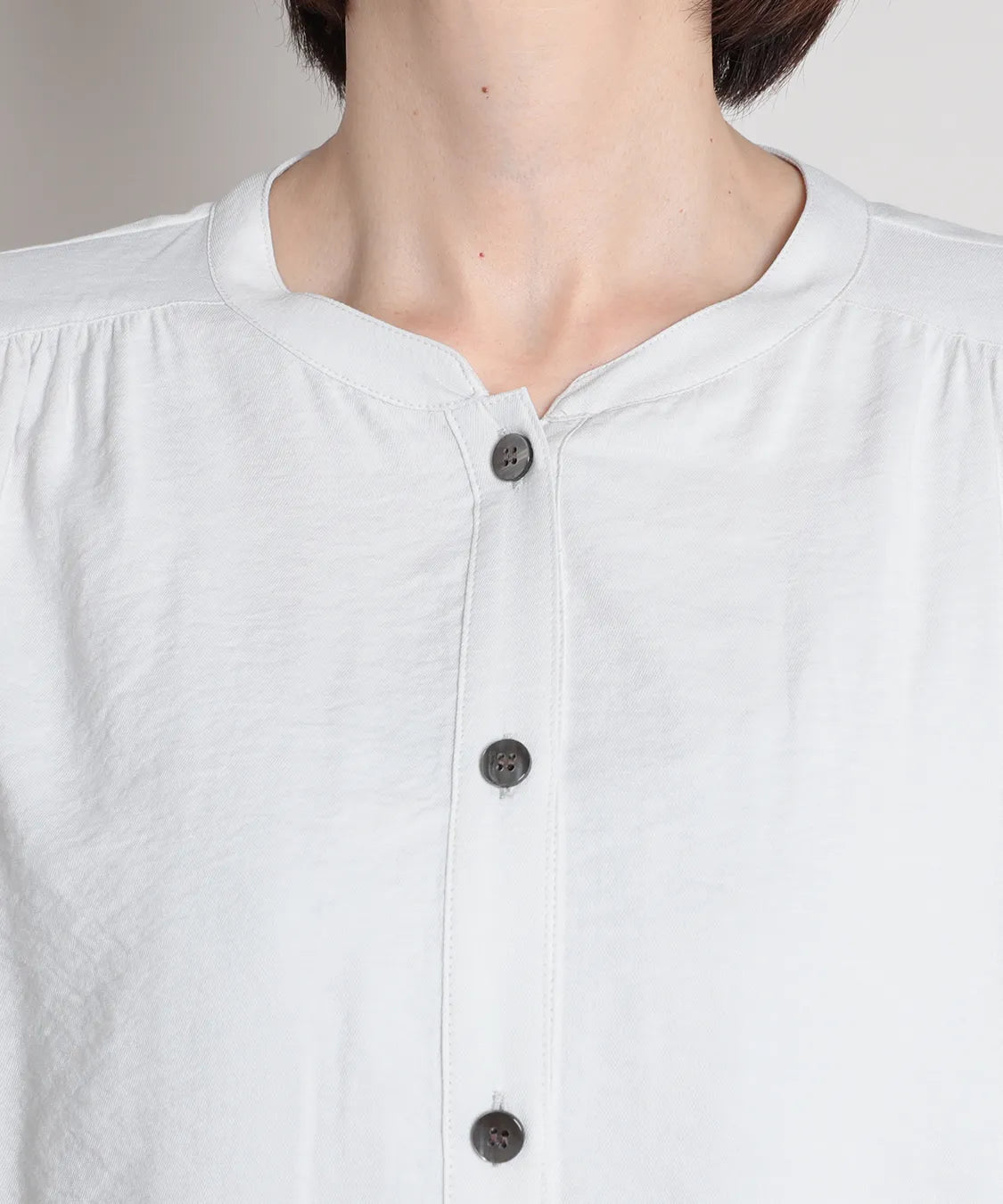 ・バンドカラーですっきりとした首元、スタイリッシュな印象