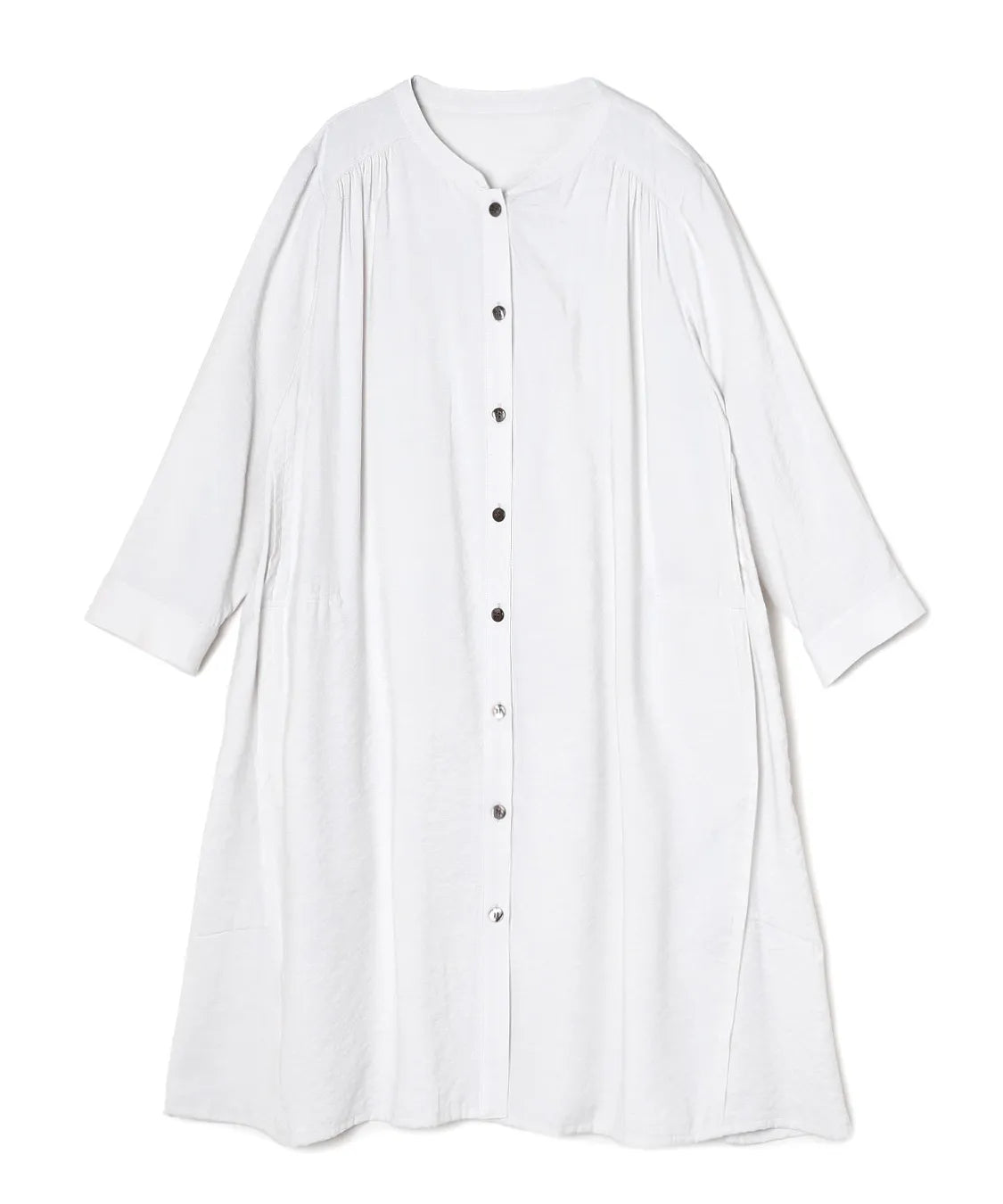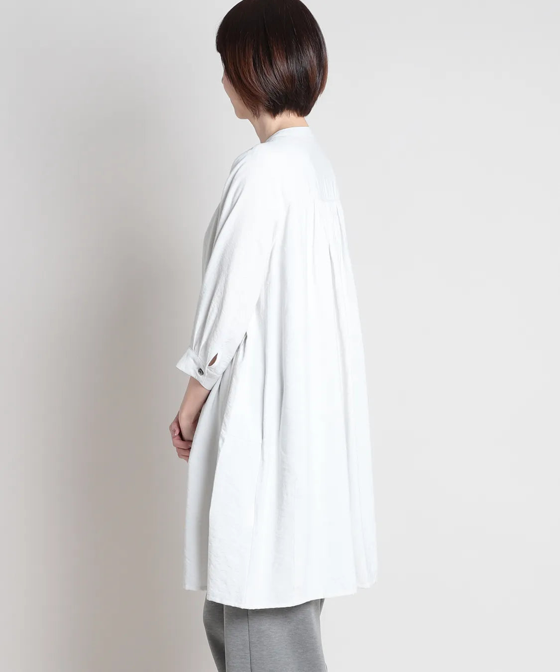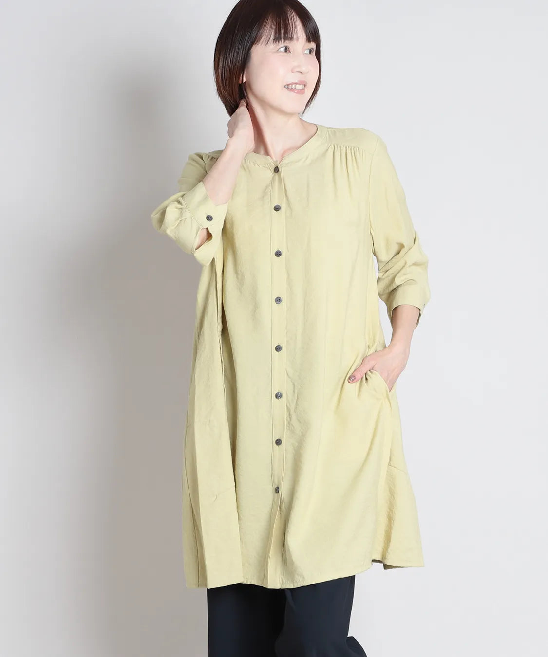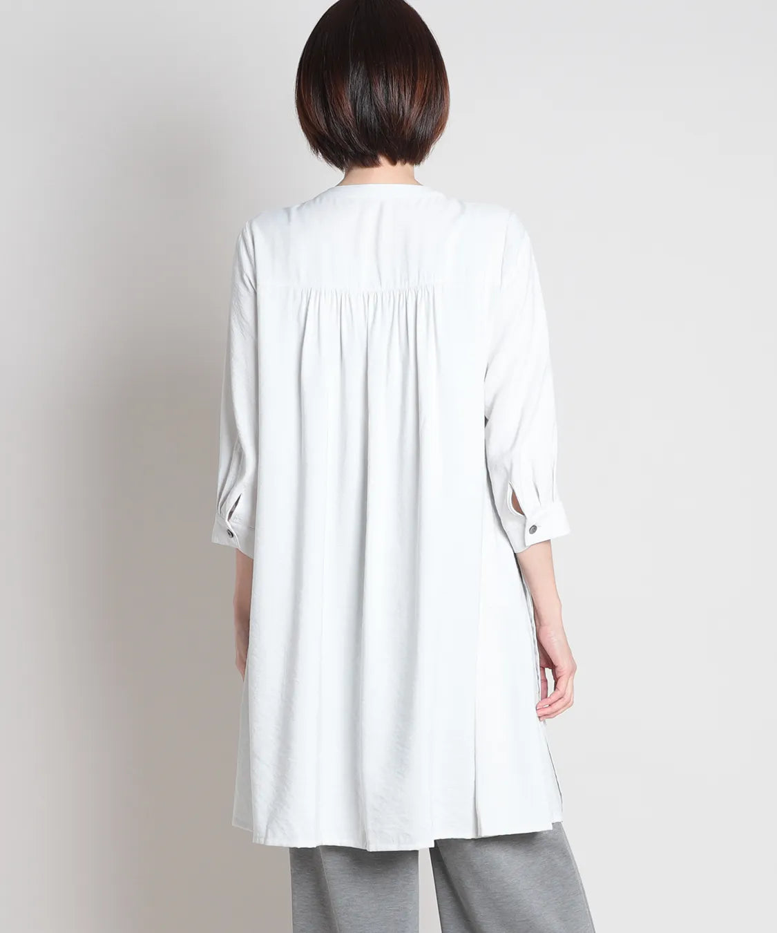 ・バンドカラーですっきりとした首元、スタイリッシュな印象