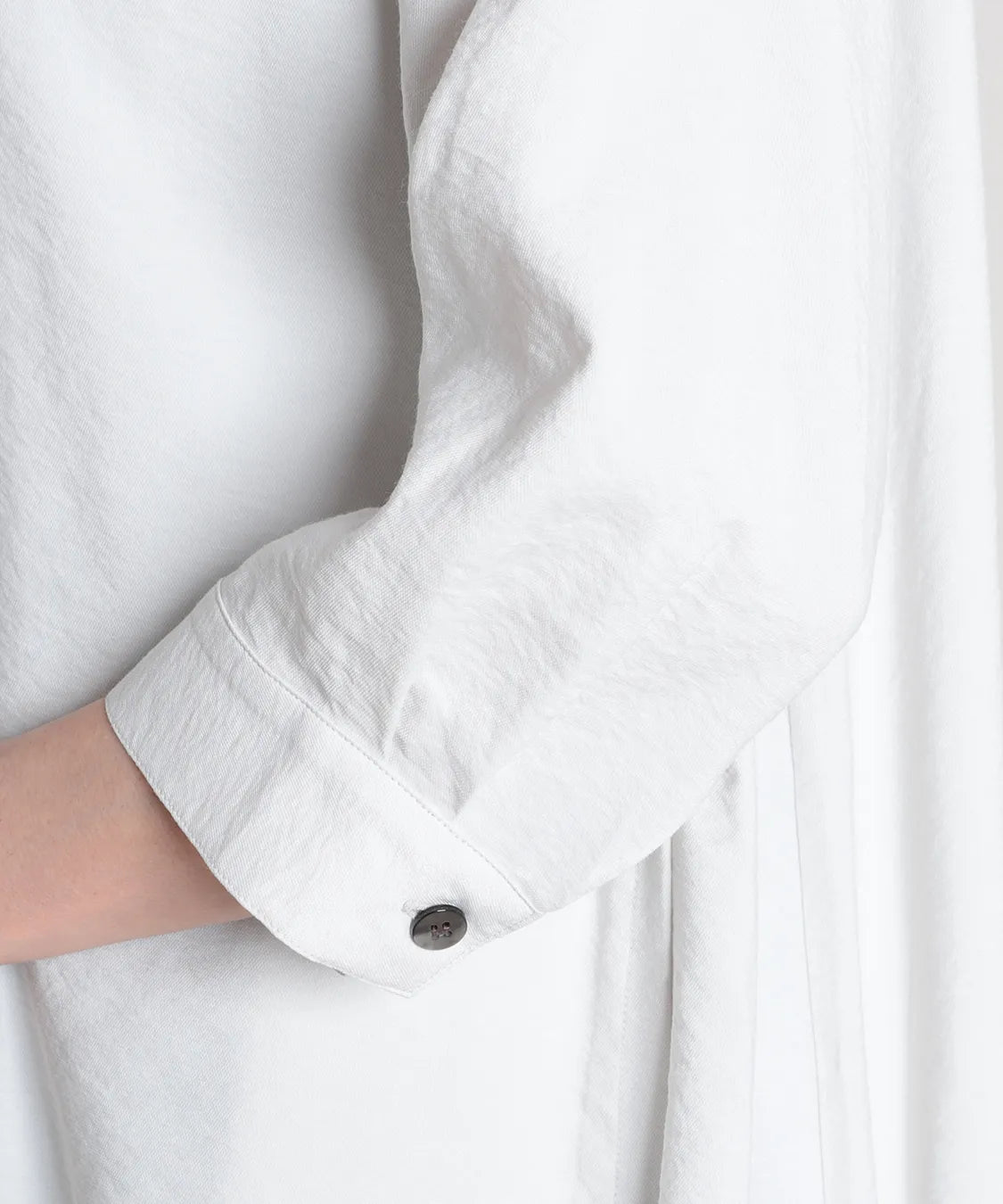 フロントボタンとバンドカラーのディテールがスタイリッシュな印象を与え、