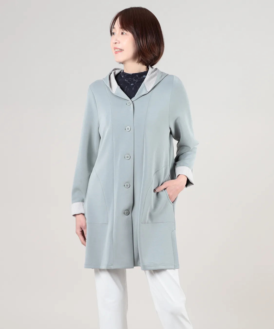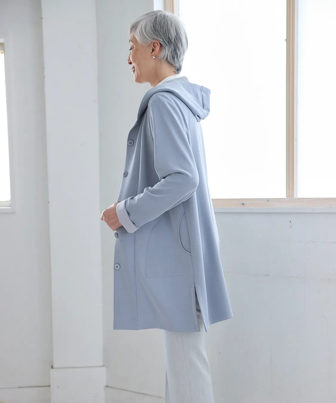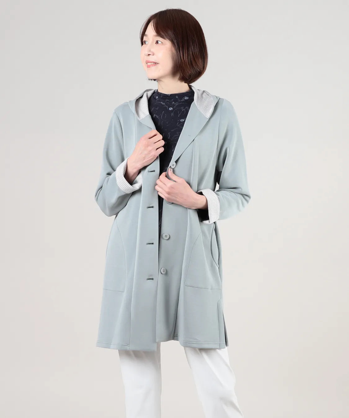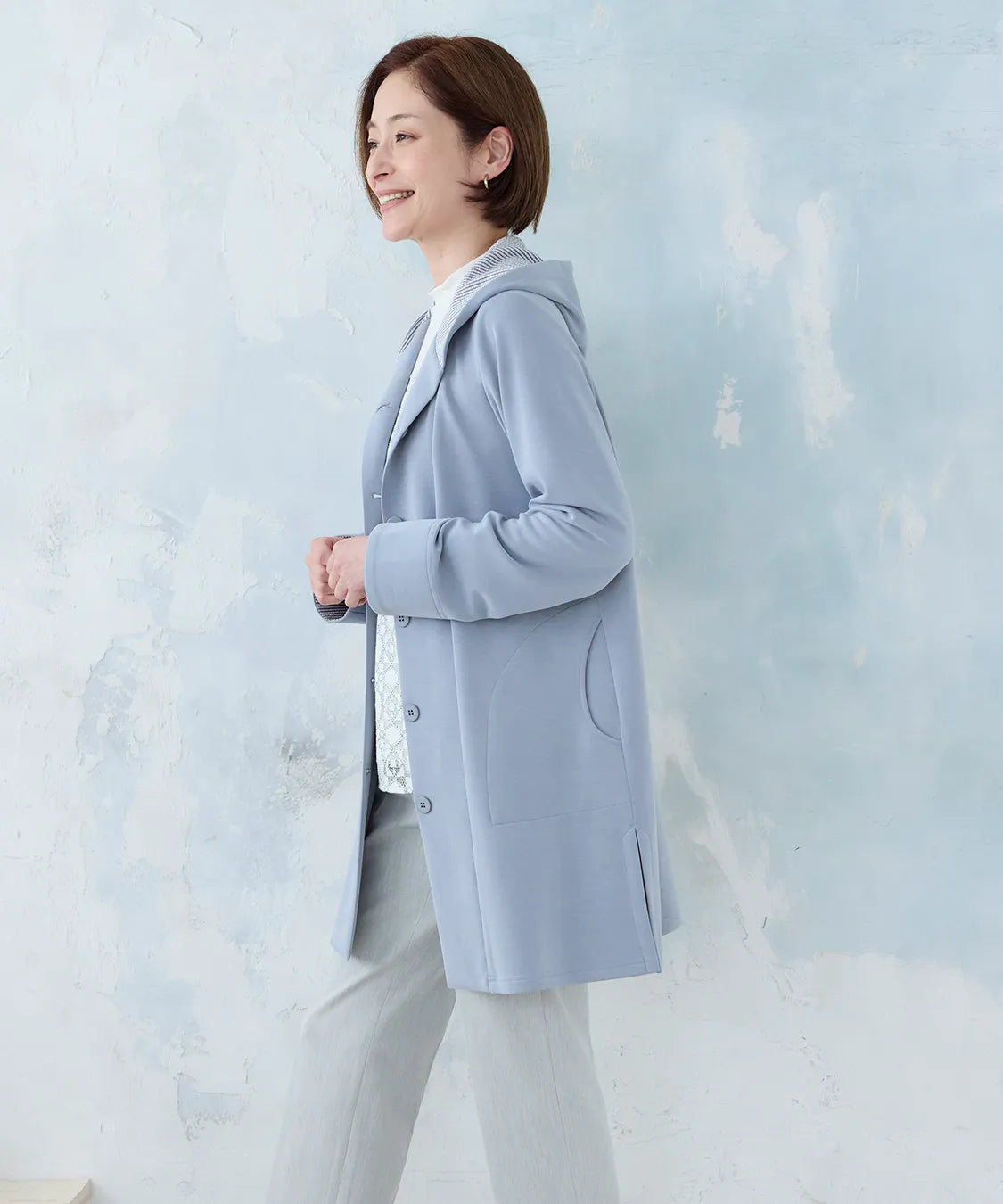 春らしい軽やかな素材と落ち感のあるシルエットが魅力のコート。柔らかなポンチ素材をベースに仕立てられ、体に優しく馴染む着心地で季節の変わり目にも快適です。シンプルながら、立体的な切り替えやフードデザインが大人のコーディネートにアクセントをプラスします。