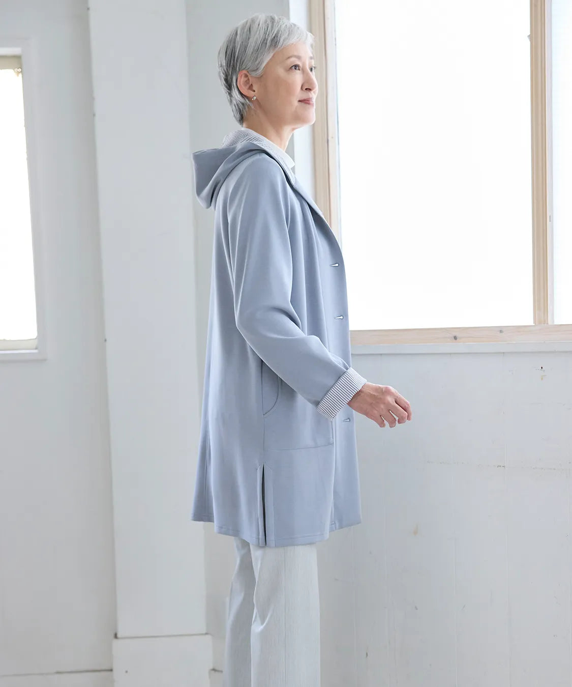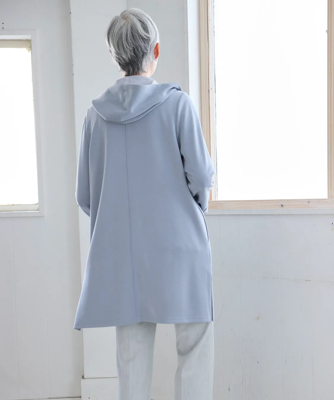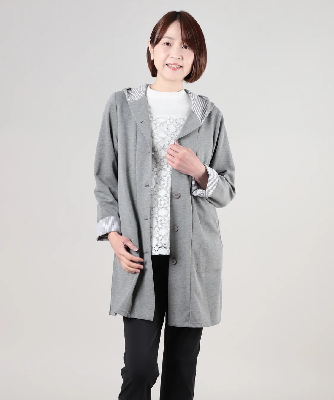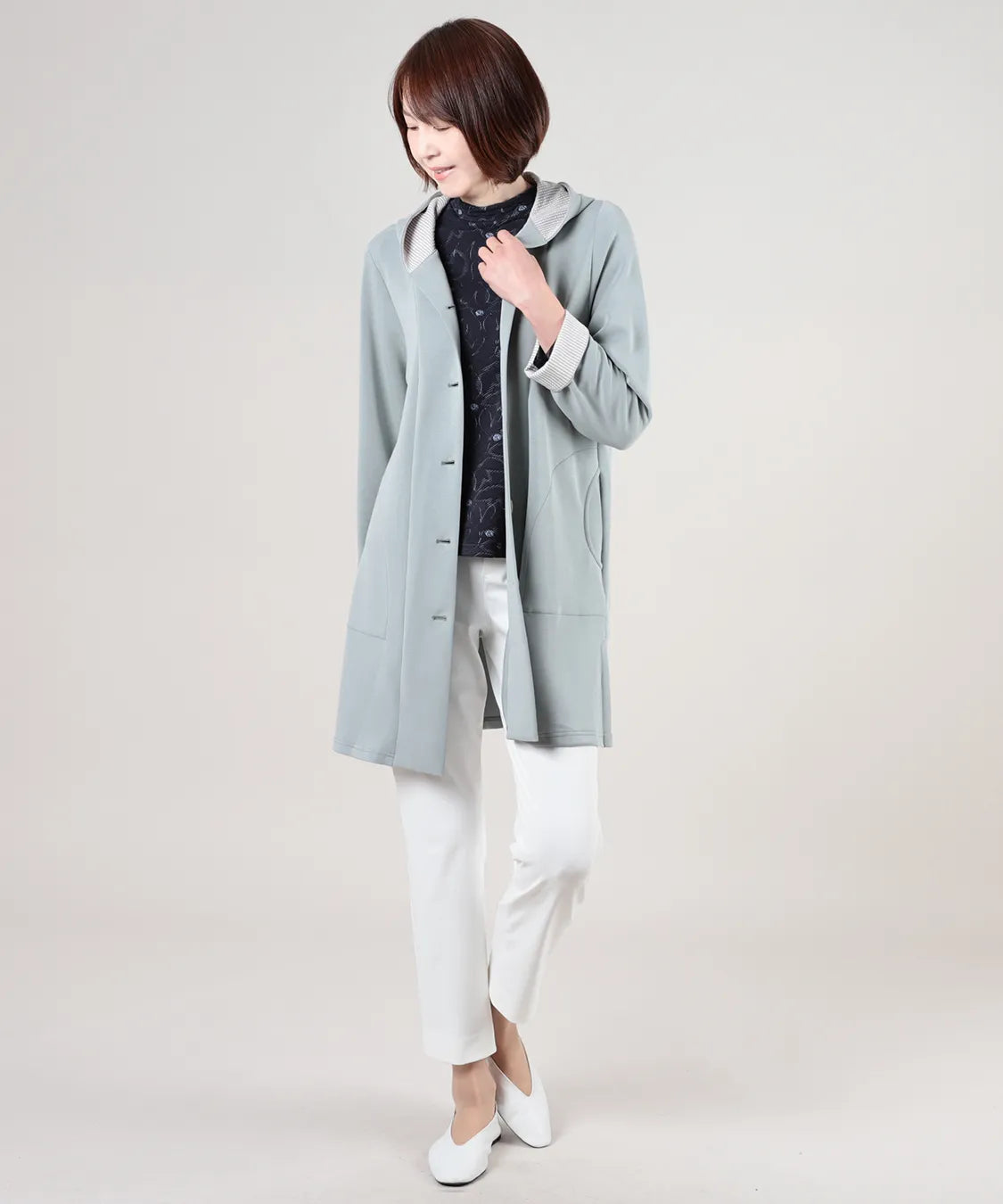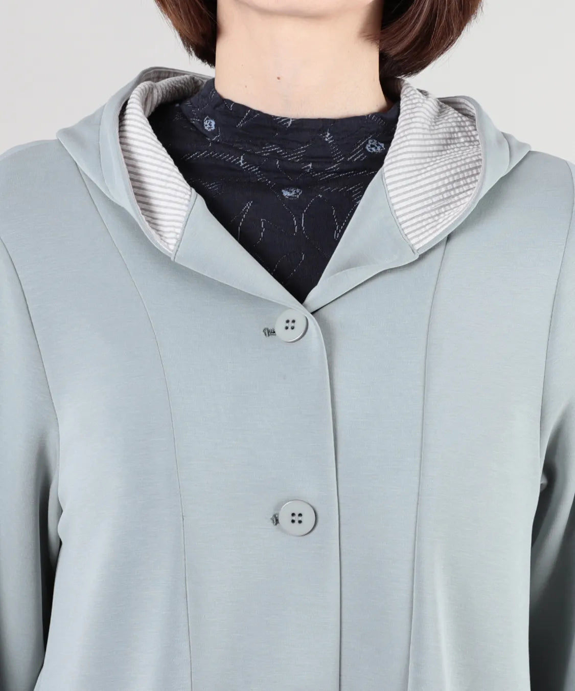 春らしい軽やかな素材と落ち感のあるシルエットが魅力のコート。柔らかなポンチ素材をベースに仕立てられ、体に優しく馴染む着心地で季節の変わり目にも快適です。シンプルながら、立体的な切り替えやフードデザインが大人のコーディネートにアクセントをプラスします。