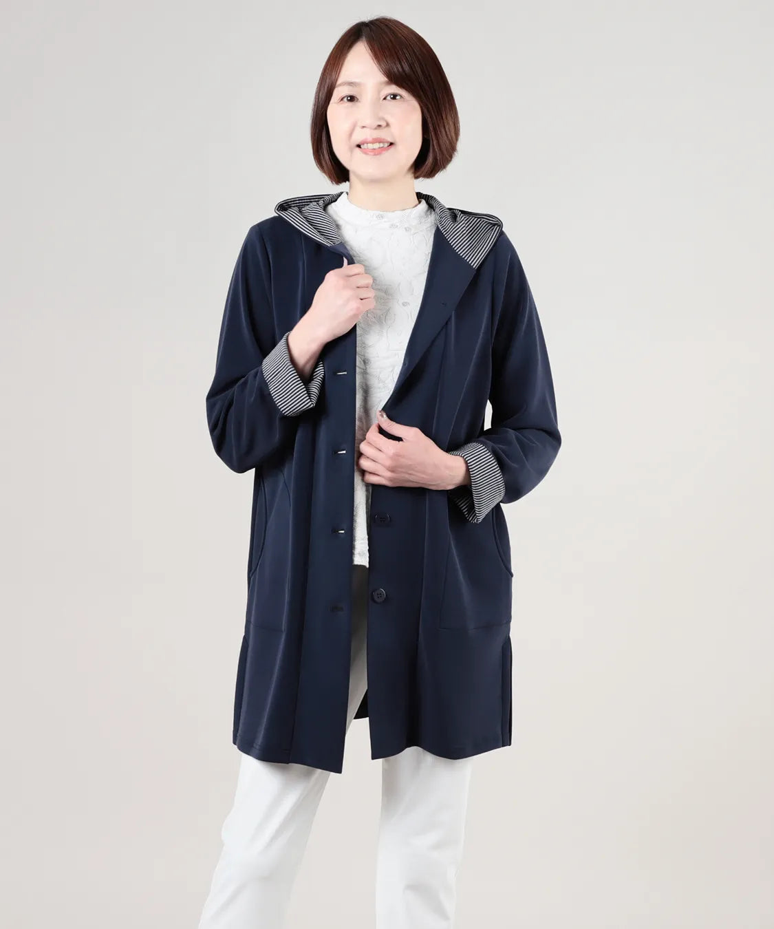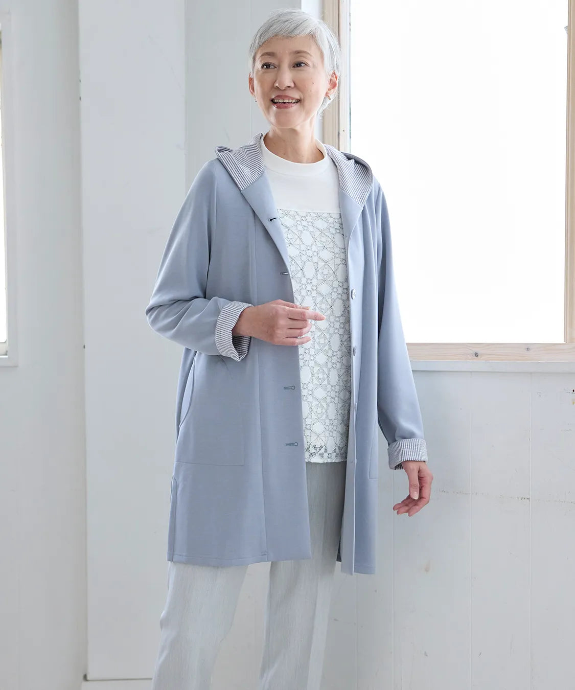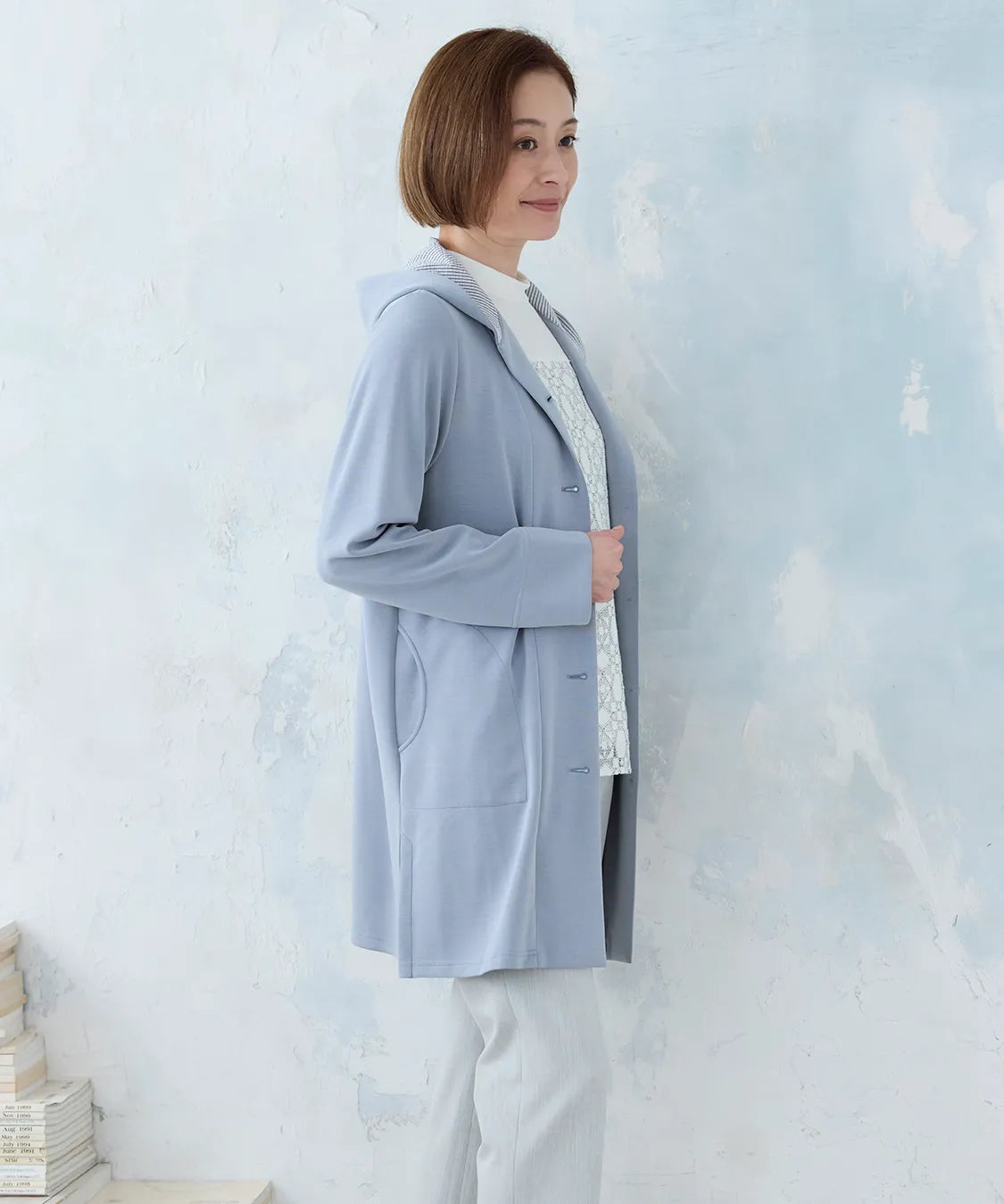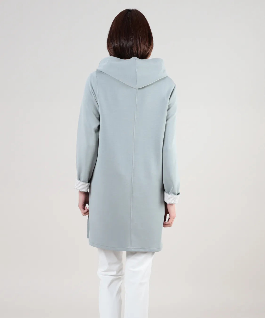 春らしい軽やかな素材と落ち感のあるシルエットが魅力のコート。柔らかなポンチ素材をベースに仕立てられ、体に優しく馴染む着心地で季節の変わり目にも快適です。シンプルながら、立体的な切り替えやフードデザインが大人のコーディネートにアクセントをプラスします。