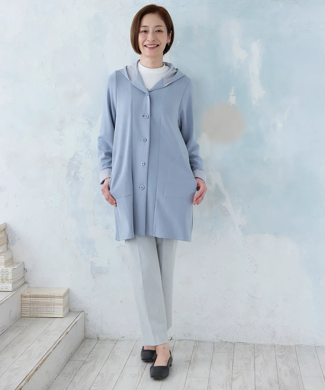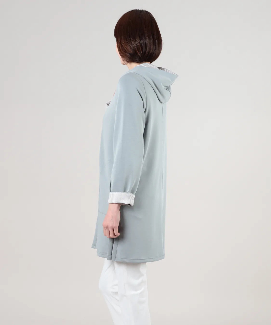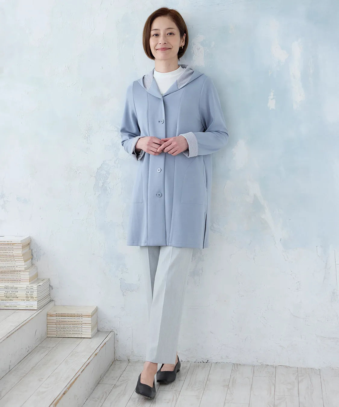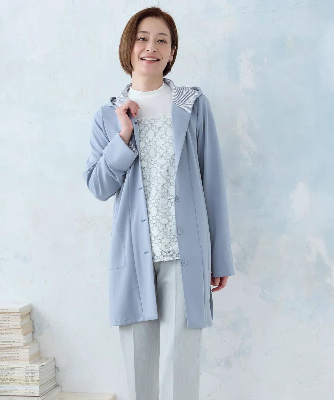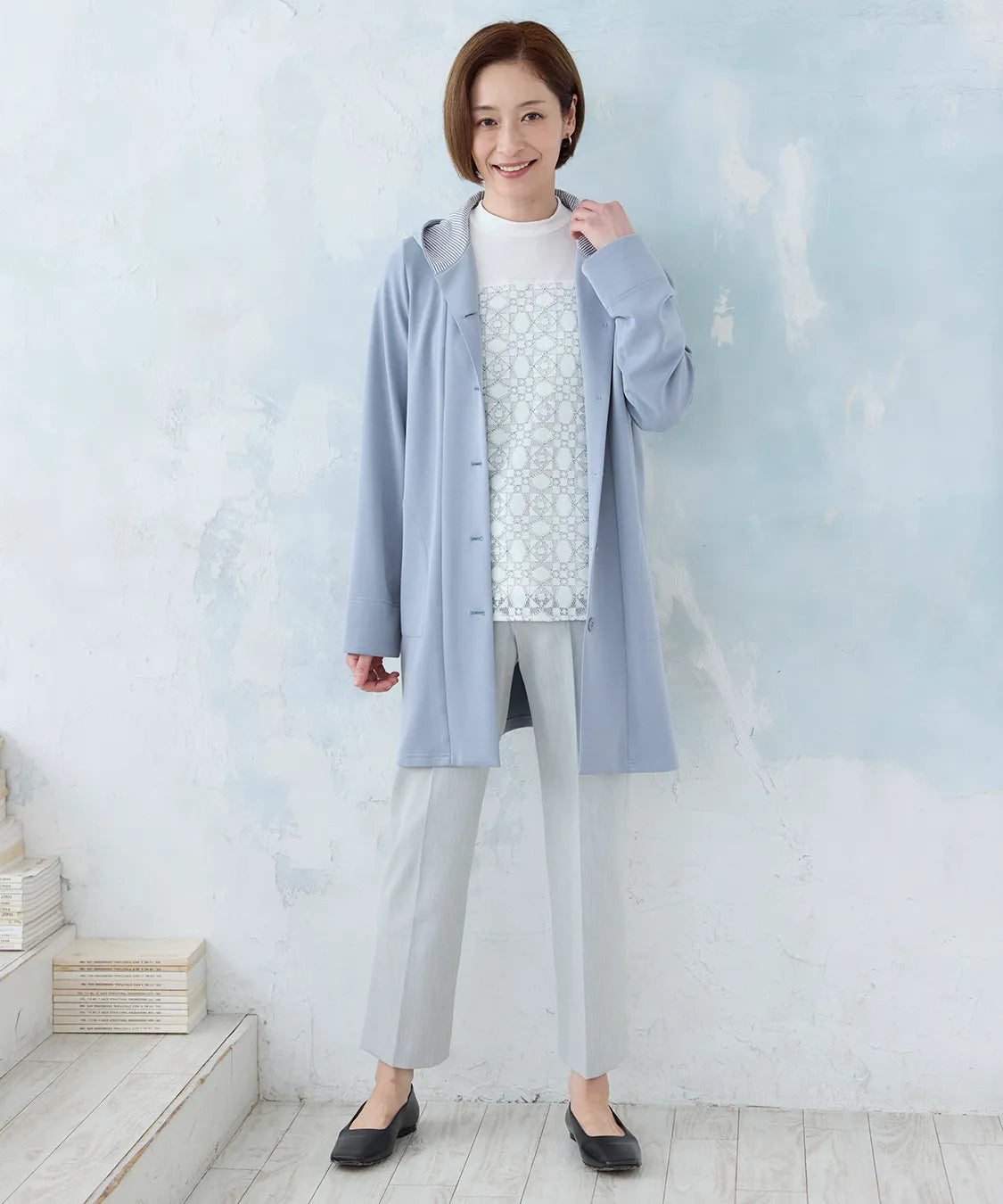 春らしい軽やかな素材と落ち感のあるシルエットが魅力のコート。柔らかなポンチ素材をベースに仕立てられ、体に優しく馴染む着心地で季節の変わり目にも快適です。シンプルながら、立体的な切り替えやフードデザインが大人のコーディネートにアクセントをプラスします。