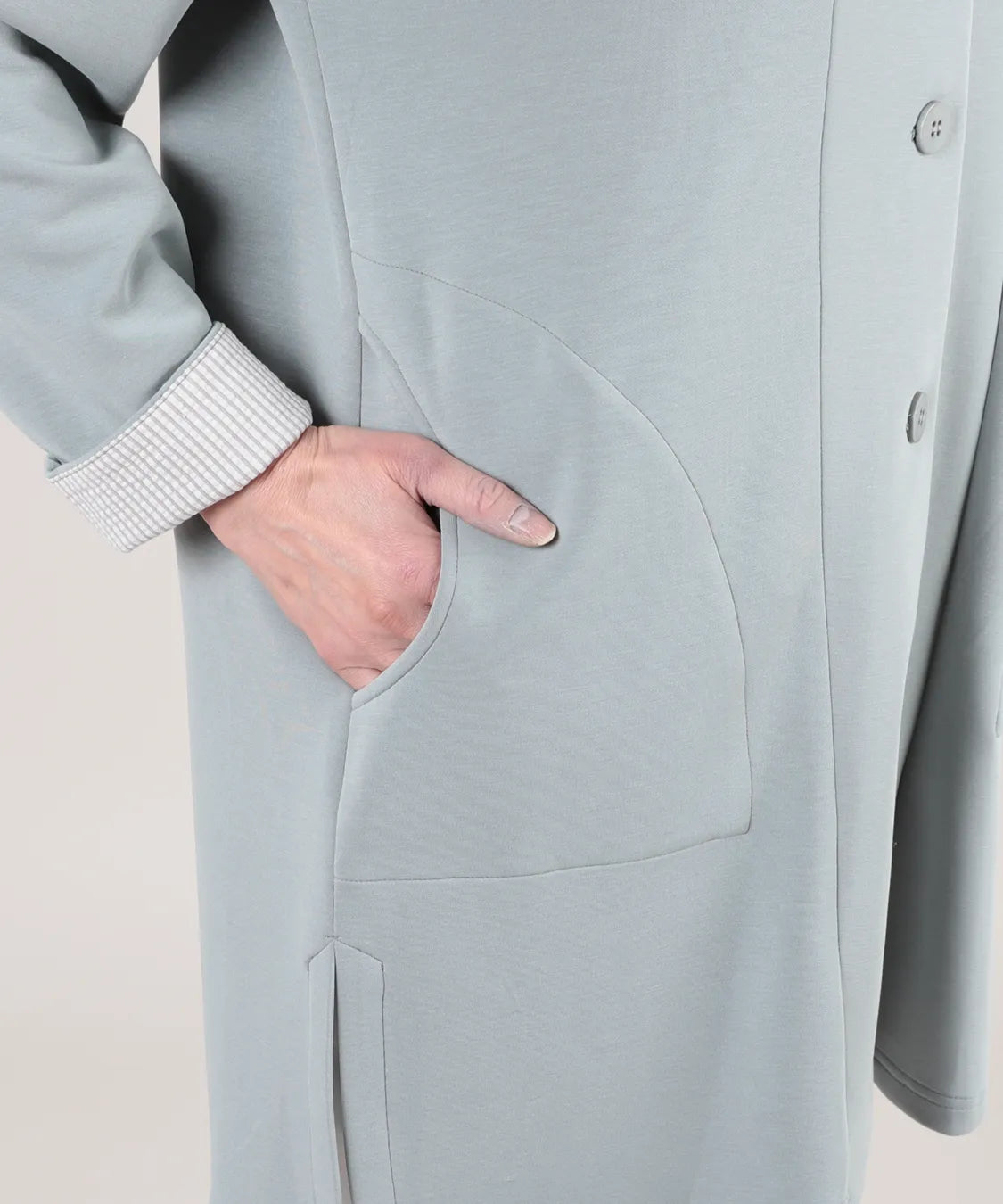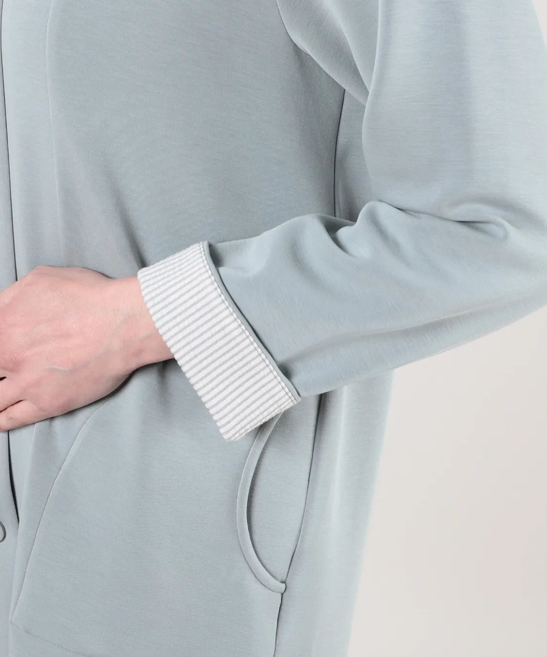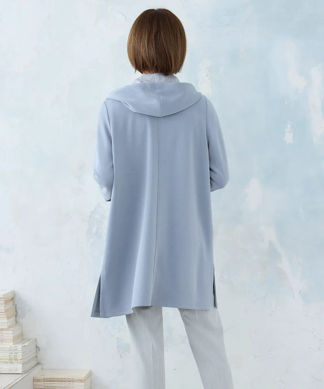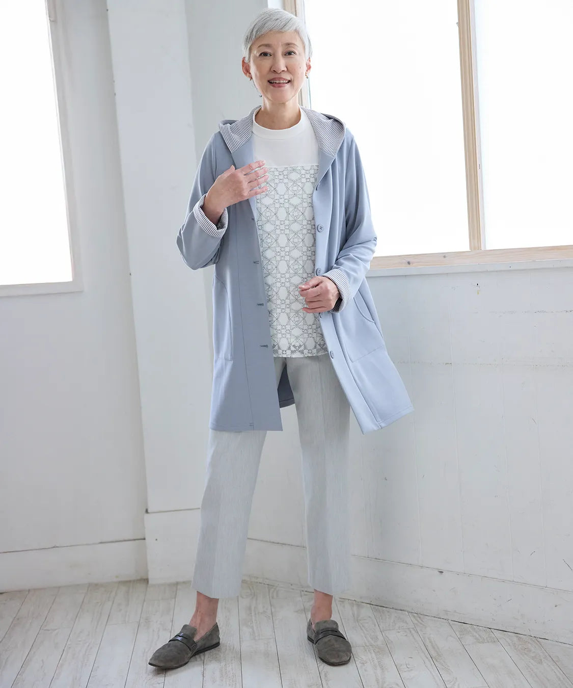 春らしい軽やかな素材と落ち感のあるシルエットが魅力のコート。柔らかなポンチ素材をベースに仕立てられ、体に優しく馴染む着心地で季節の変わり目にも快適です。シンプルながら、立体的な切り替えやフードデザインが大人のコーディネートにアクセントをプラスします。