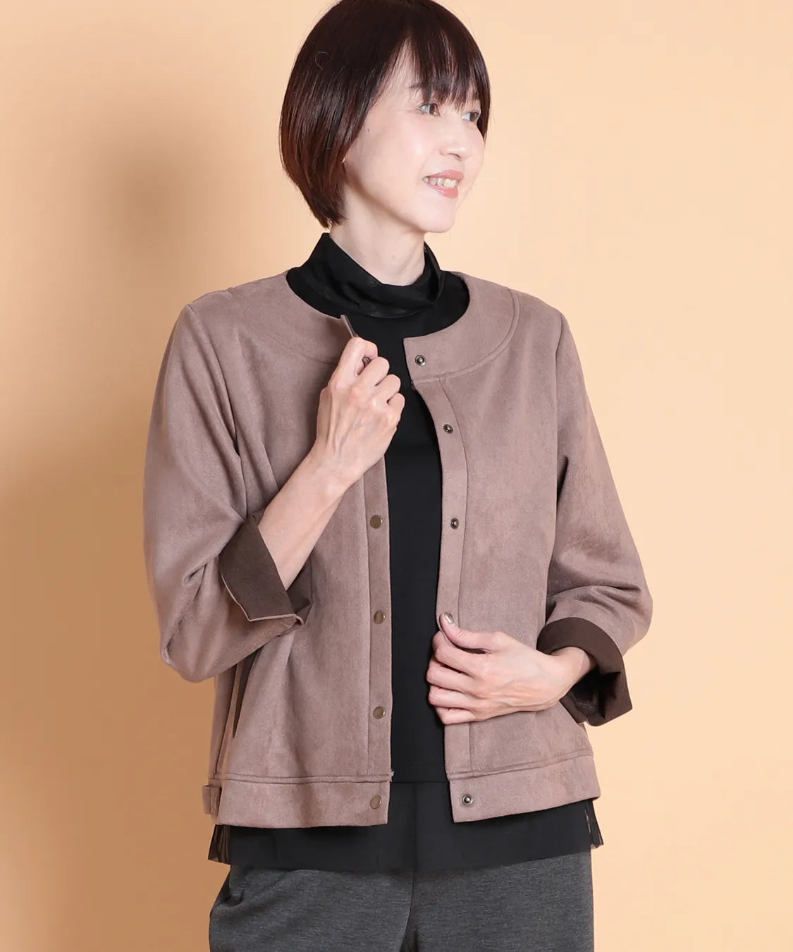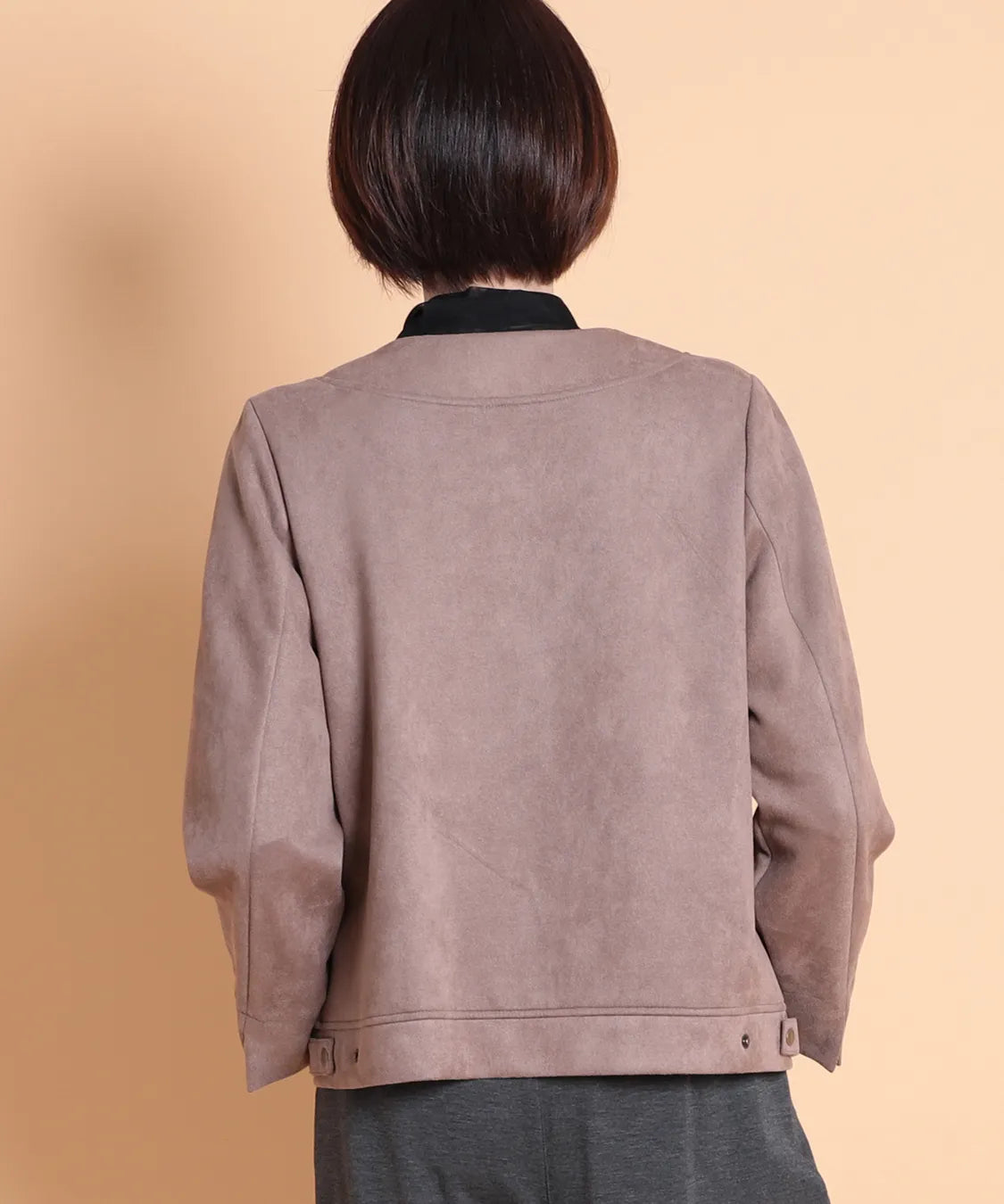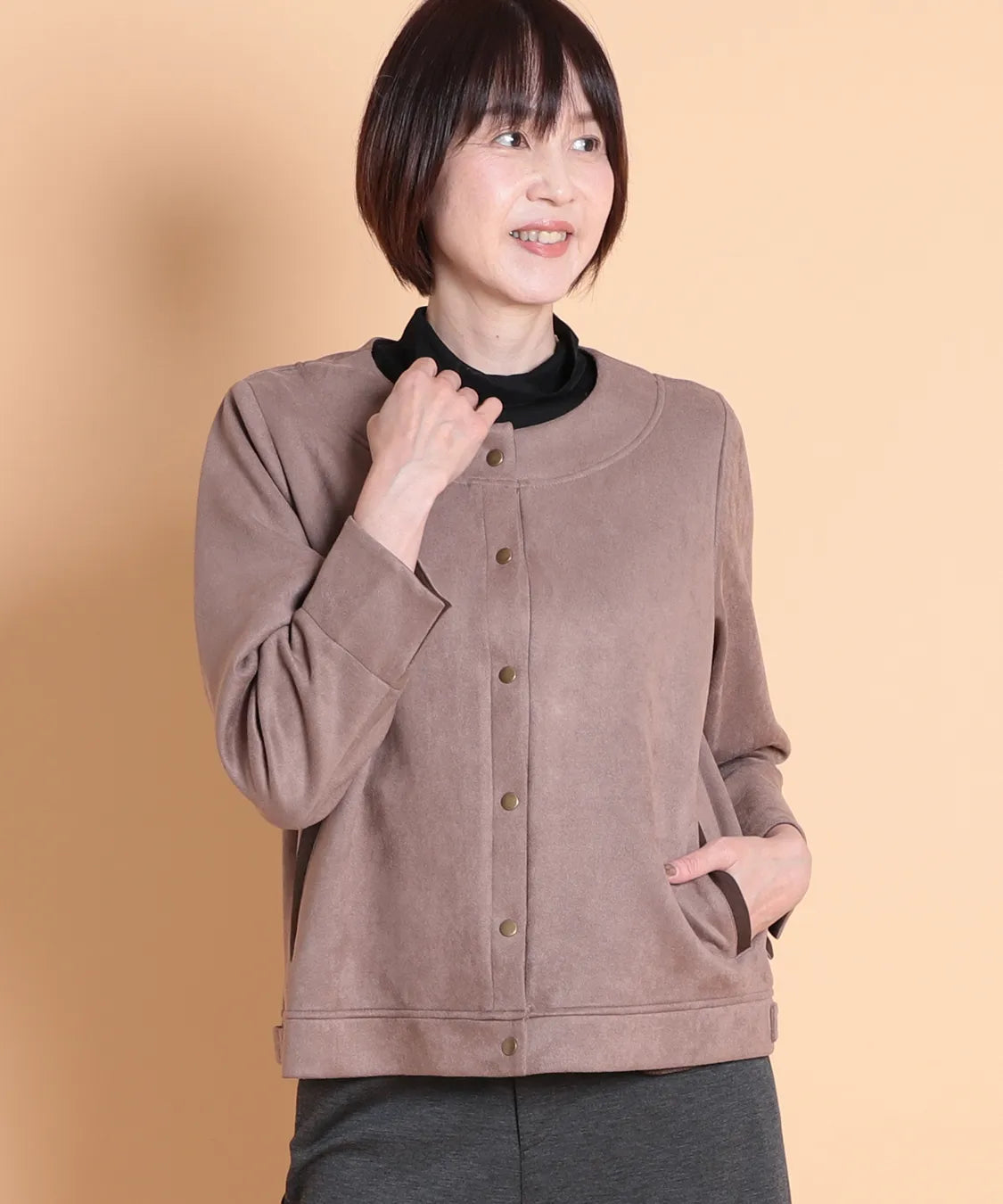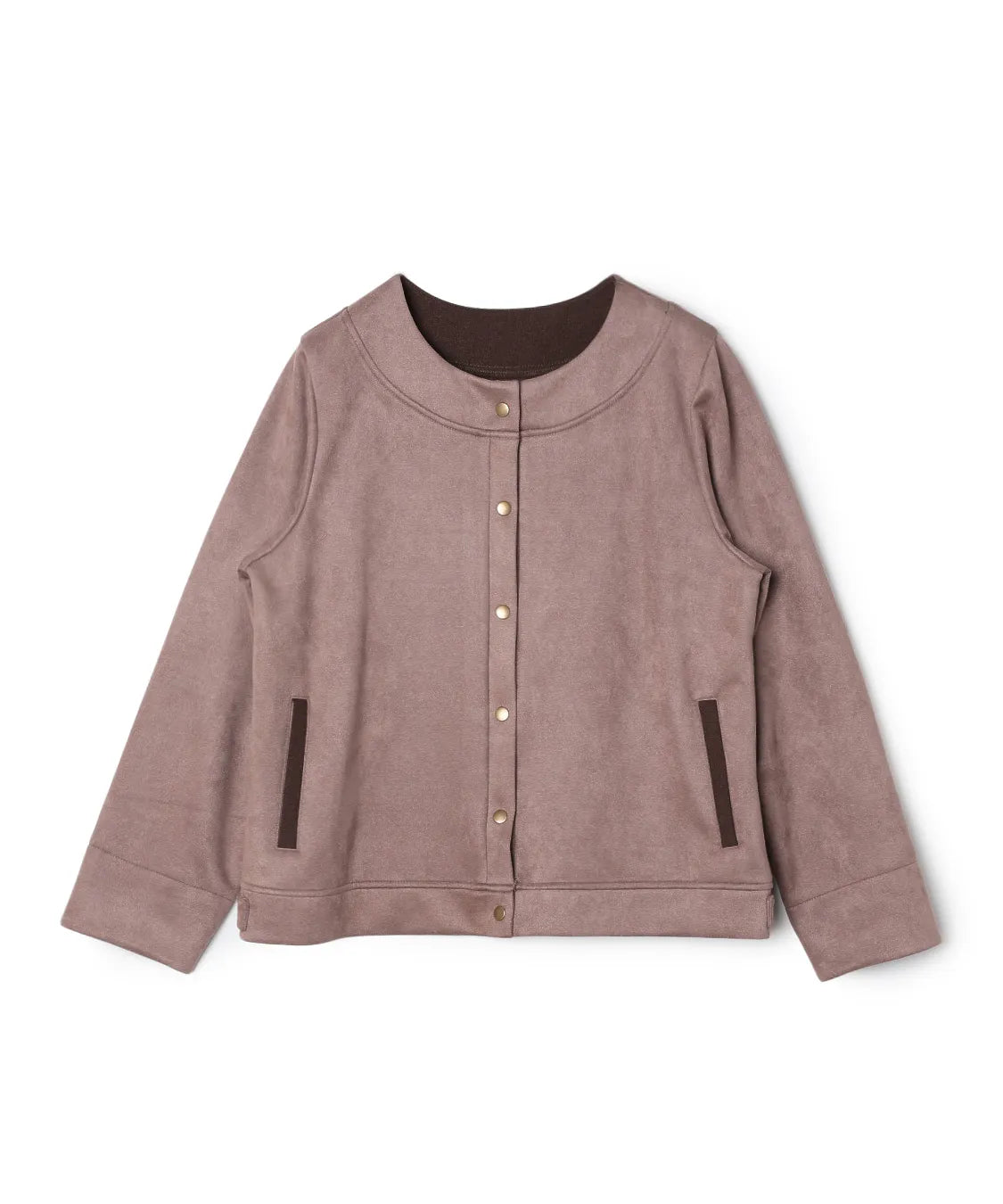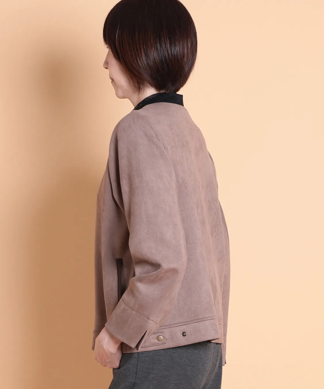 ふんわりと柔らかで、なめらかな質感のフェイクスエード素材を使用したノーカラージャケット。程よいフィット感で動きやすい1枚です。サイドポケットあり。袖を曲げた時の配色と、上品なゴールドのドットボタンがポイントです。