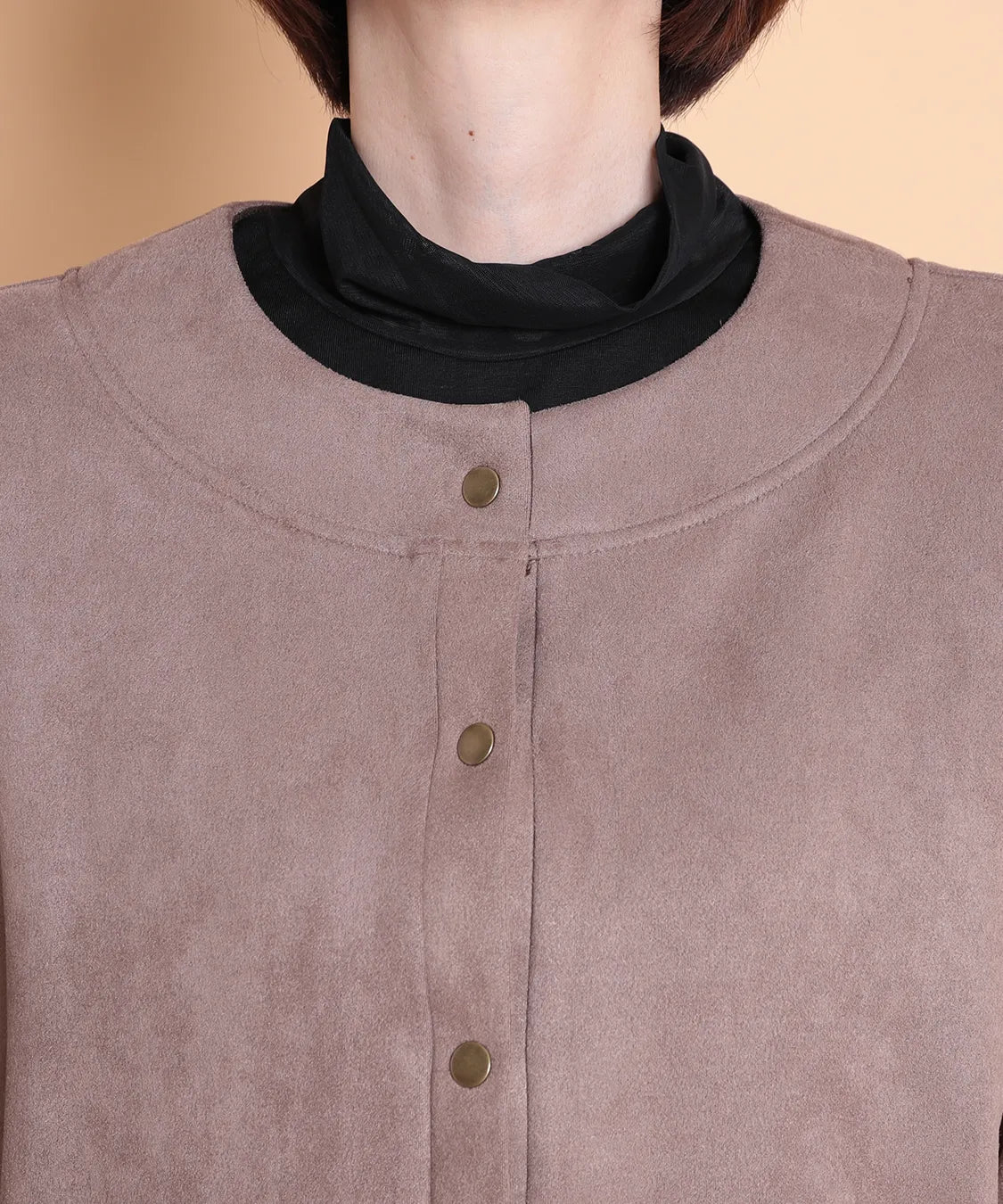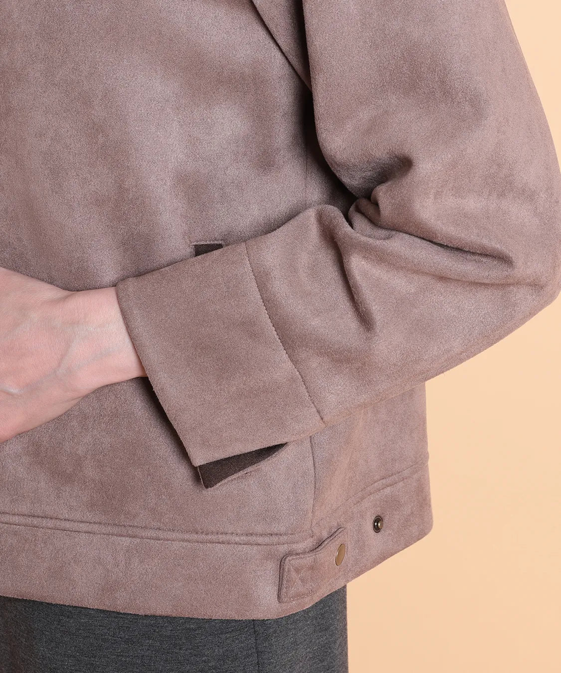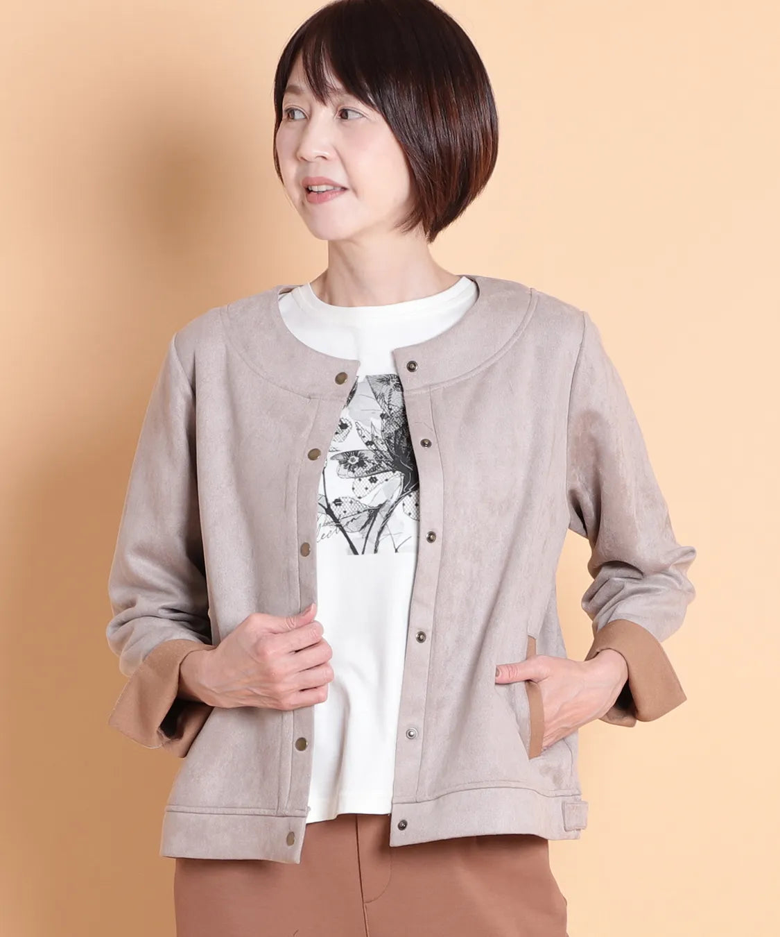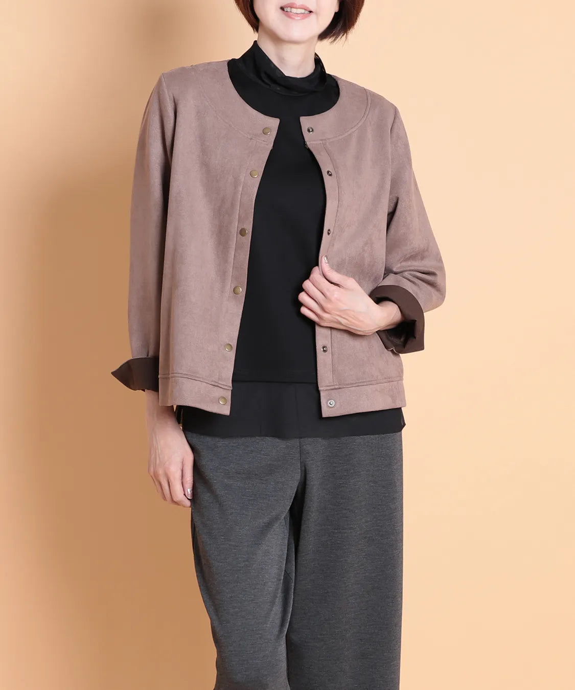 ふんわりと柔らかで、なめらかな質感のフェイクスエード素材を使用したノーカラージャケット。程よいフィット感で動きやすい1枚です。サイドポケットあり。袖を曲げた時の配色と、上品なゴールドのドットボタンがポイントです。
