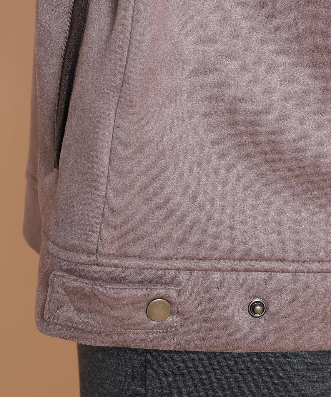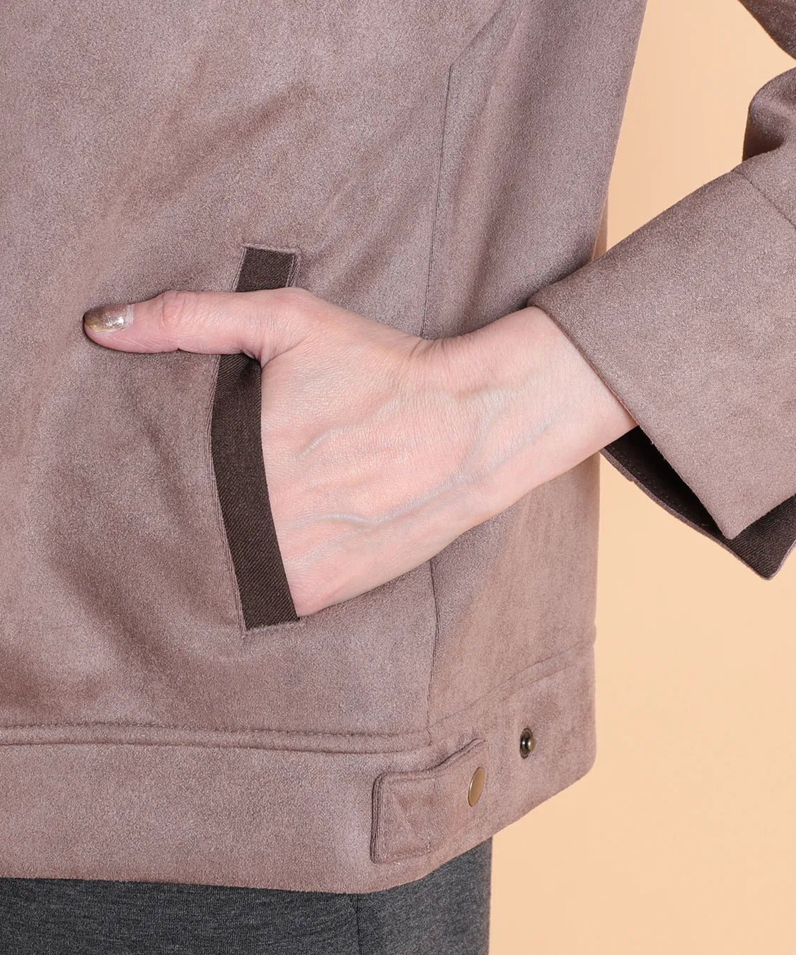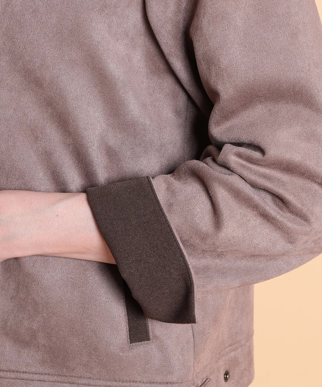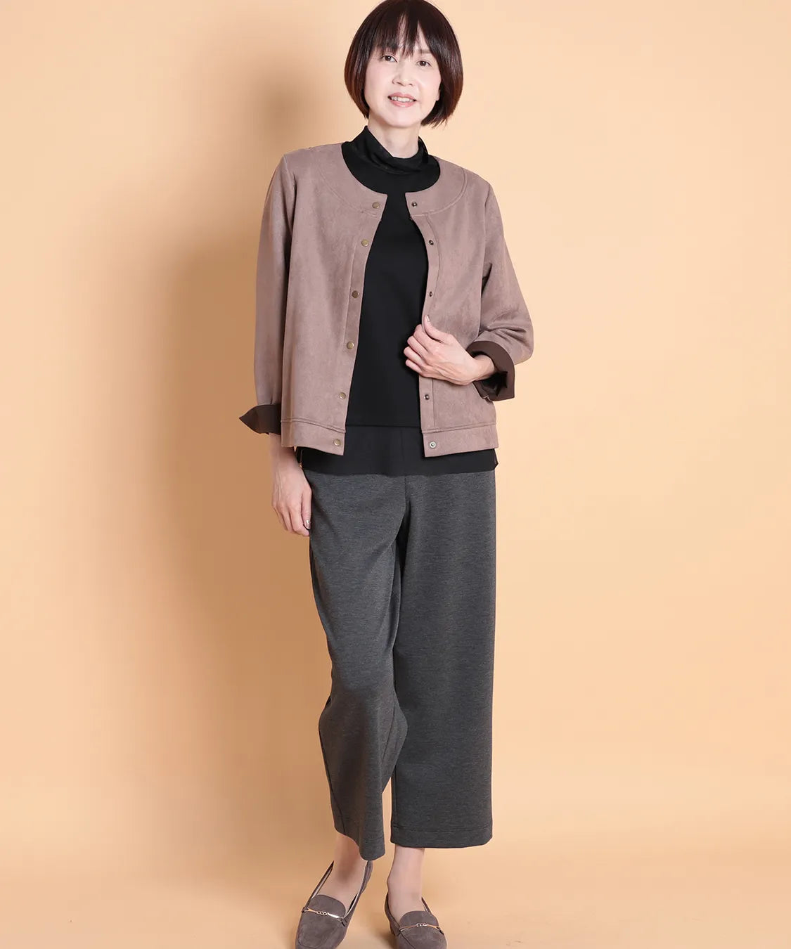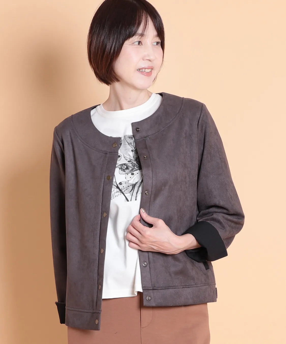 ふんわりと柔らかで、なめらかな質感のフェイクスエード素材を使用したノーカラージャケット。程よいフィット感で動きやすい1枚です。サイドポケットあり。袖を曲げた時の配色と、上品なゴールドのドットボタンがポイントです。