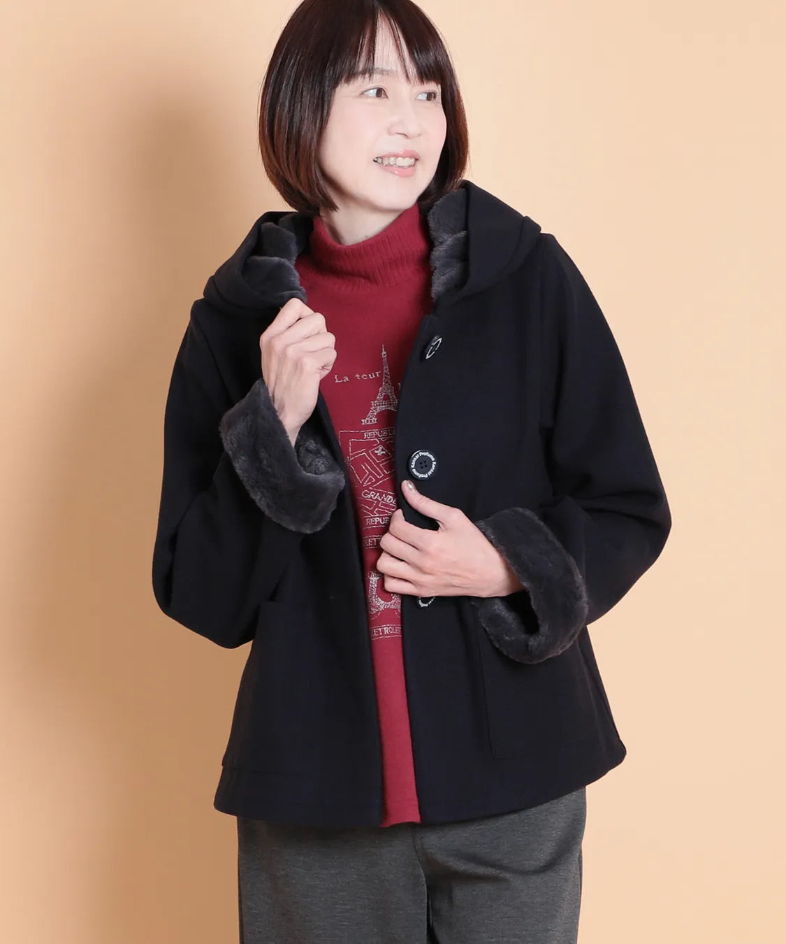 ・フードの内側と袖口にフェイクファーをあしらった、温かみのあるデザイン