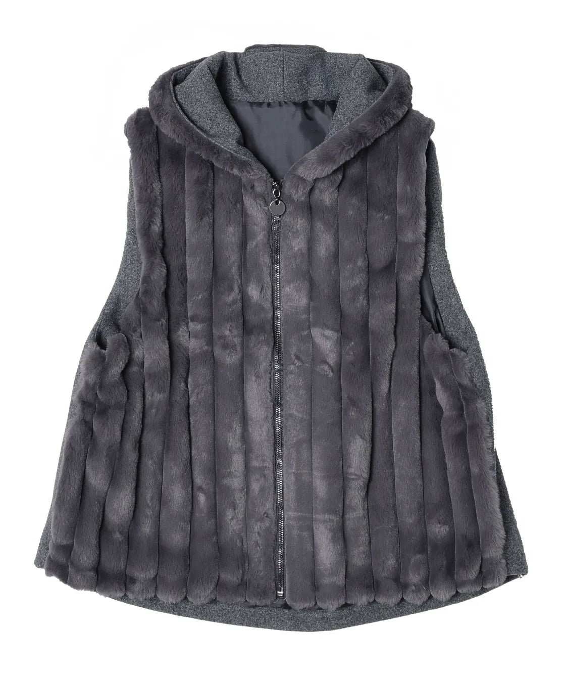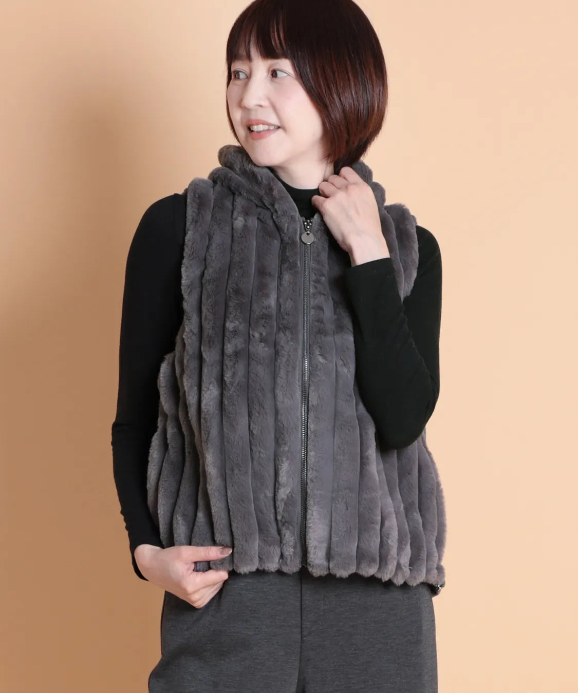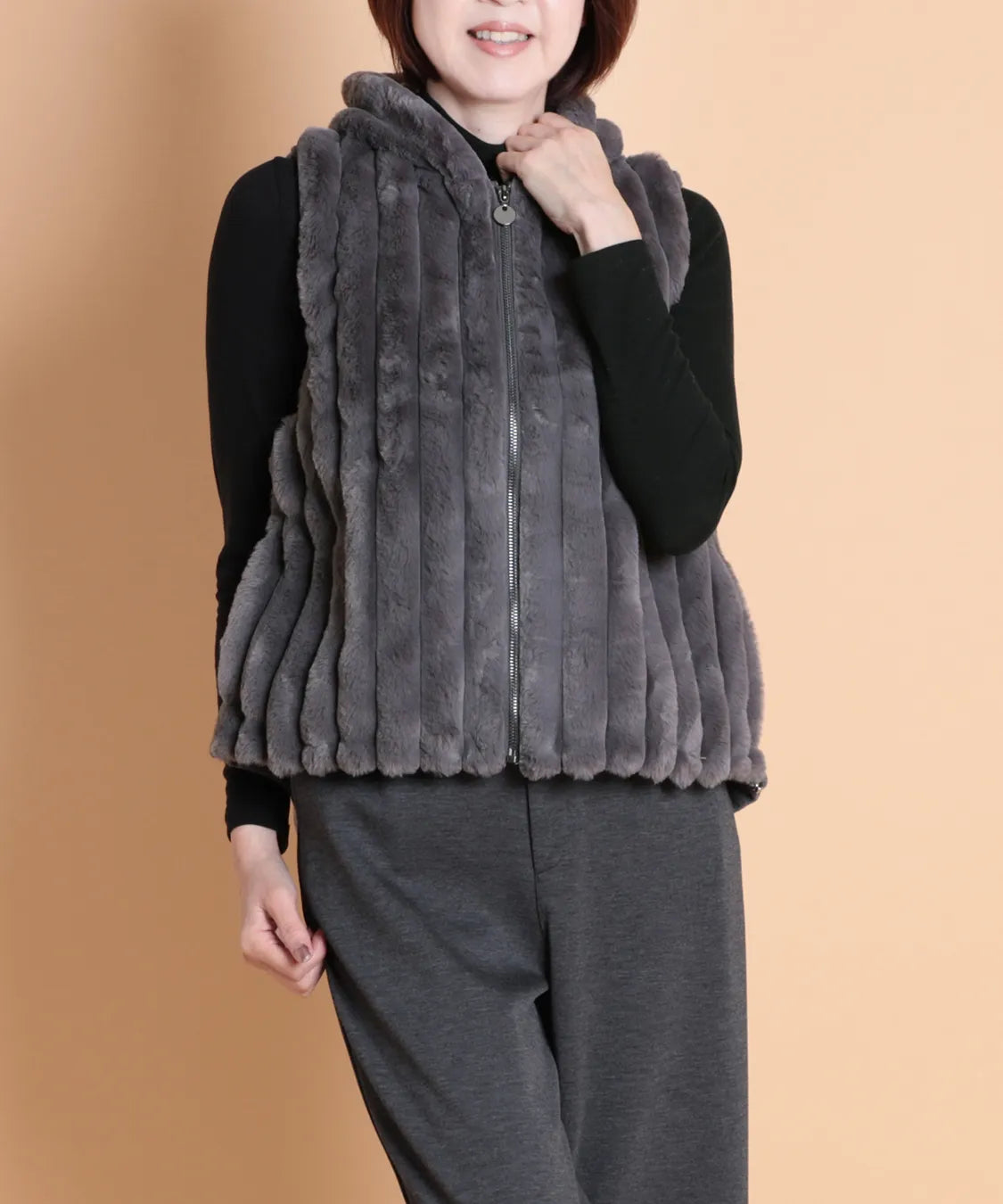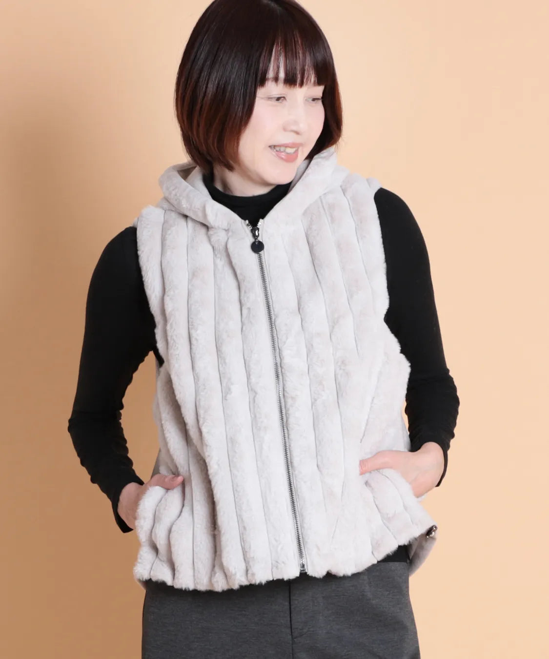 柔らかな肌触りと上品な光沢感が魅力のフェイクファーベスト。 軽量ながらしっかりとした保温性があります。ジップ仕様で着脱も簡単、両サイドには便利なポケット付き。 カジュアルにもエレガントにも合わせやすい万能アイテムです。