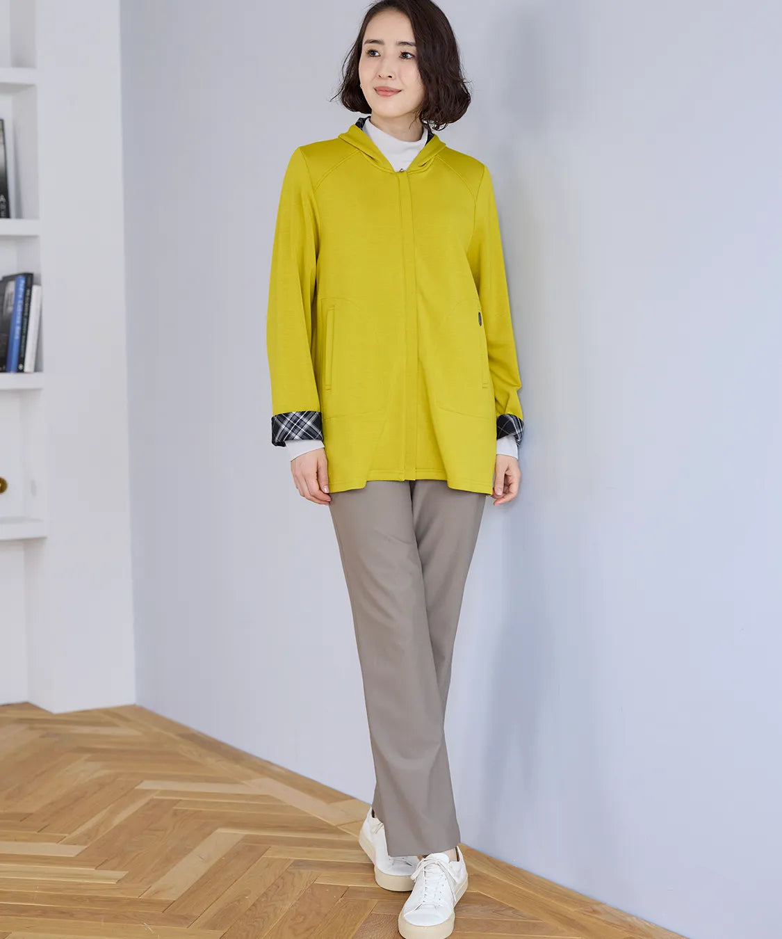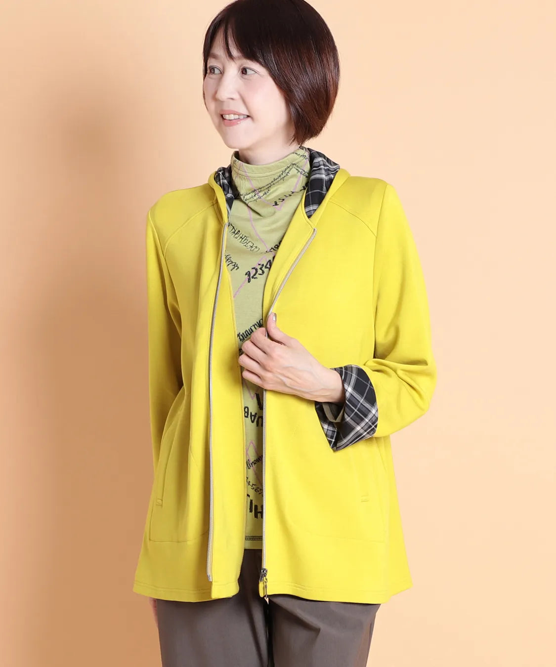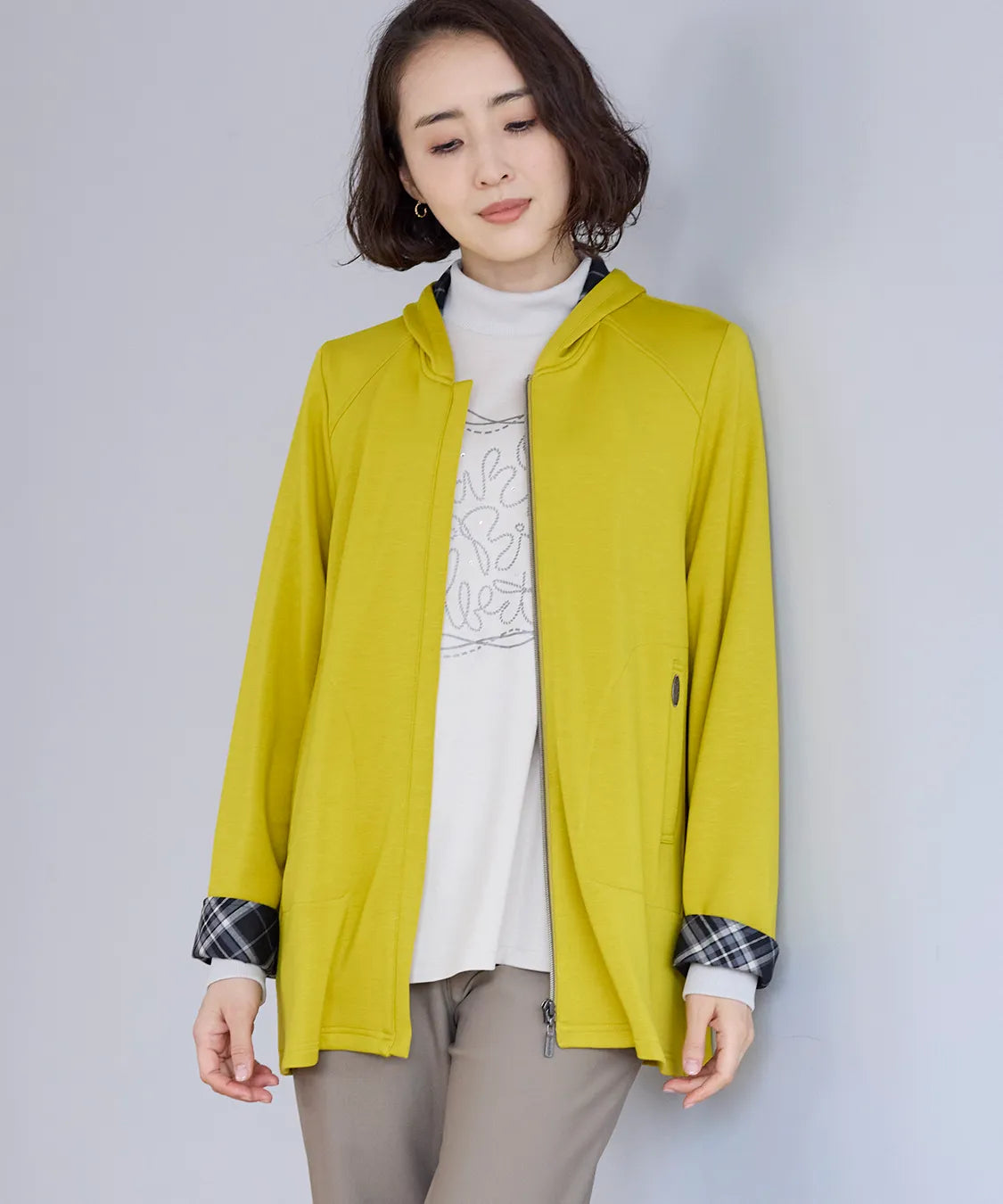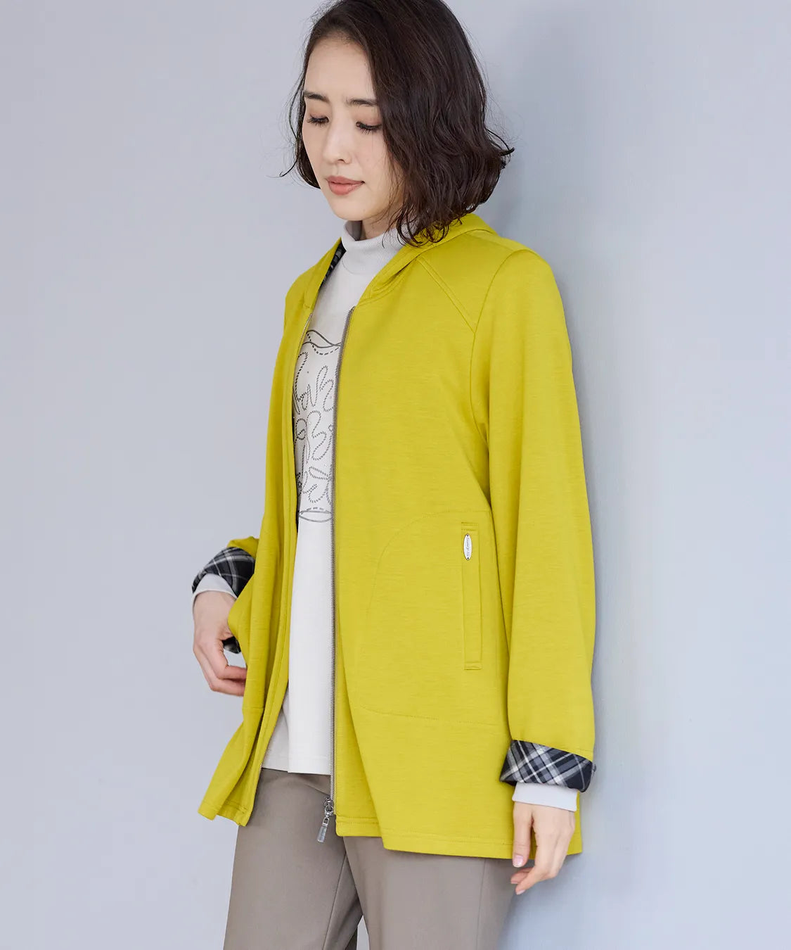なめらかなポンチ素材と、チェック柄の切り替えが目を惹くジップパーカー。