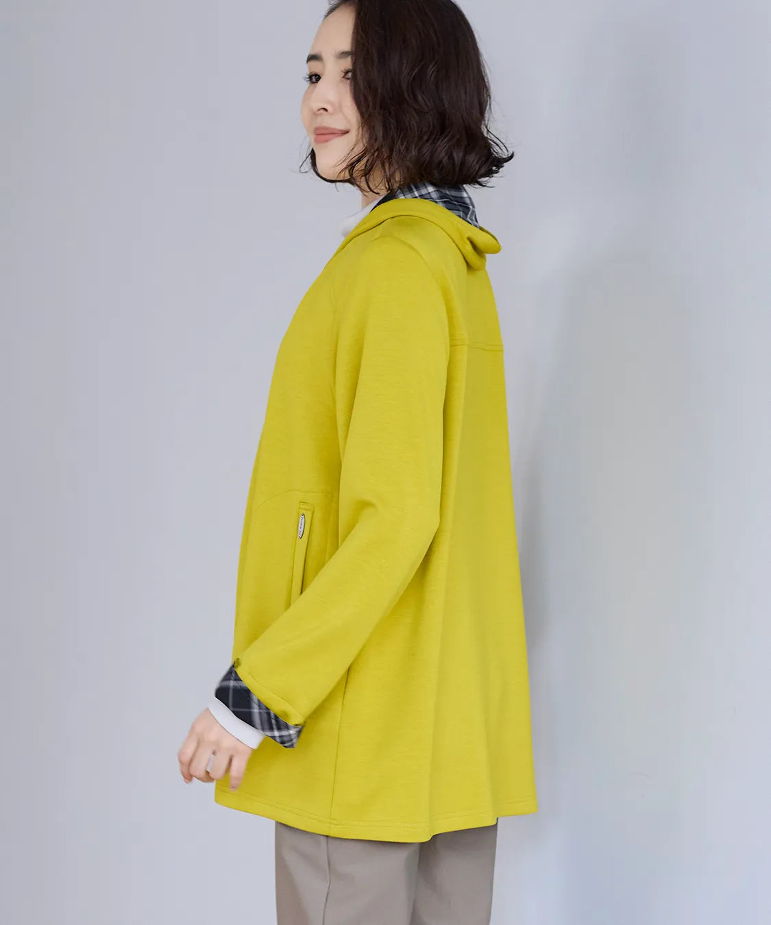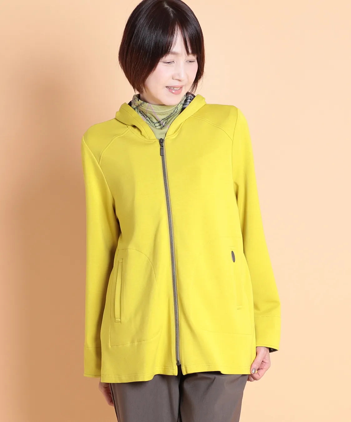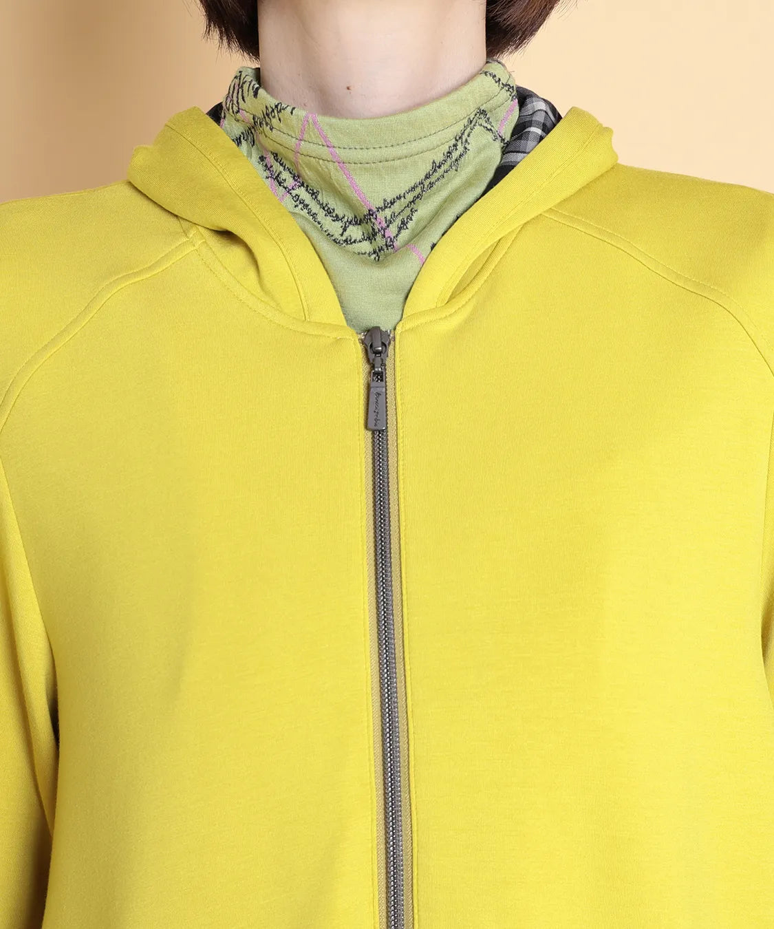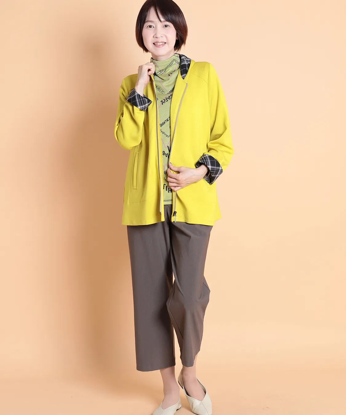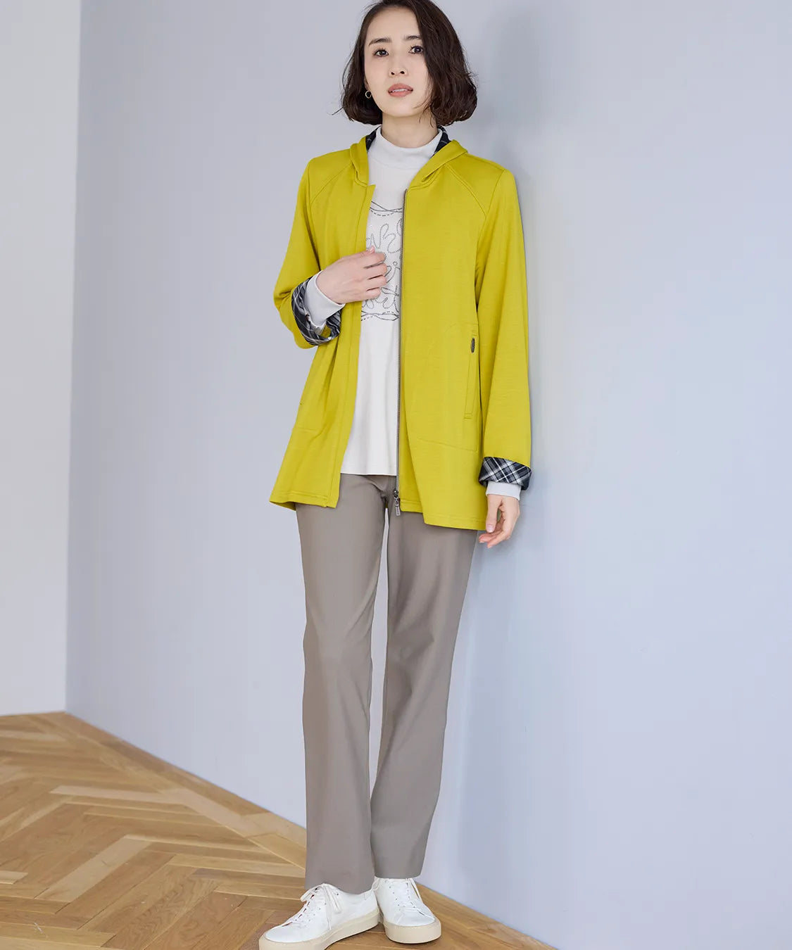 なめらかなポンチ素材と、チェック柄の切り替えが目を惹くジップパーカー。