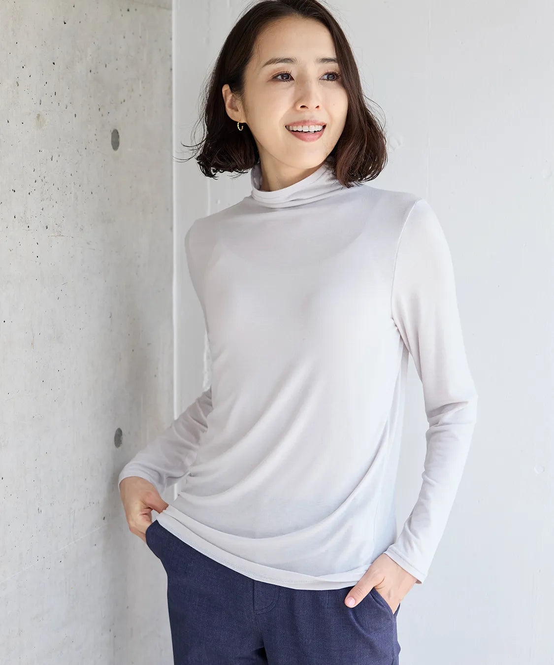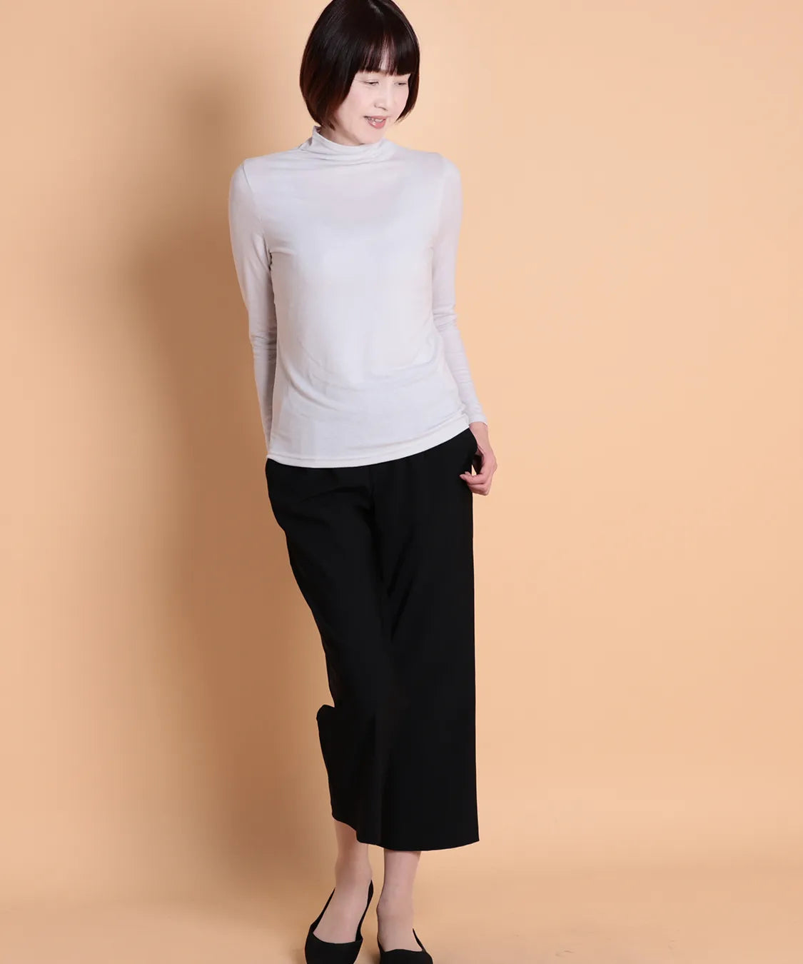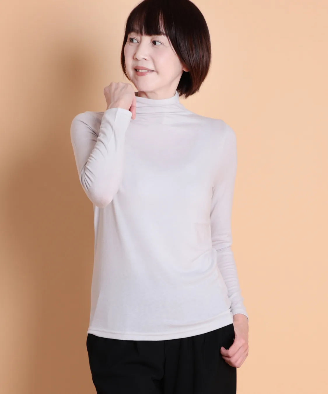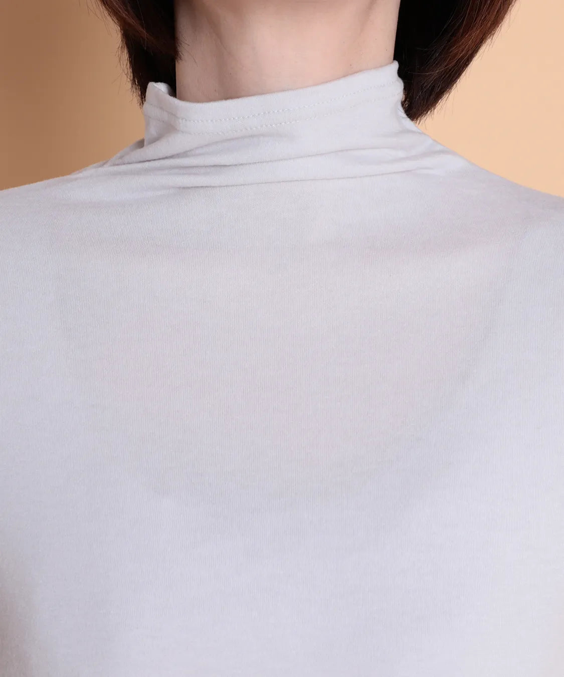特殊な「ミップガーゼ」素材が生み出す、上品なとろみ感と柔らかなドレープのハイネックが魅力です。