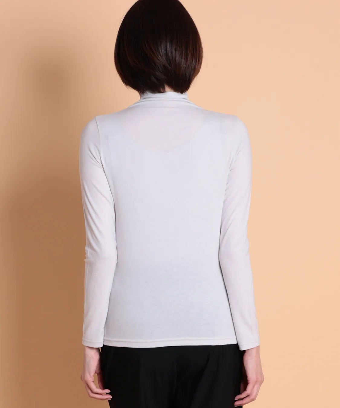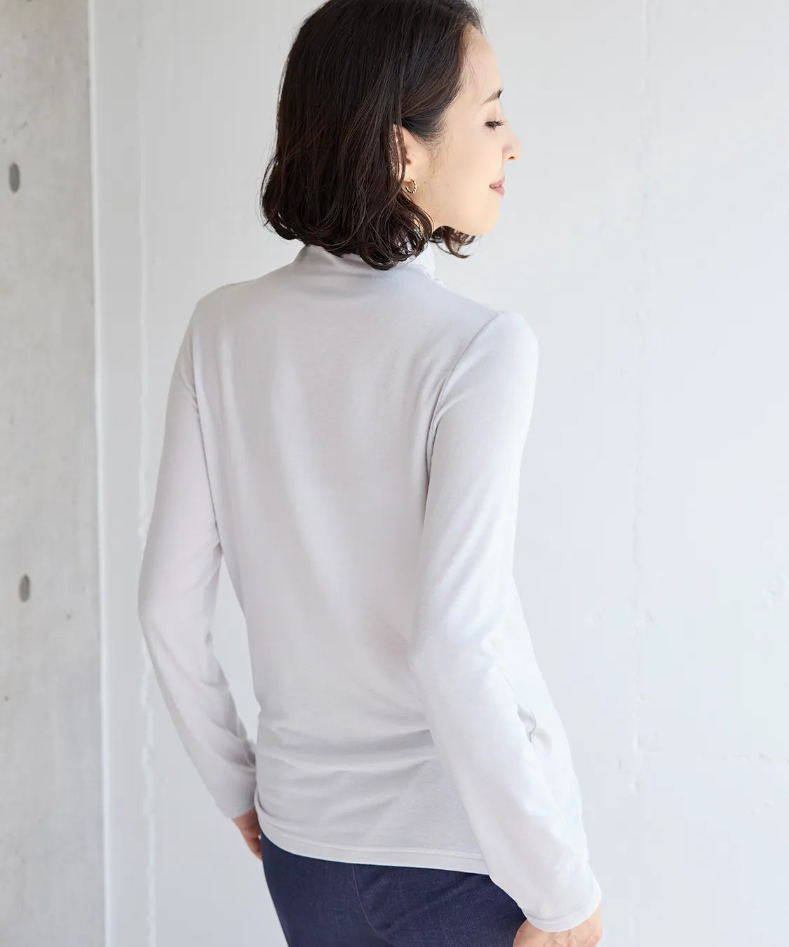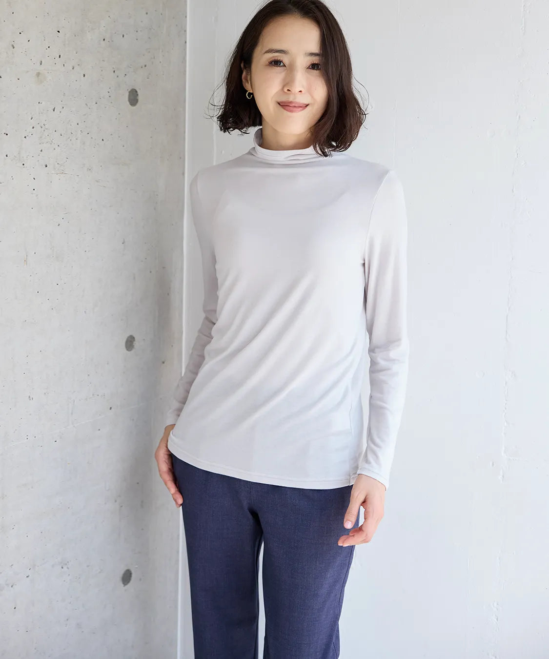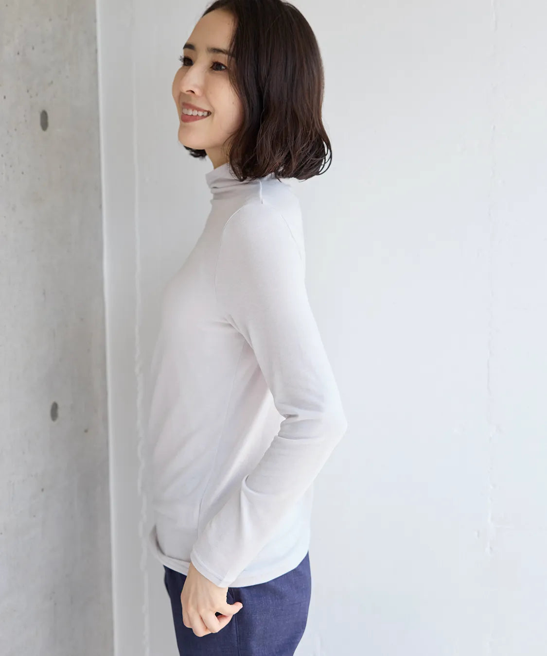 特殊な「ミップガーゼ」素材が生み出す、上品なとろみ感と柔らかなドレープのハイネックが魅力です。