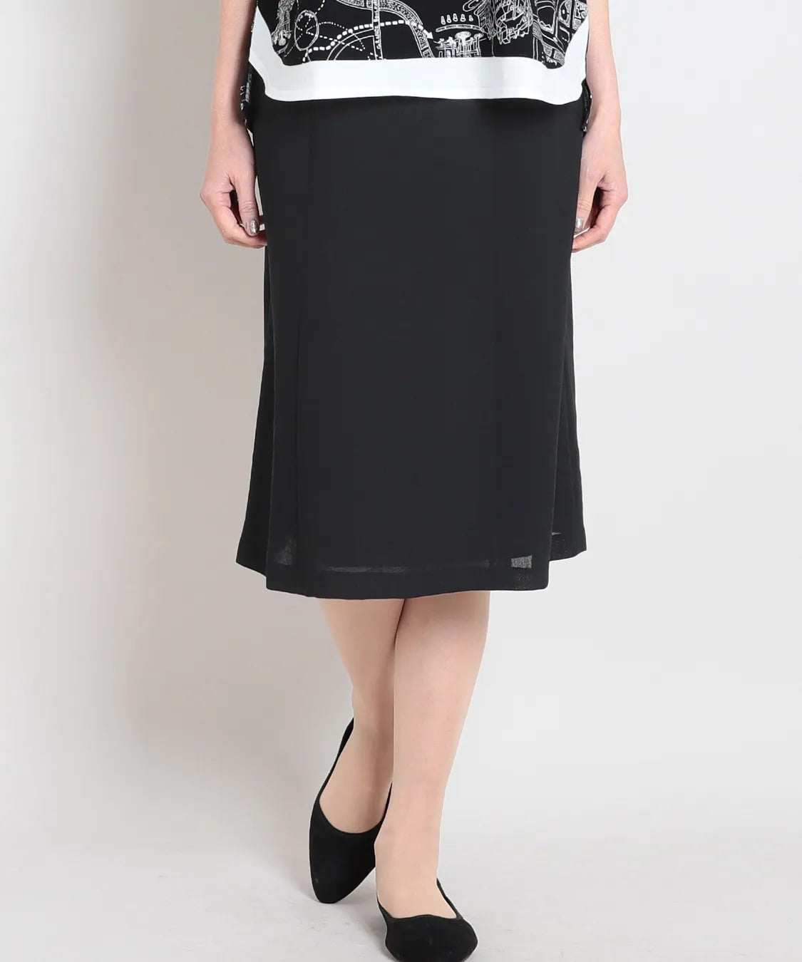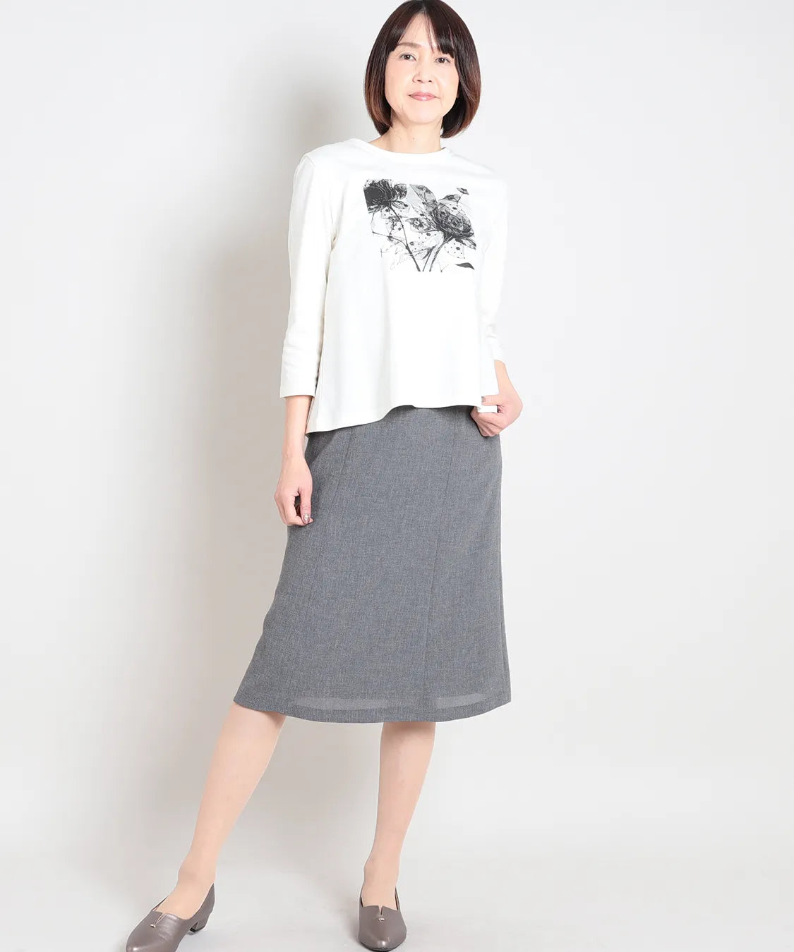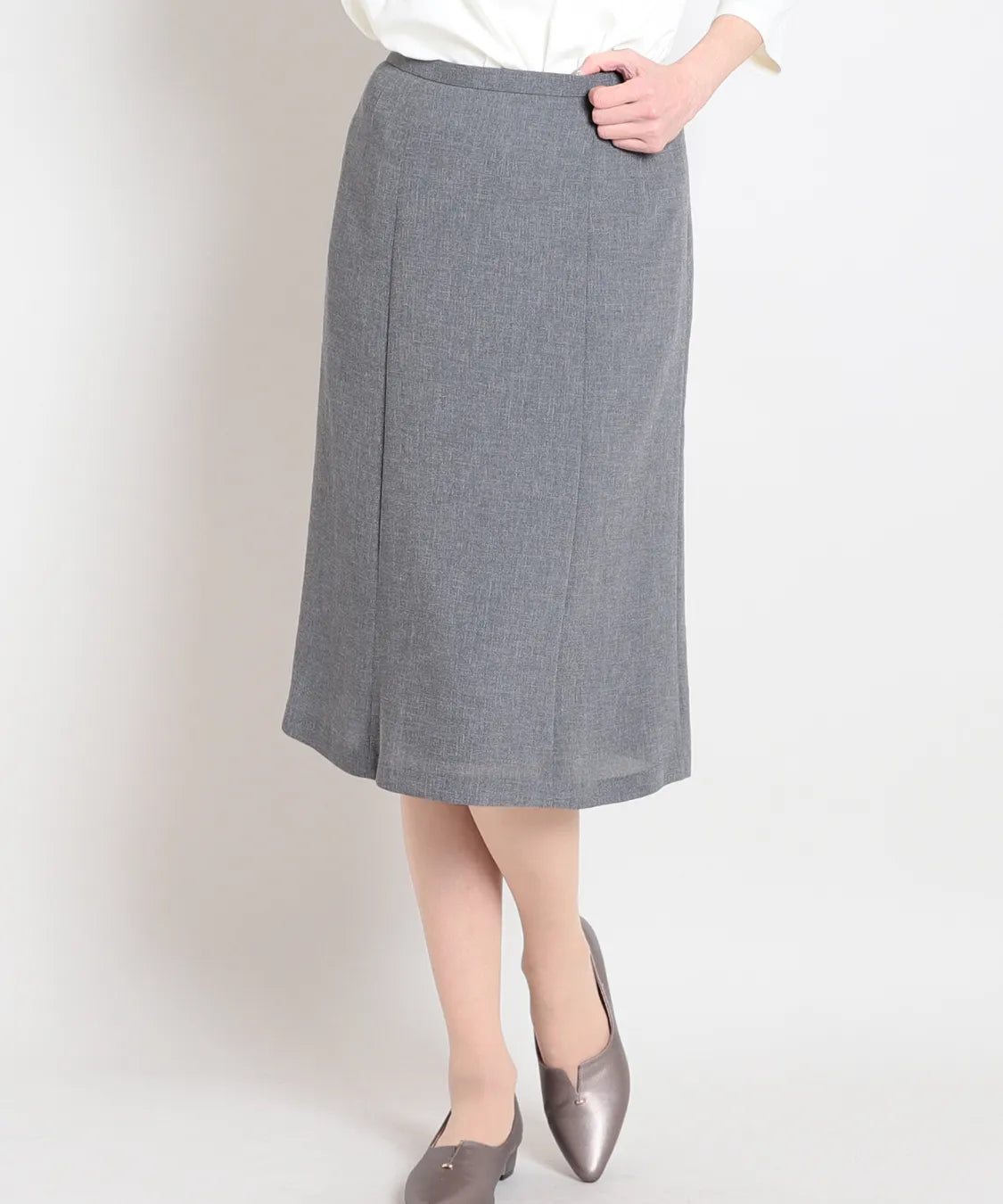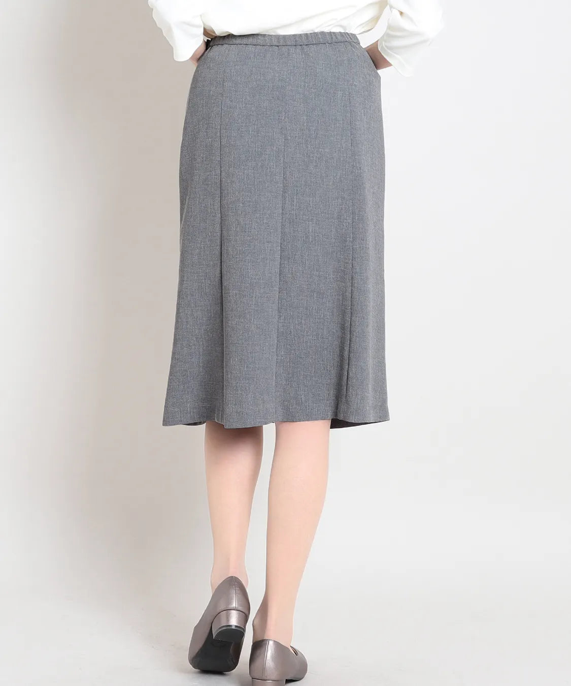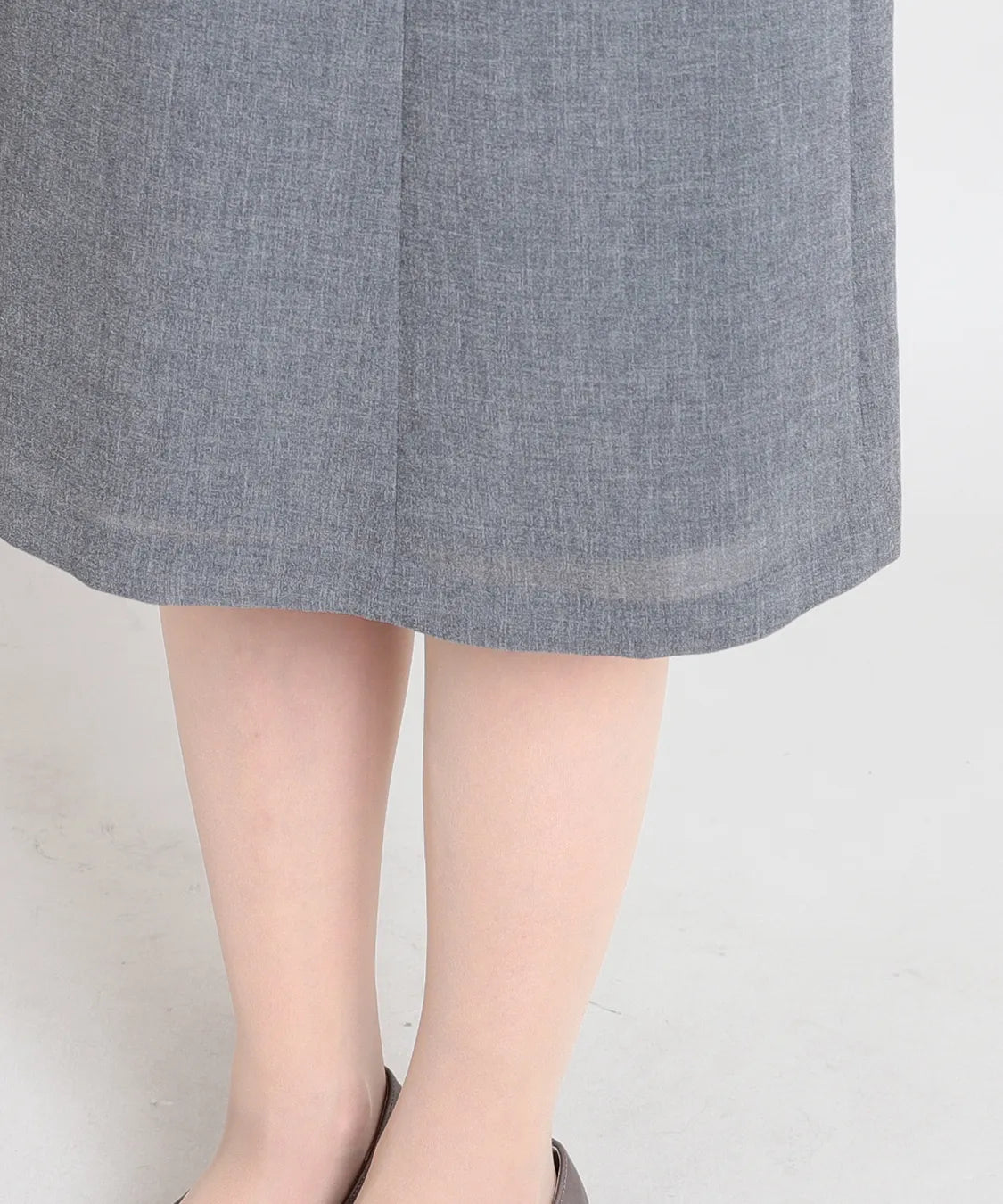 長すぎない丈感で足元が軽やかに見え、パンプスからフラットシューズまで好相性です。