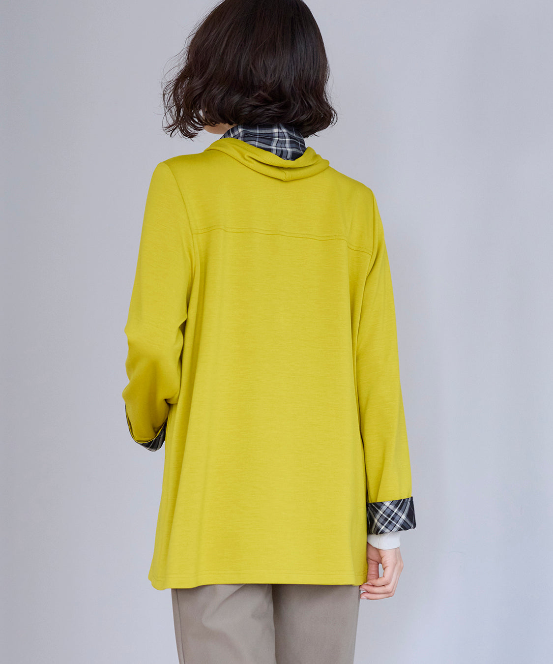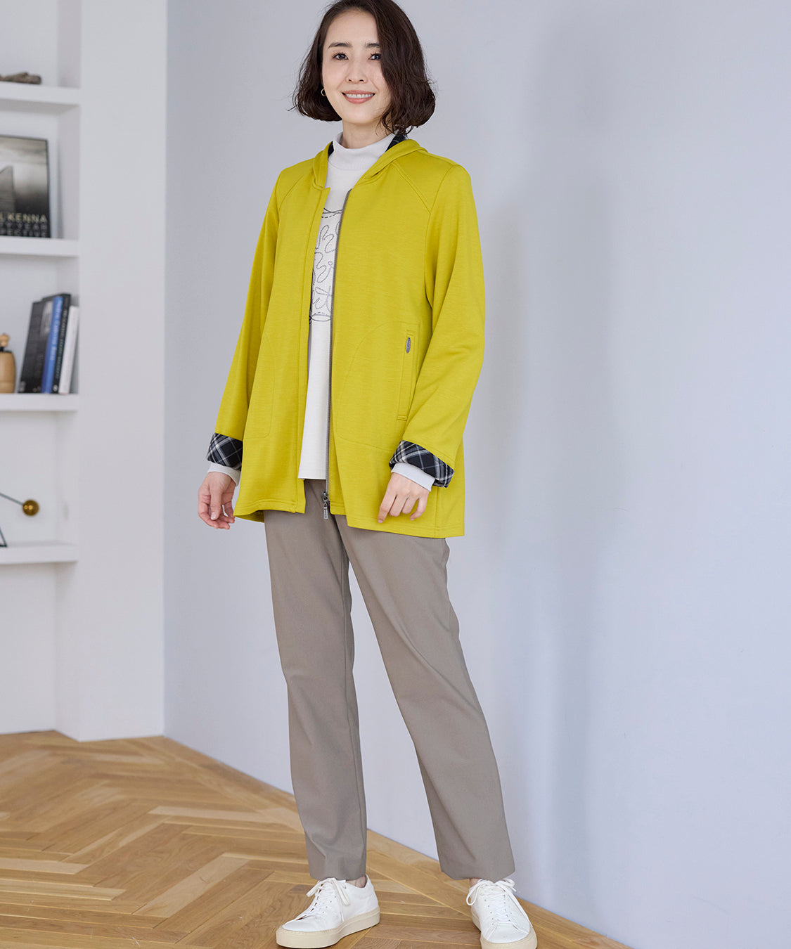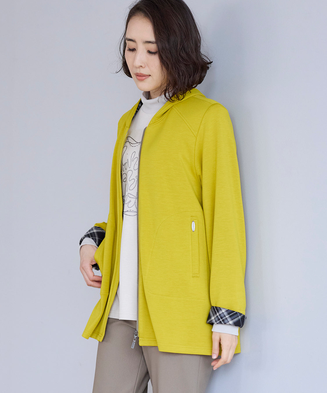 顔まわりを明るく見せるライムカラーのジャケットが主役。