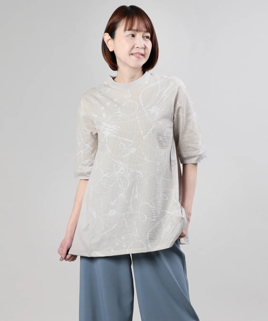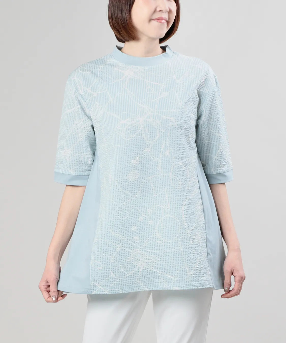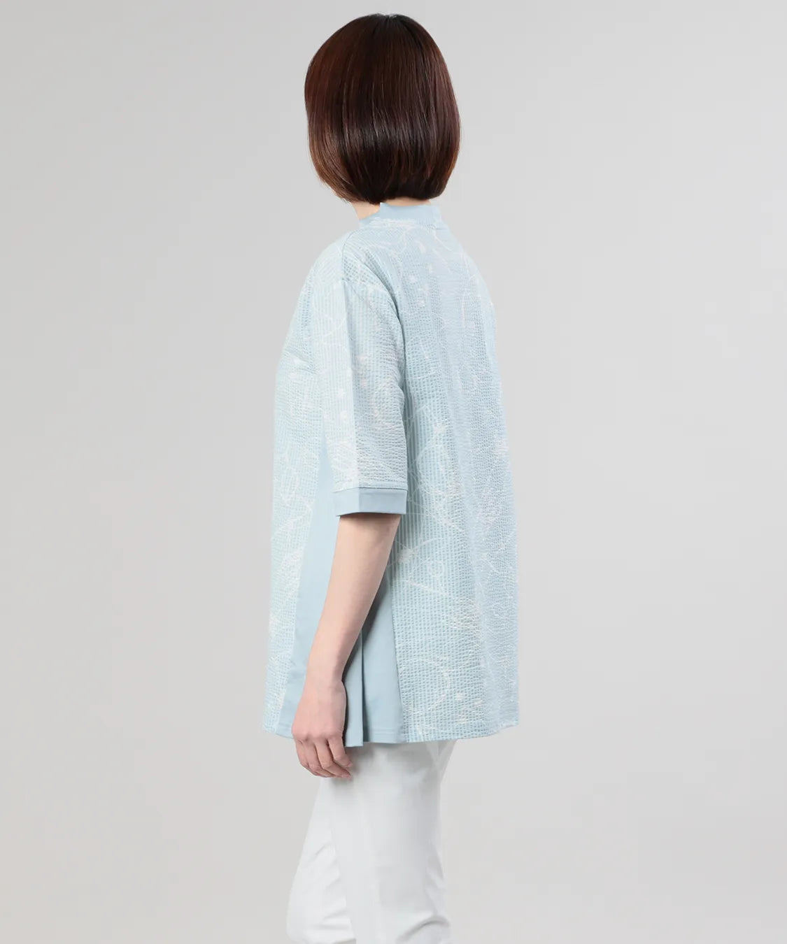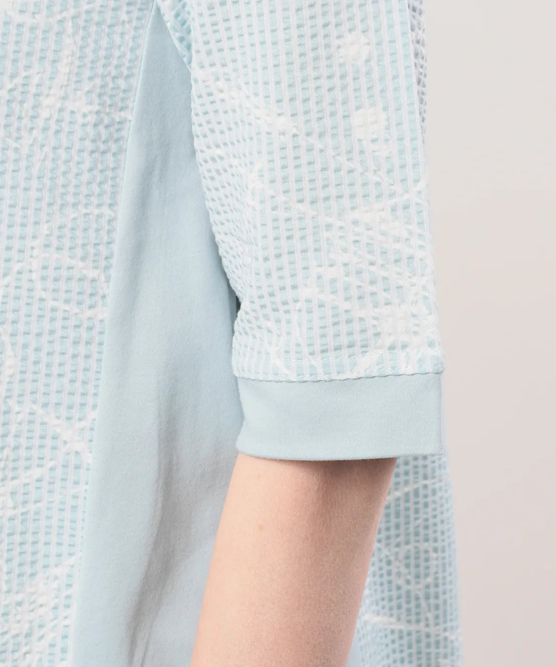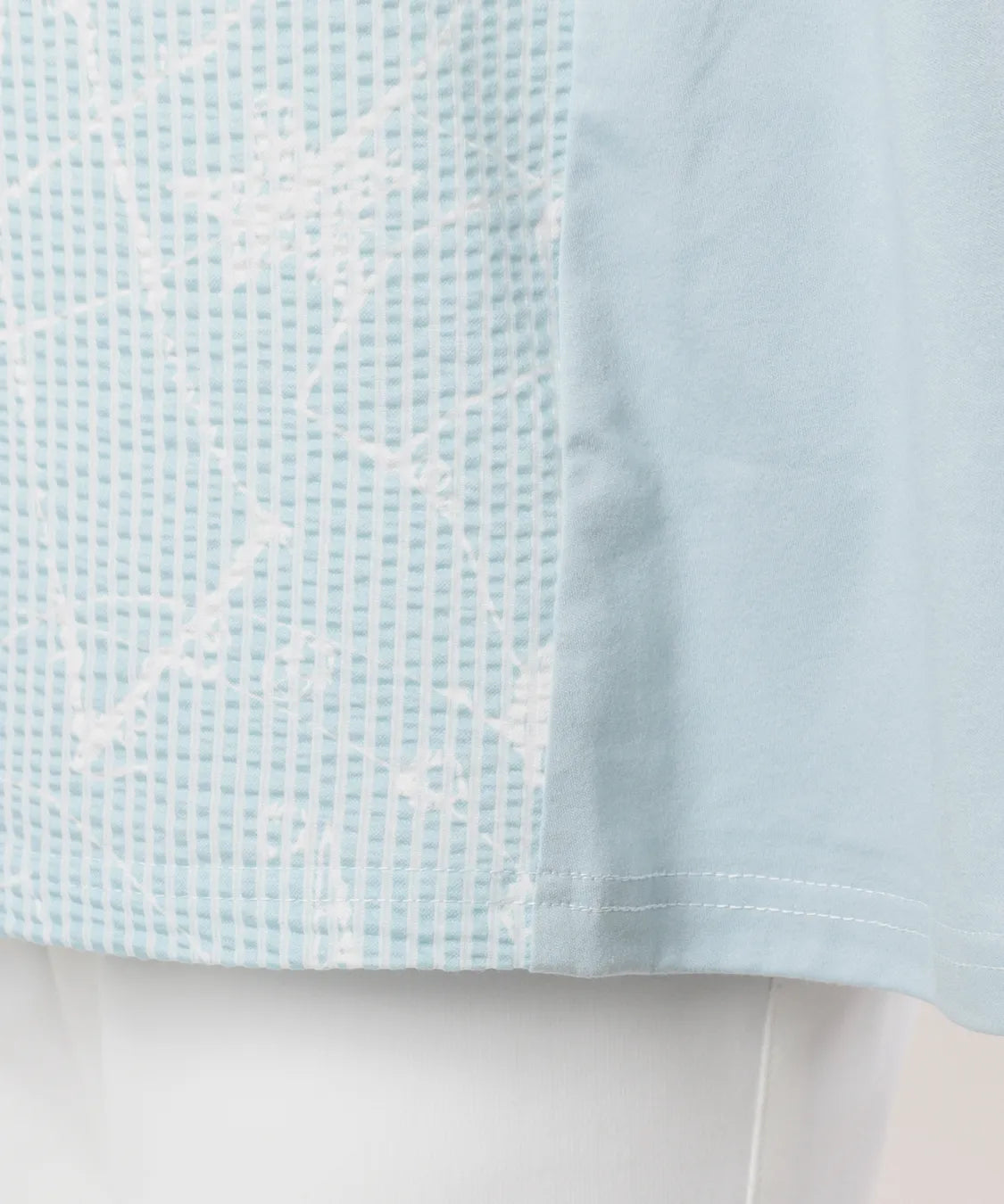 フロントには繊細な柄感のあるサッカー生地を、サイドにはなめらかなスムース素材を組み合わせることで、異素材のコントラストが際立つ上品なデザインに仕上げました。