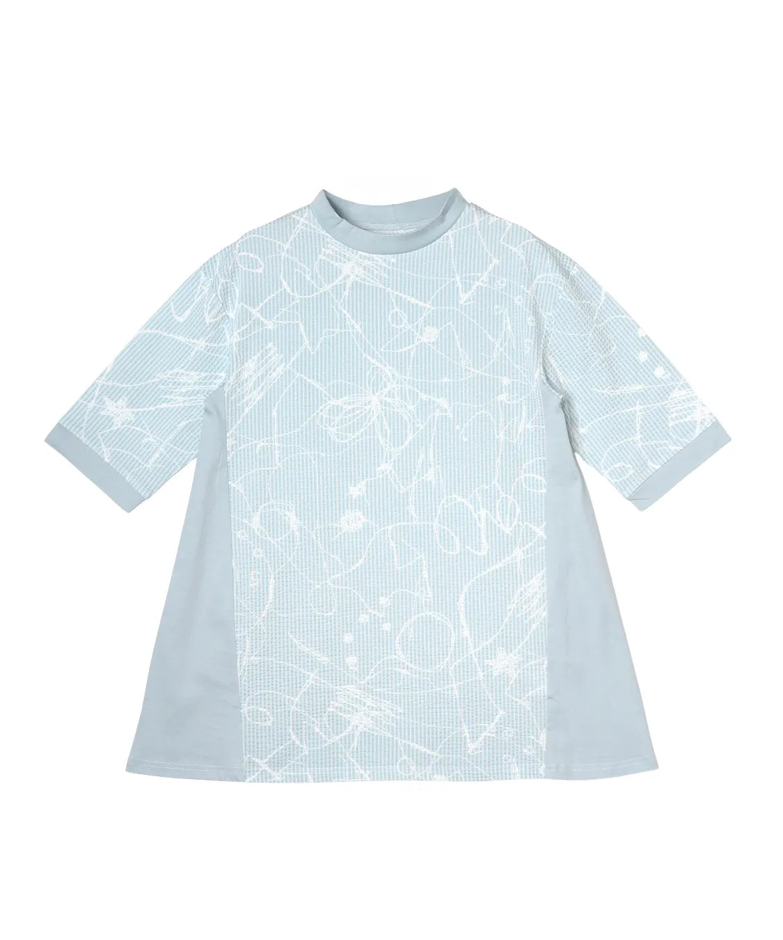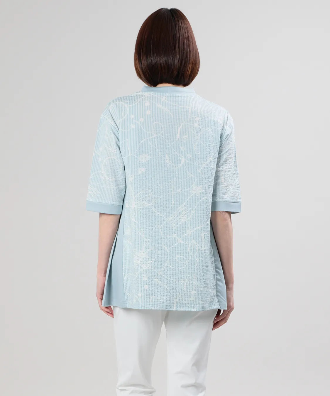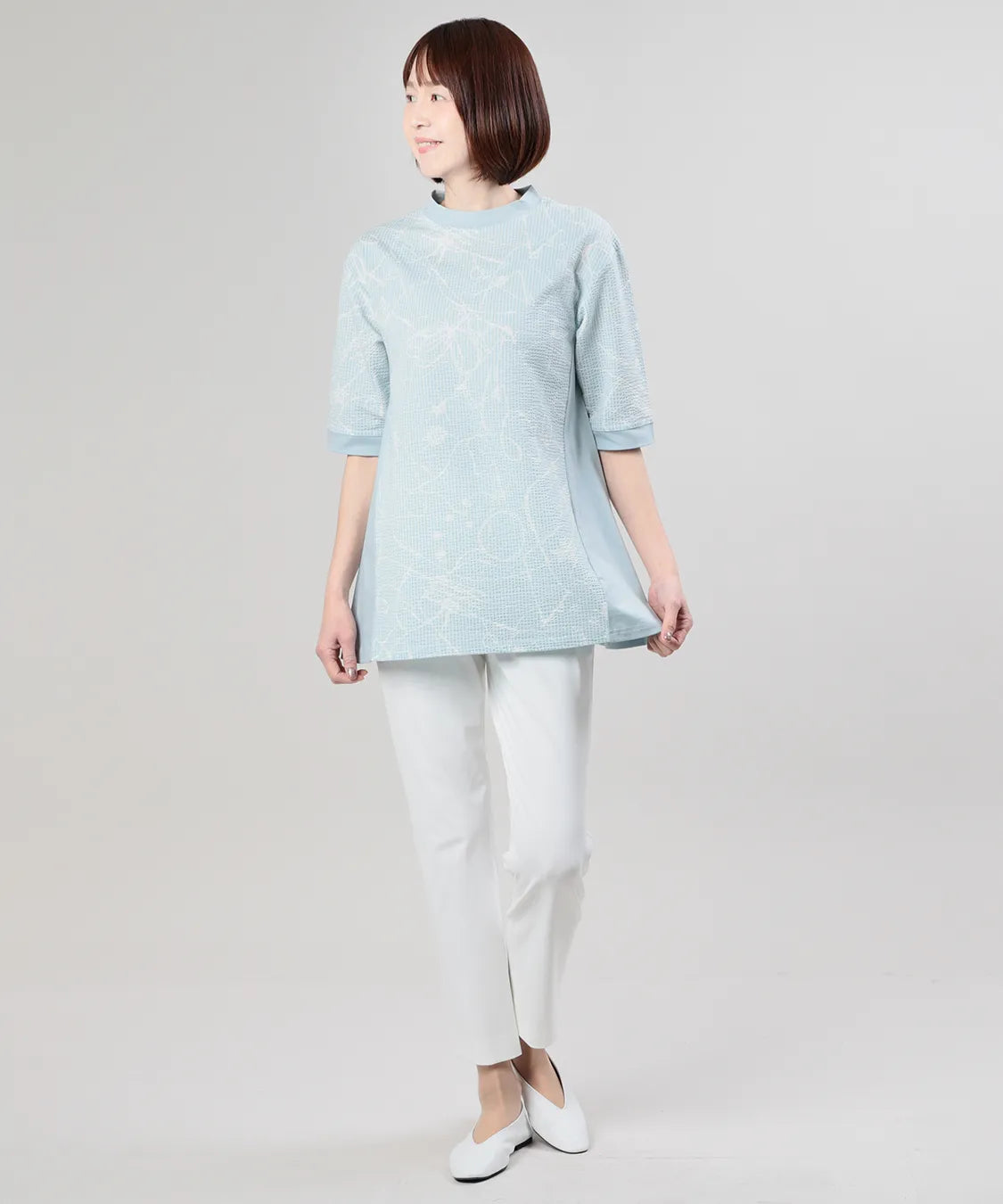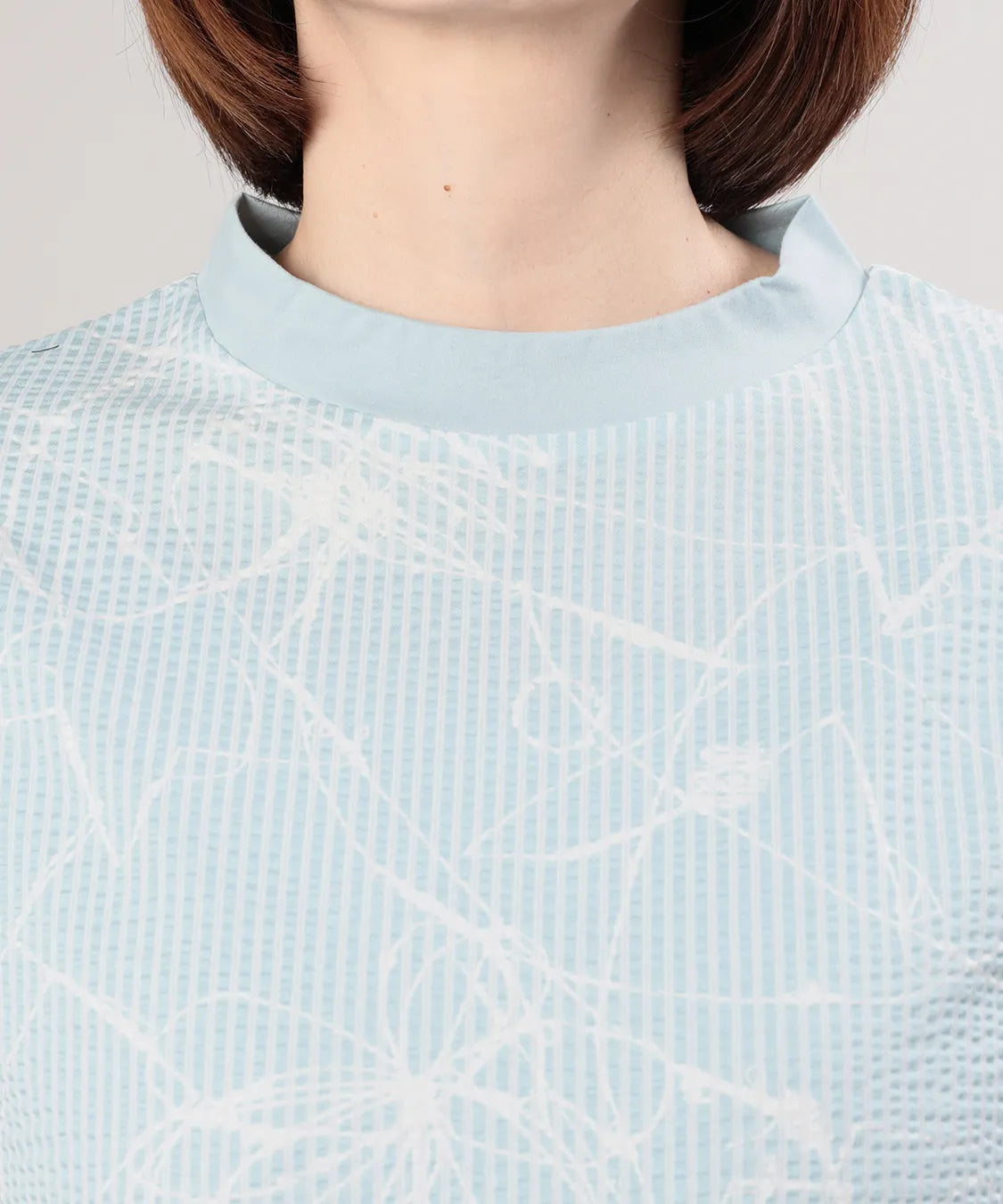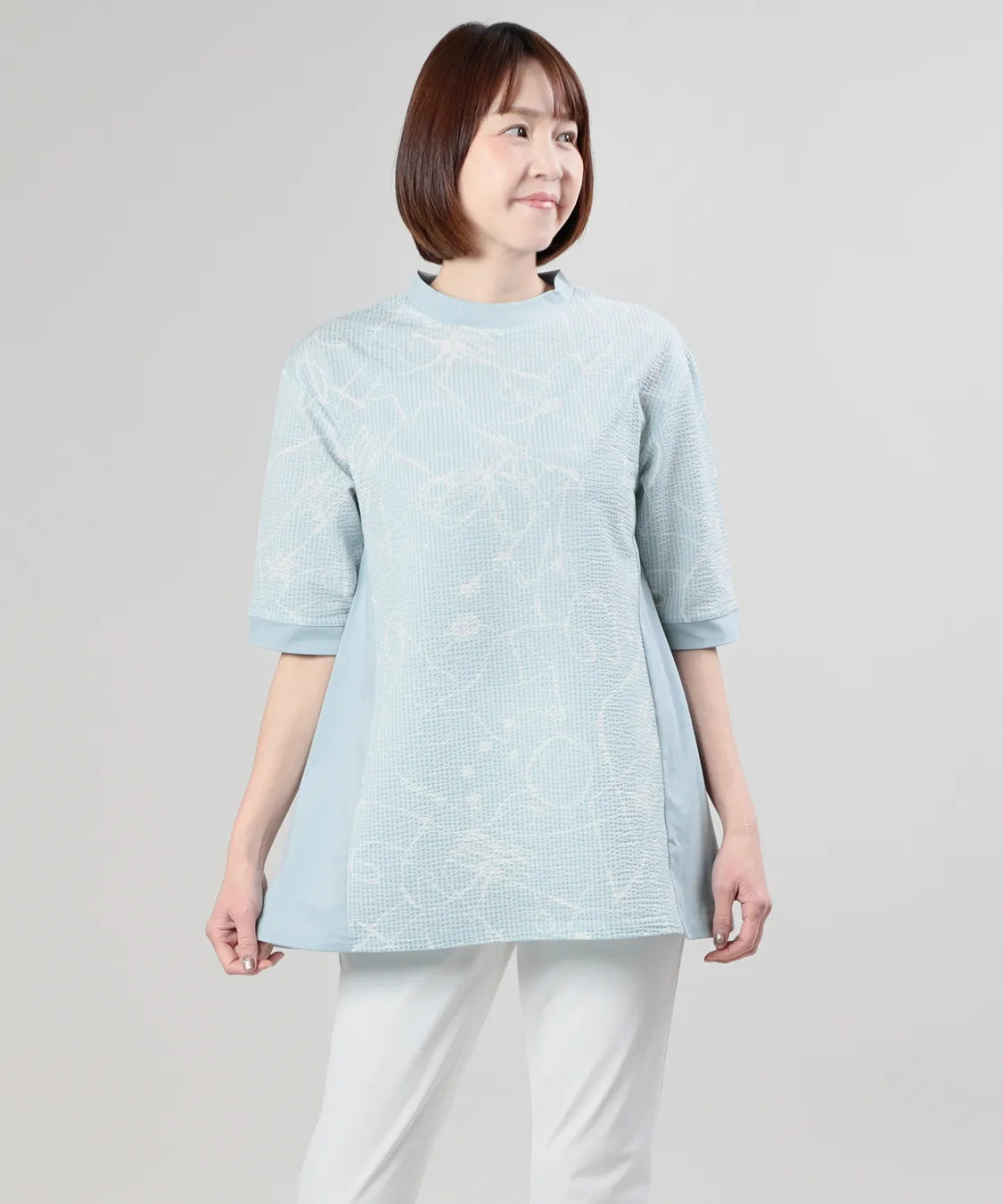 フロントには繊細な柄感のあるサッカー生地を、サイドにはなめらかなスムース素材を組み合わせることで、異素材のコントラストが際立つ上品なデザインに仕上げました。