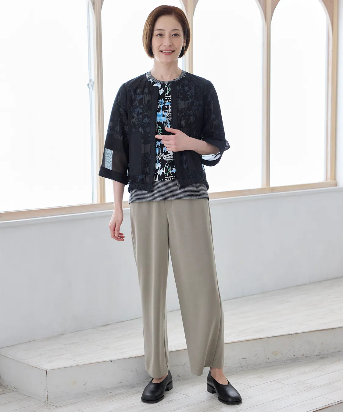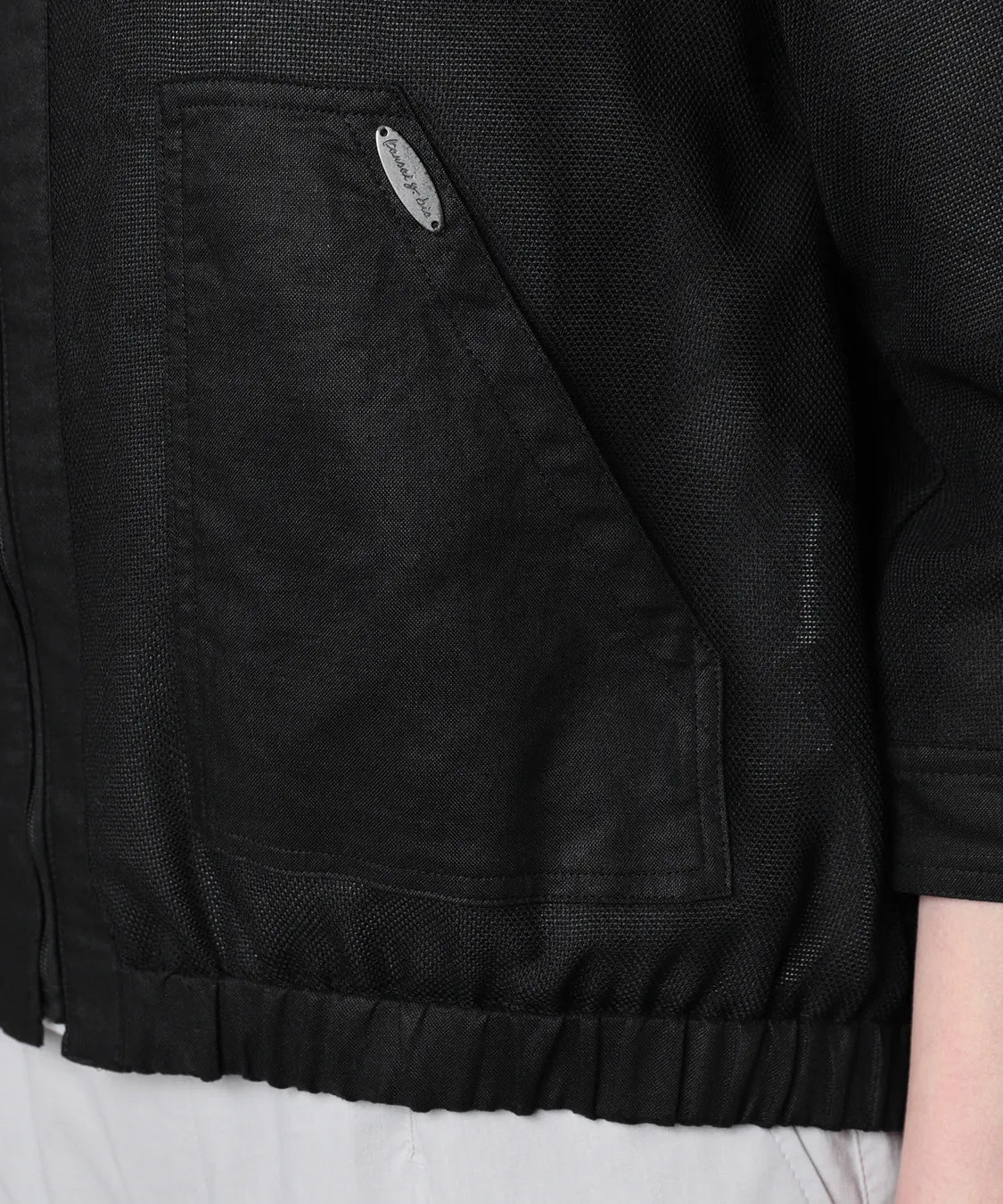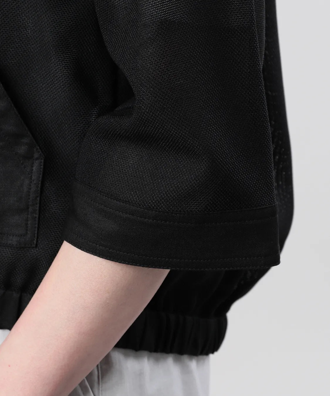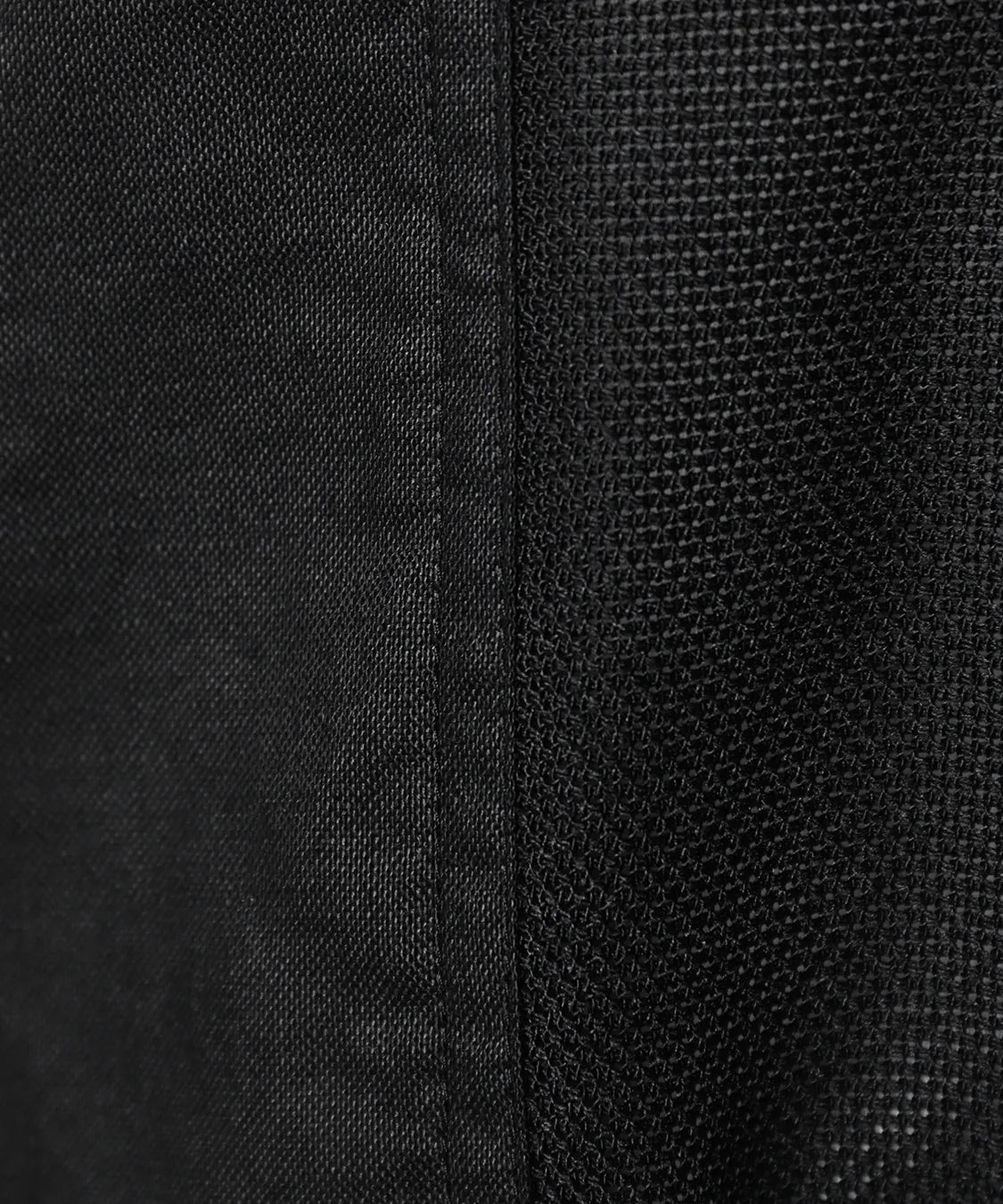 異素材を組み合わせたデザインが、シンプルながらも奥行きのある表情を演出。さりげない透け感が、重くなりがちなブラックスタイルに抜け感をプラスします。