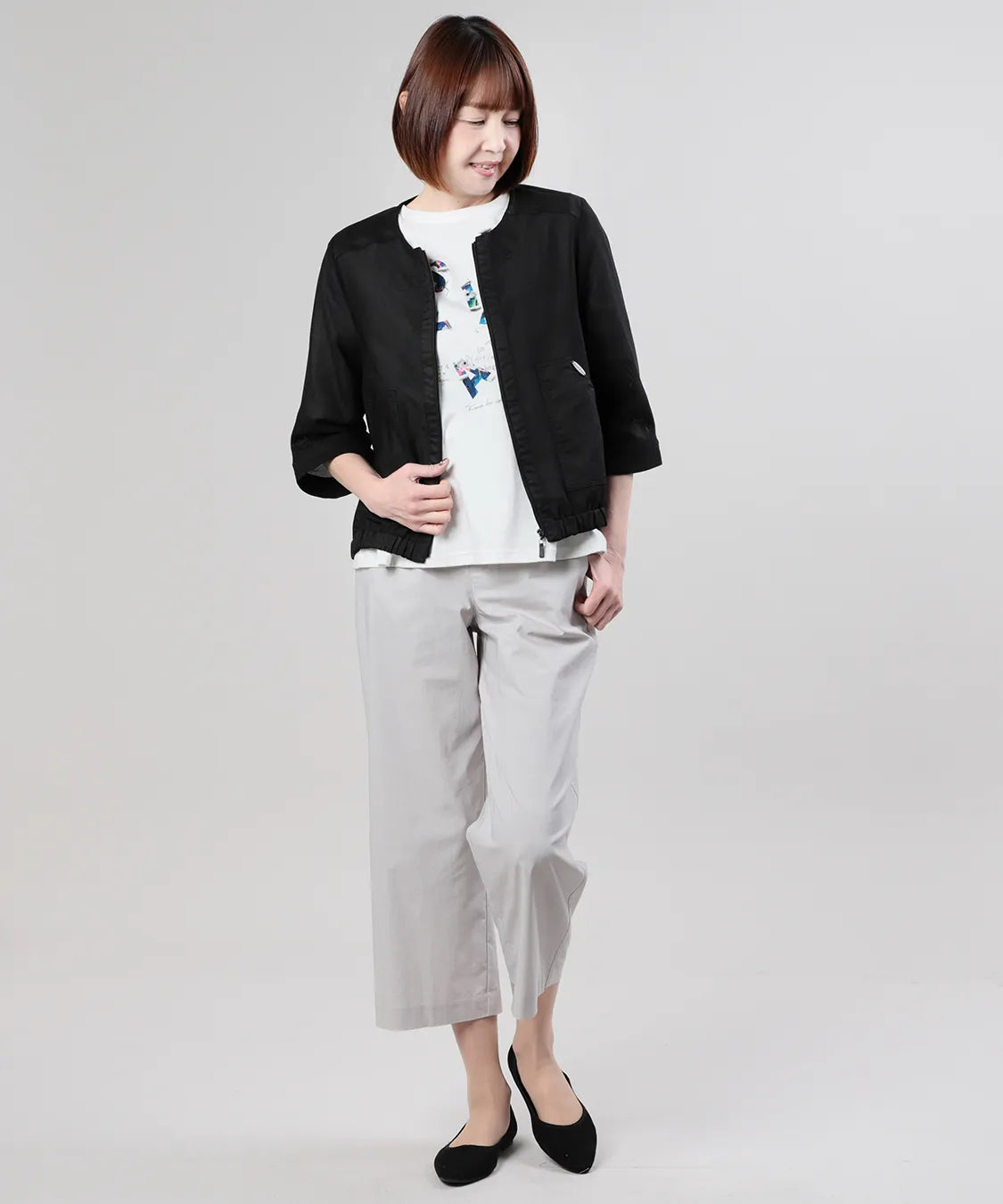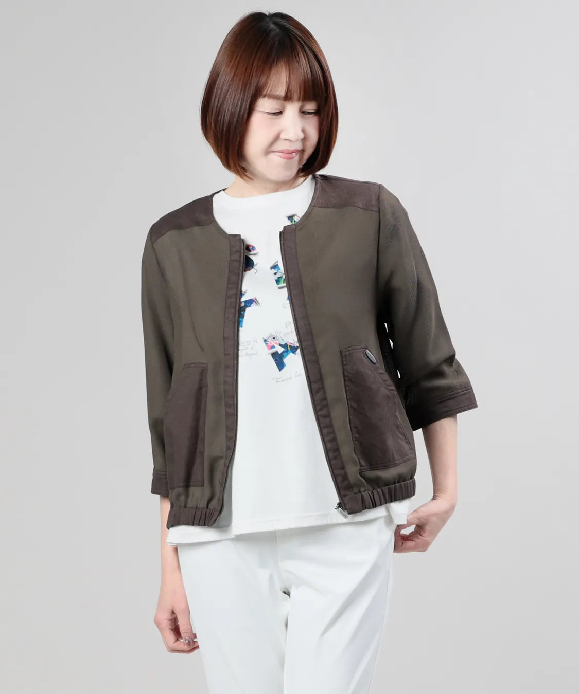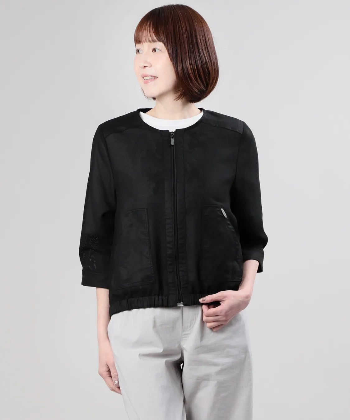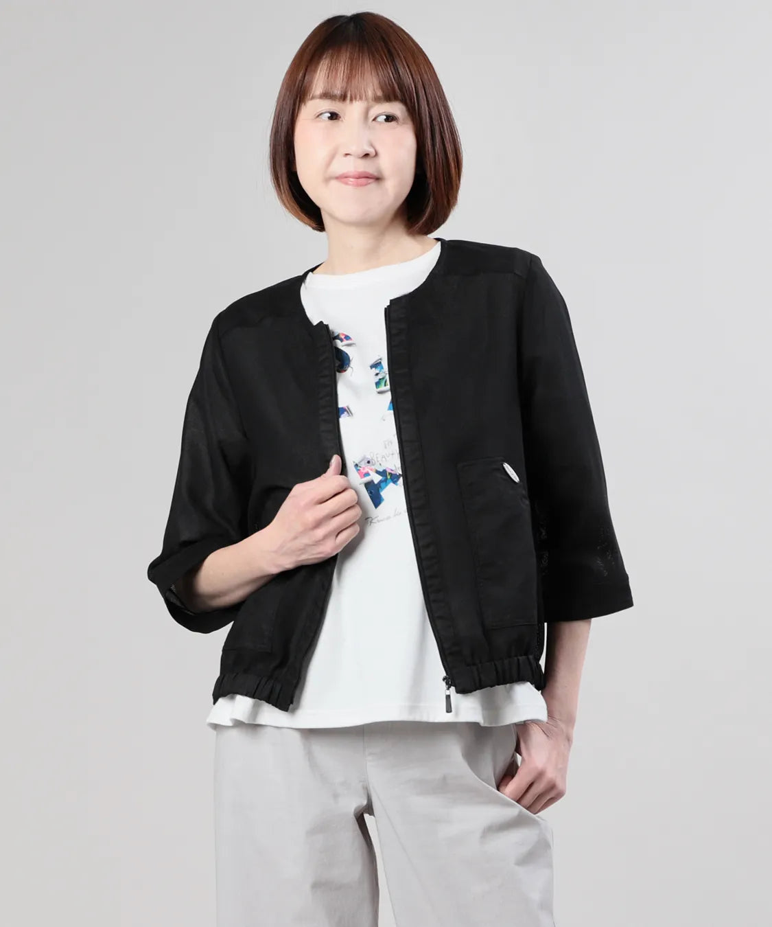 コンパクトな丈感とほどよいゆとりのあるシルエットで、パンツ・スカートともにバランスよく着こなせる一枚。フロントファスナー仕様で、さっと羽織れる手軽さも魅力です。