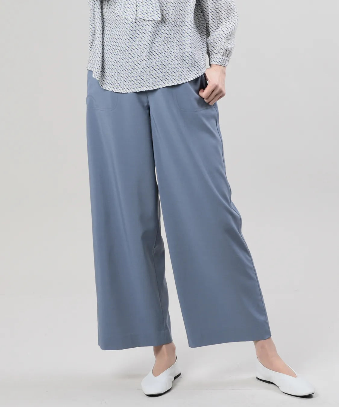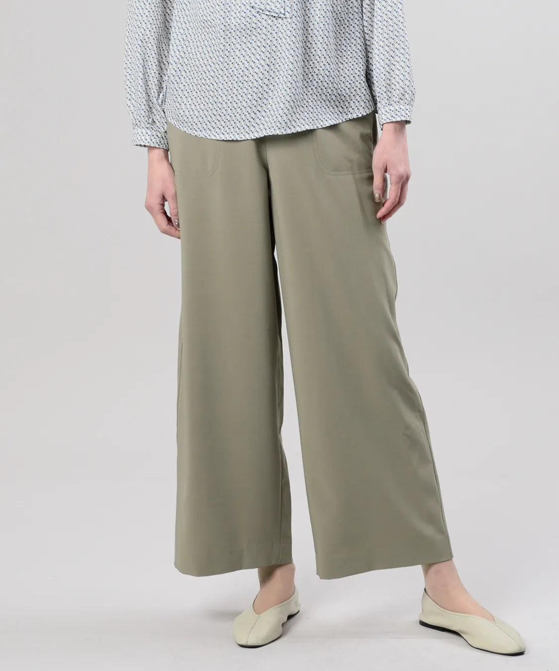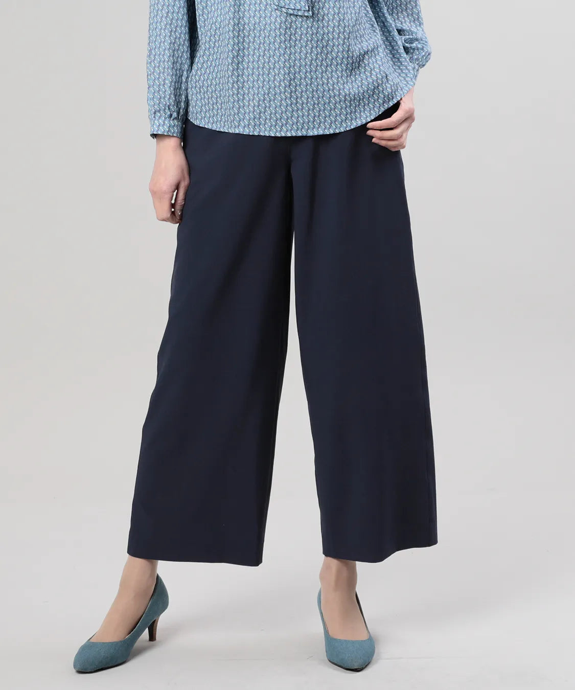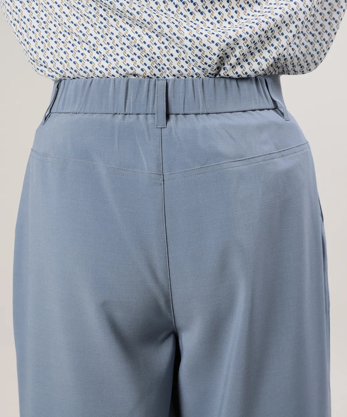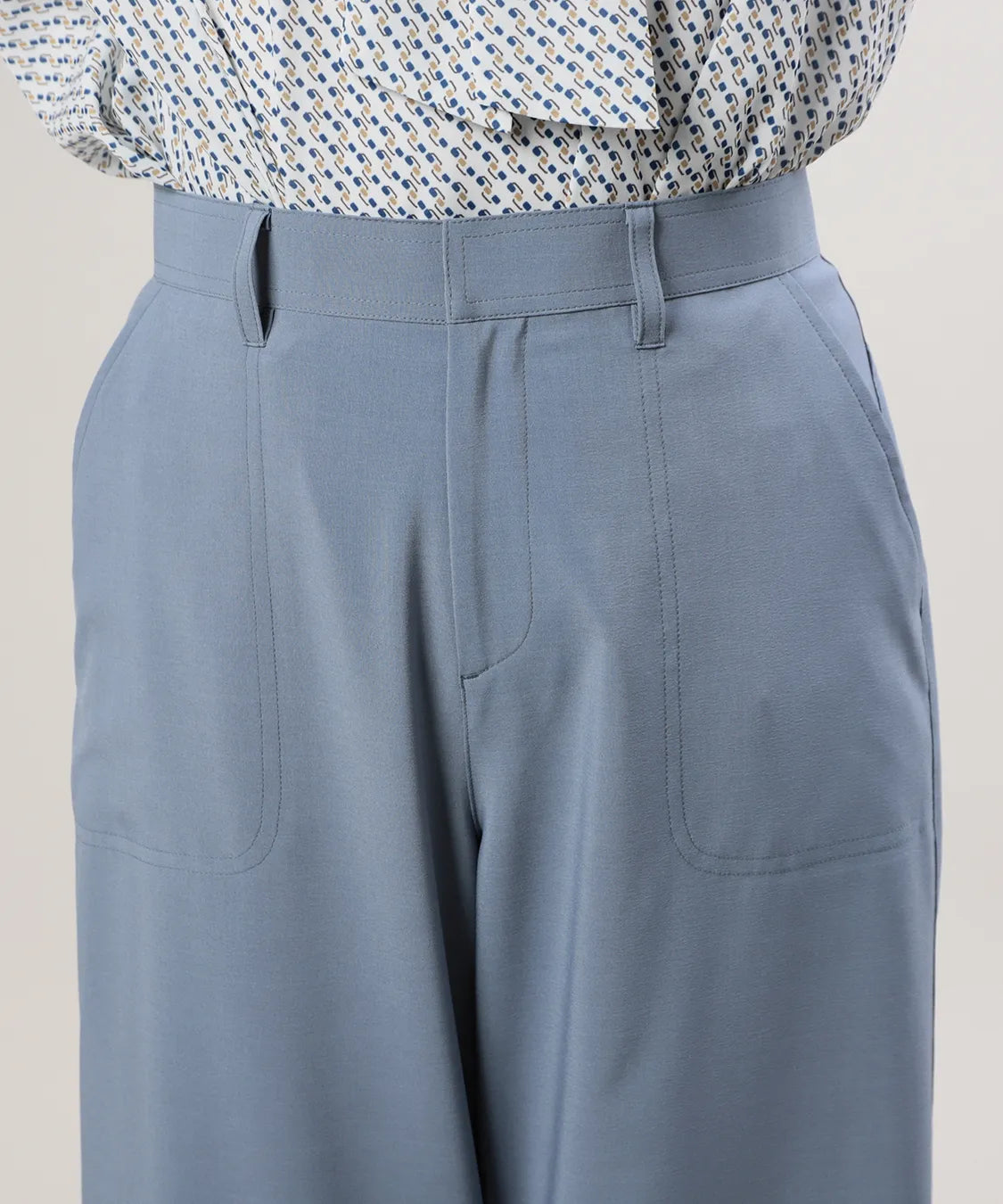 表面はなめらかで上品な印象を与え、きちんと感のある装いにも対応。ウエストまわりはすっきりと仕上げつつ、裾にかけて程よく広がるワイドシルエットが、脚のラインを拾わず美しく見せてくれます。