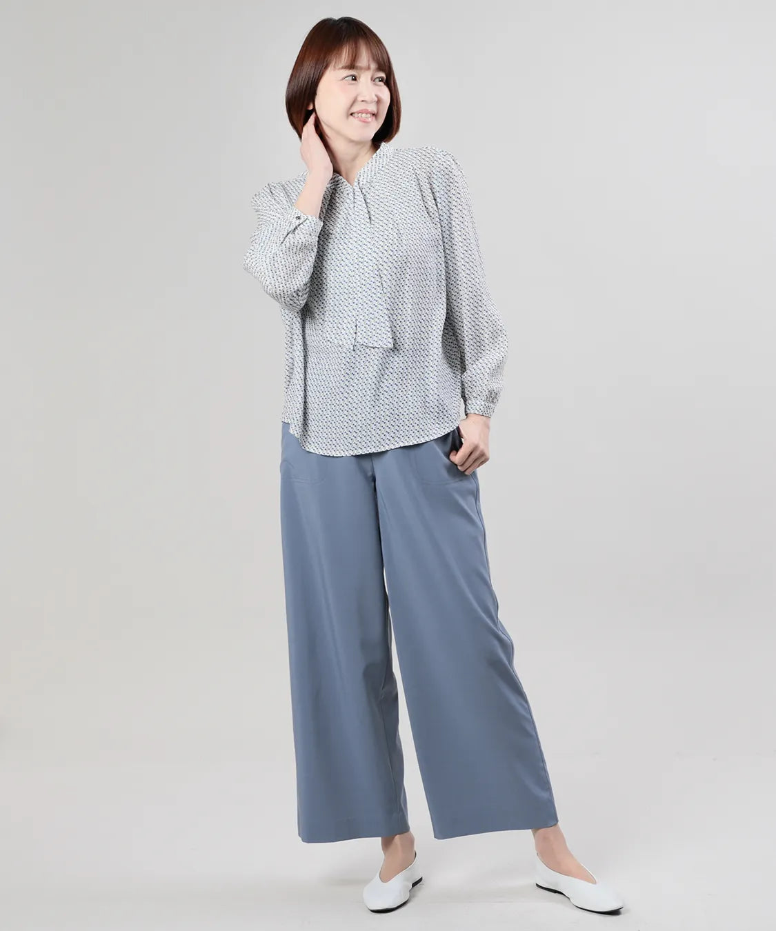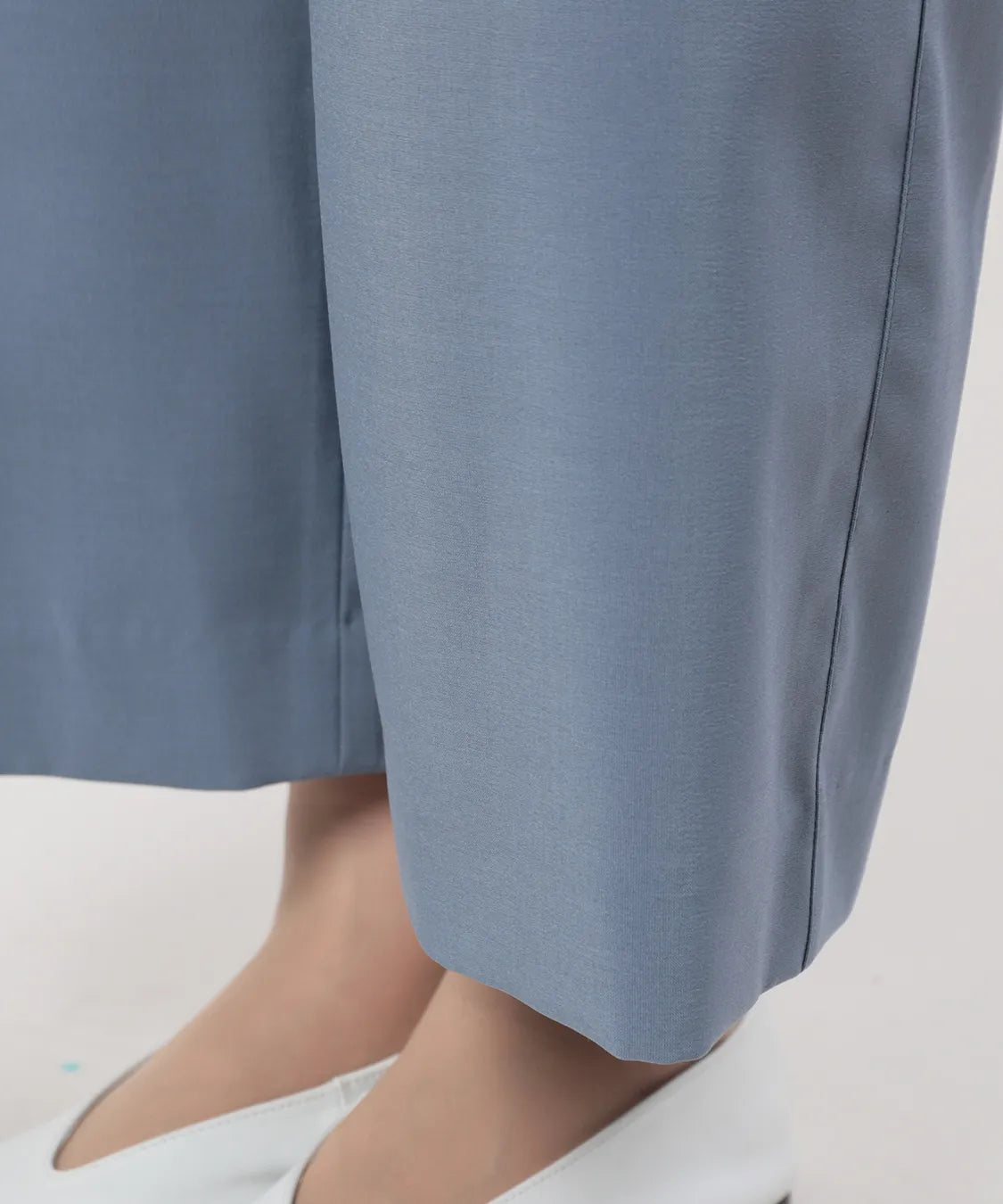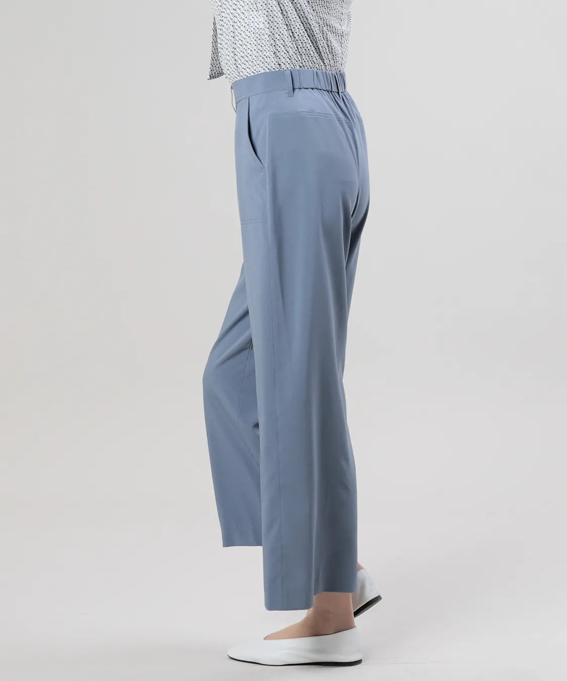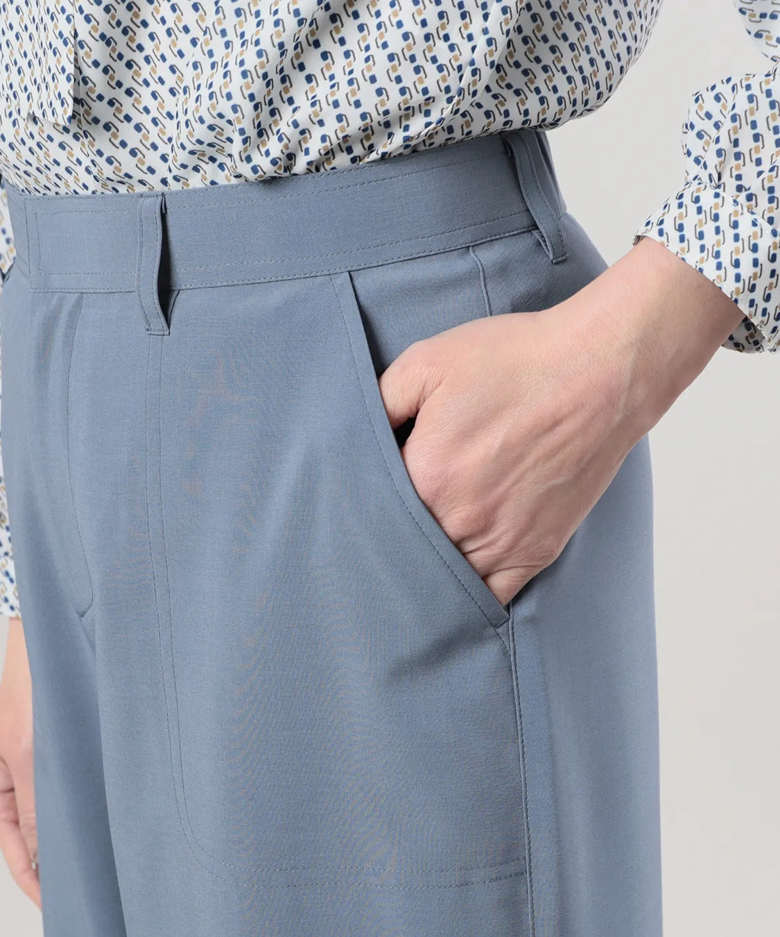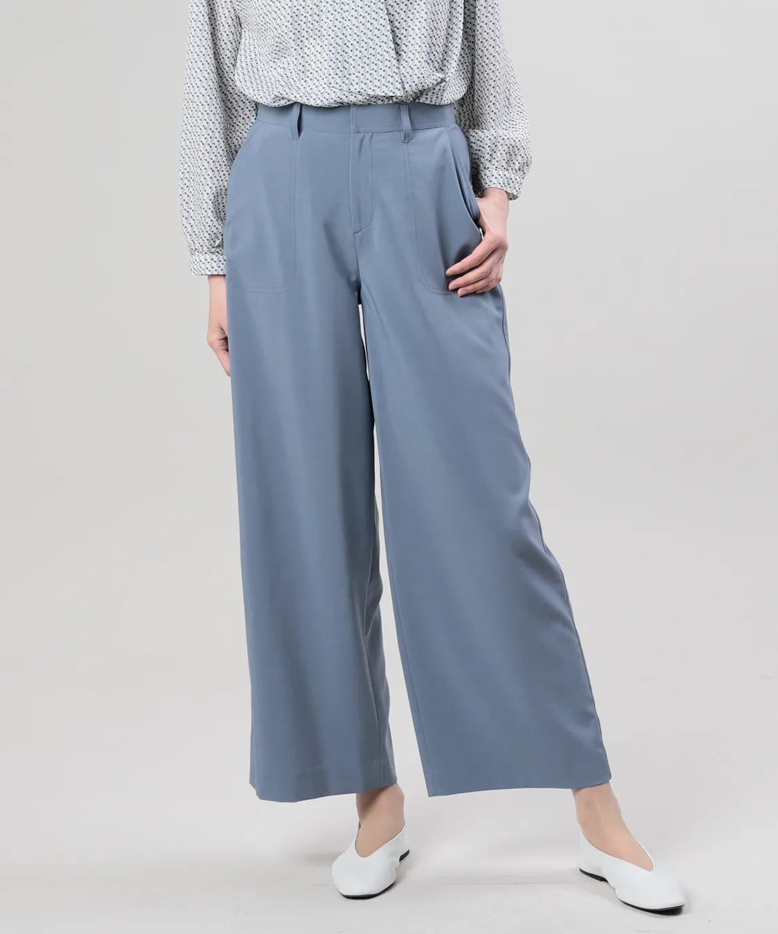 表面はなめらかで上品な印象を与え、きちんと感のある装いにも対応。ウエストまわりはすっきりと仕上げつつ、裾にかけて程よく広がるワイドシルエットが、脚のラインを拾わず美しく見せてくれます。