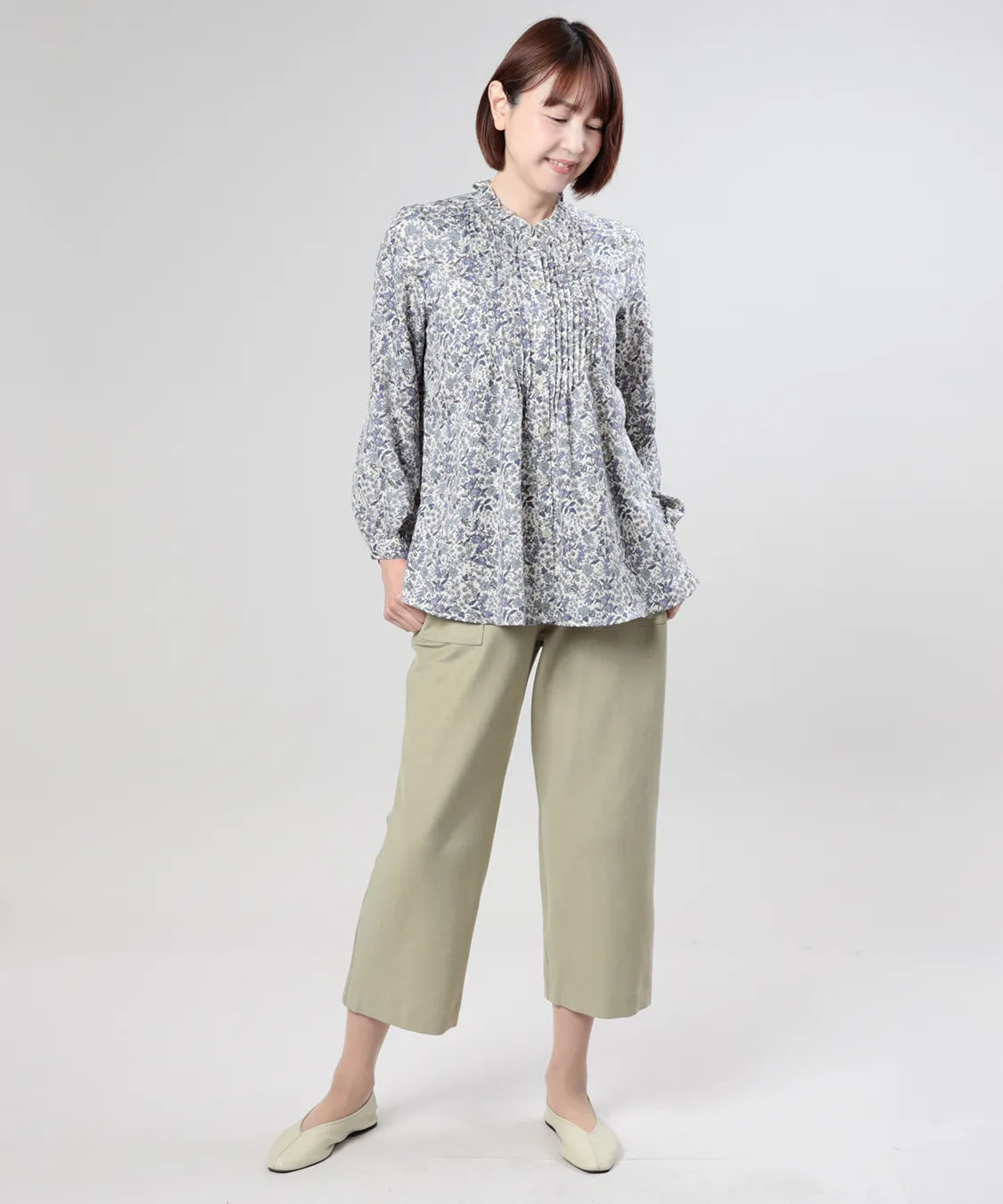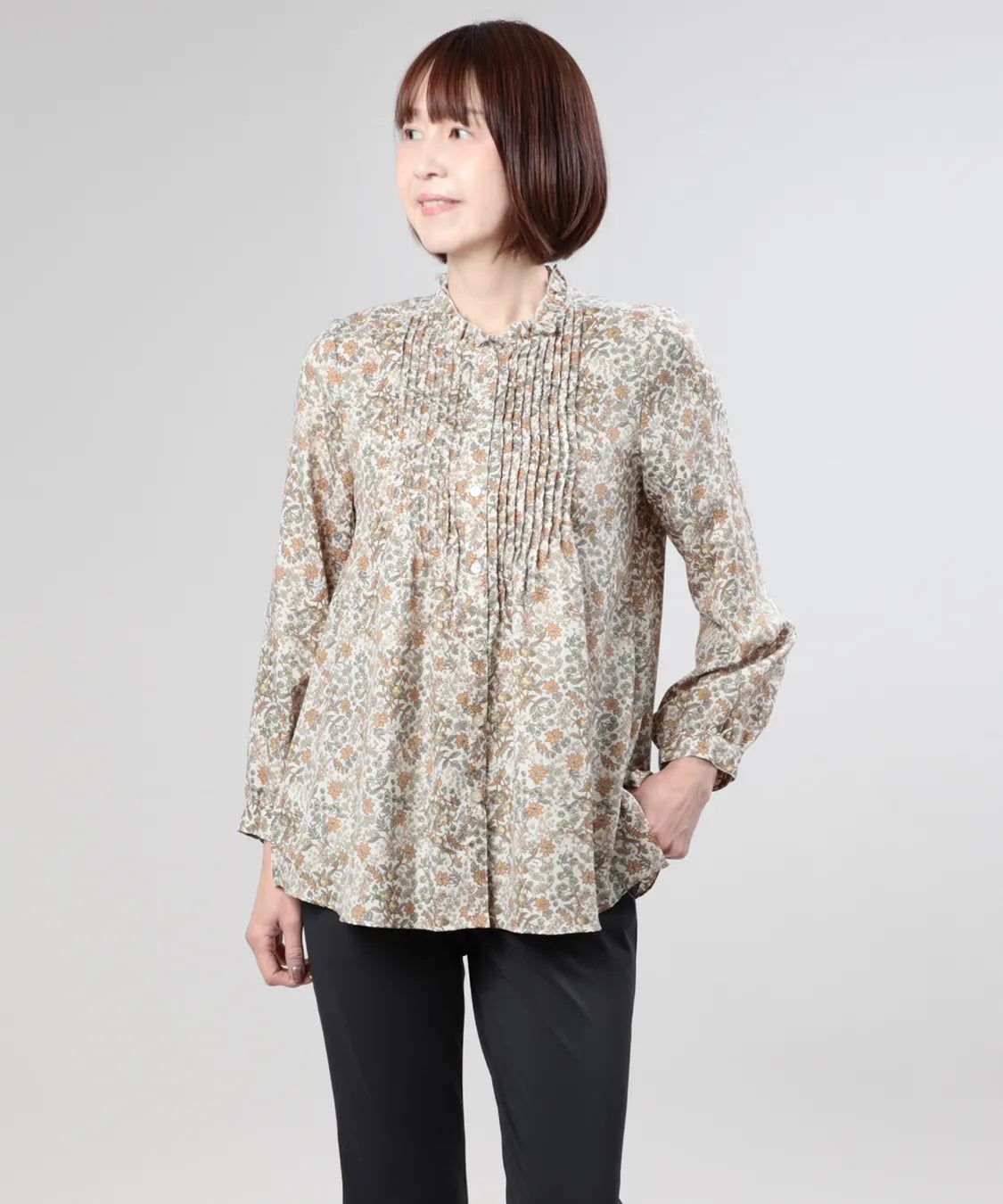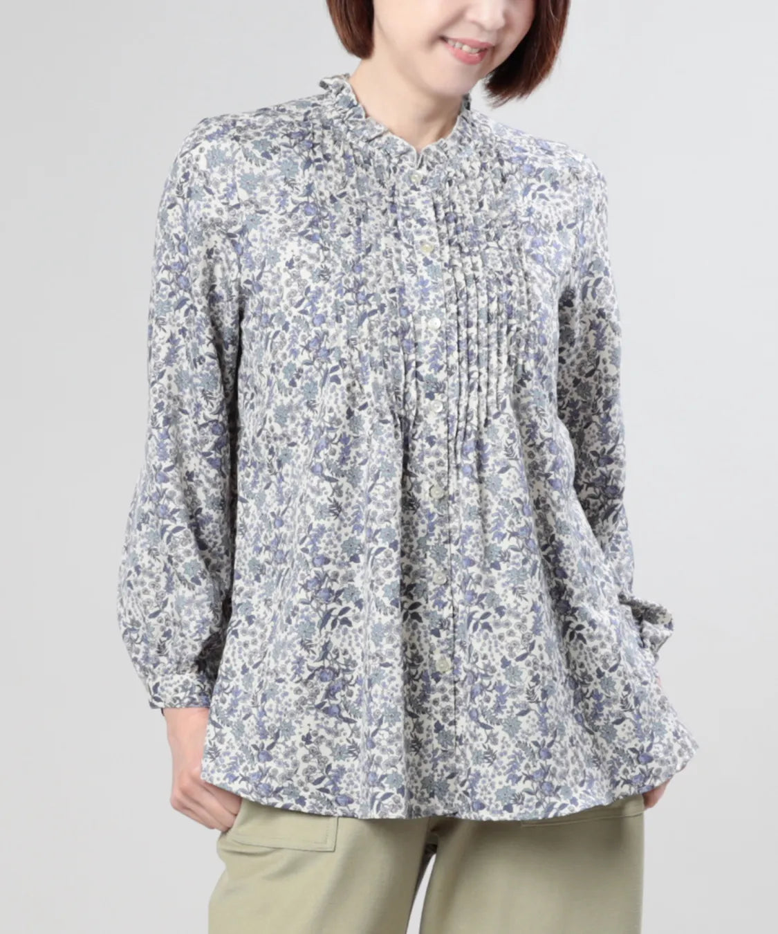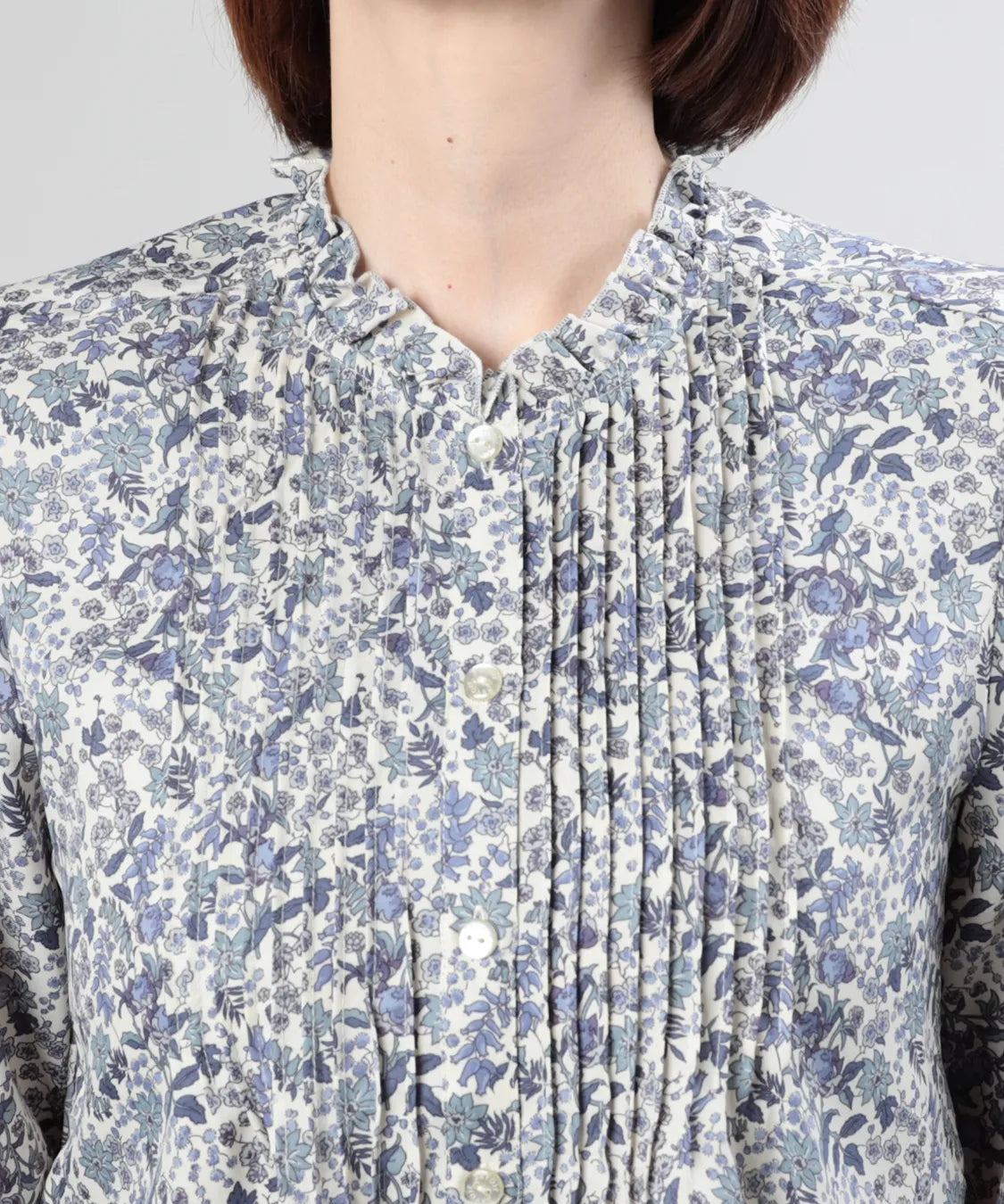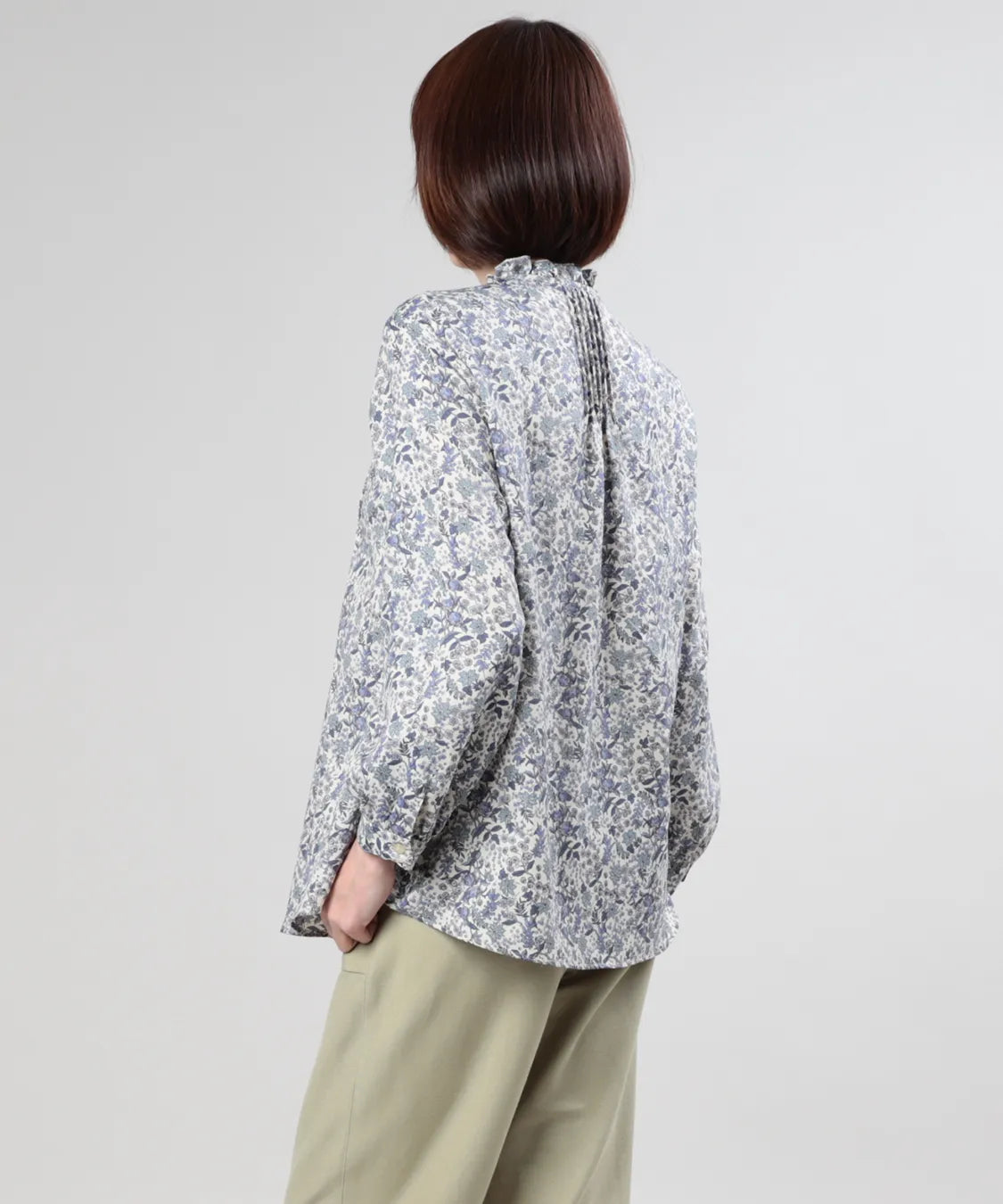 リバティプリントの繊細なフラワーデザインが美しいピンタックスタンドブラウス。胸元にあしらった細やかなピンタックが上品な立体感を生み、華やかな印象を演出します。スタンドカラーが首元をすっきりと見せ、大人らしい洗練された雰囲気に。軽やかな着心地と美しいプリントが調和し、一枚で着映えるブラウスとしてはもちろん、ジャケットインにもおすすめのアイテムです。日常のお出かけからきれいめスタイルまで幅広く活躍する一着です。