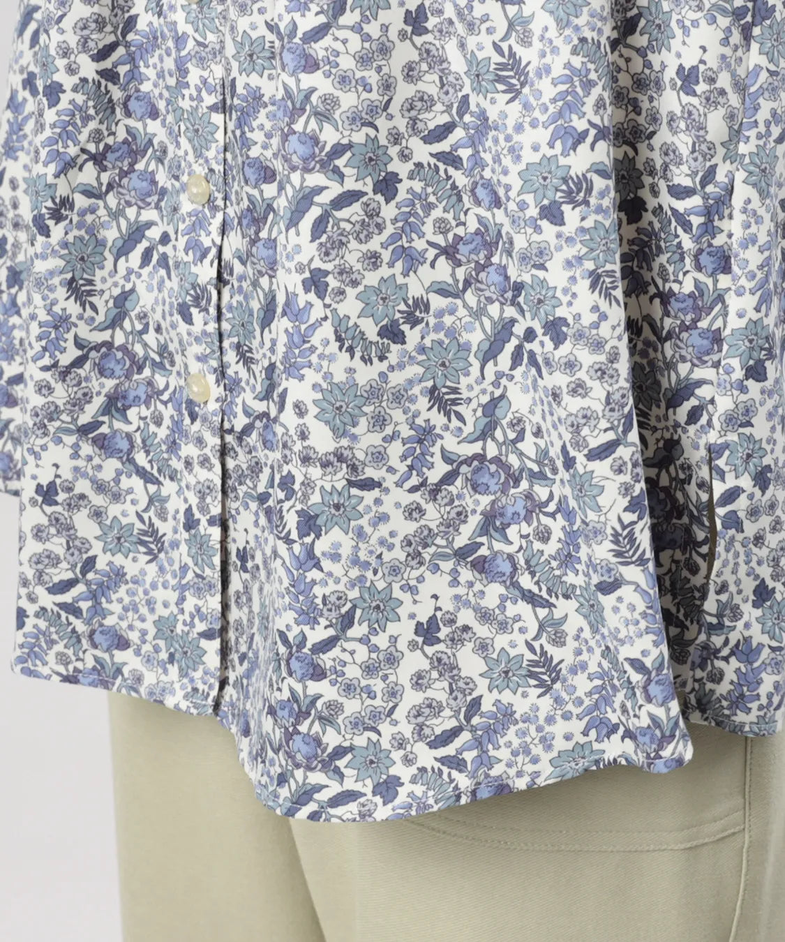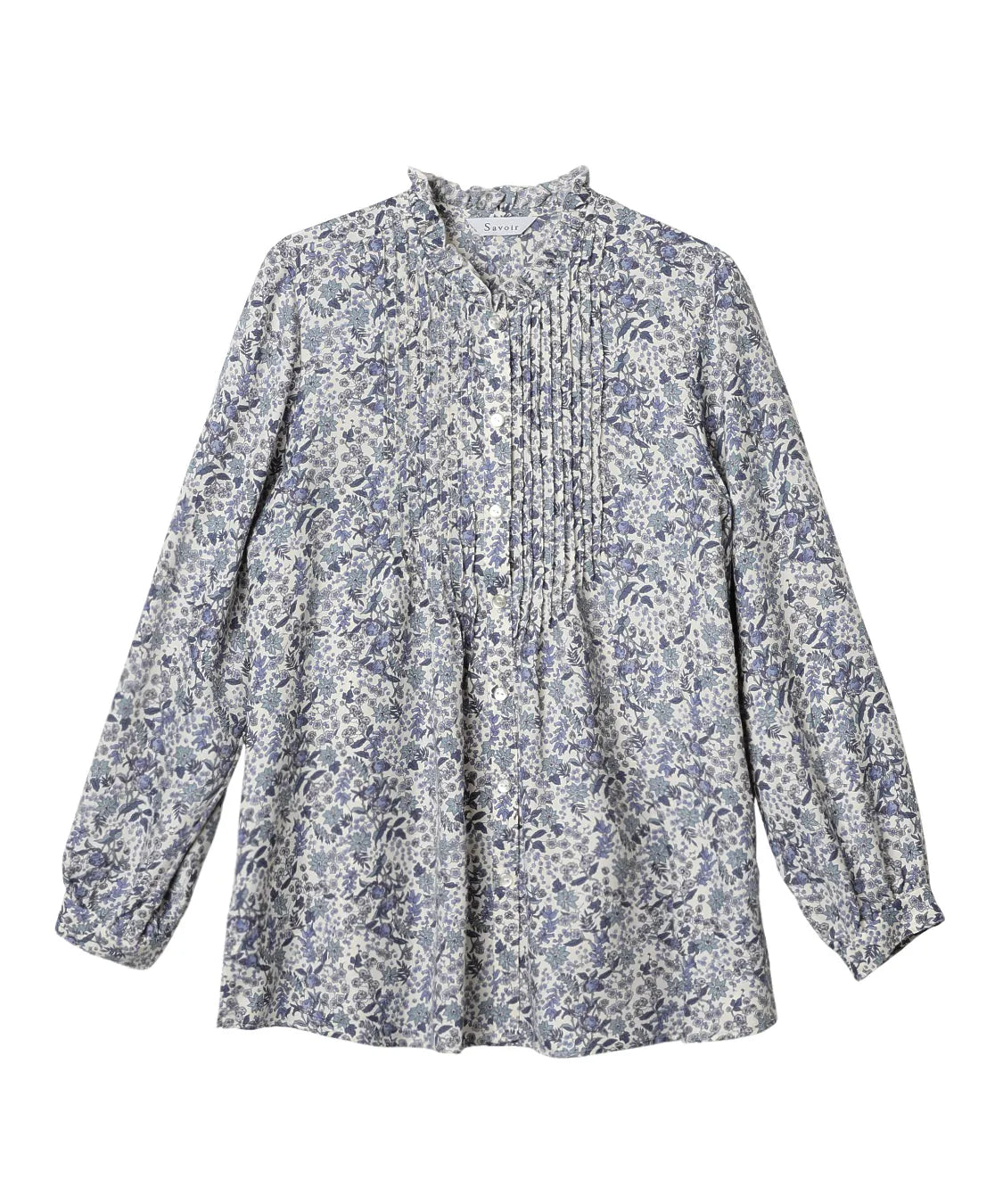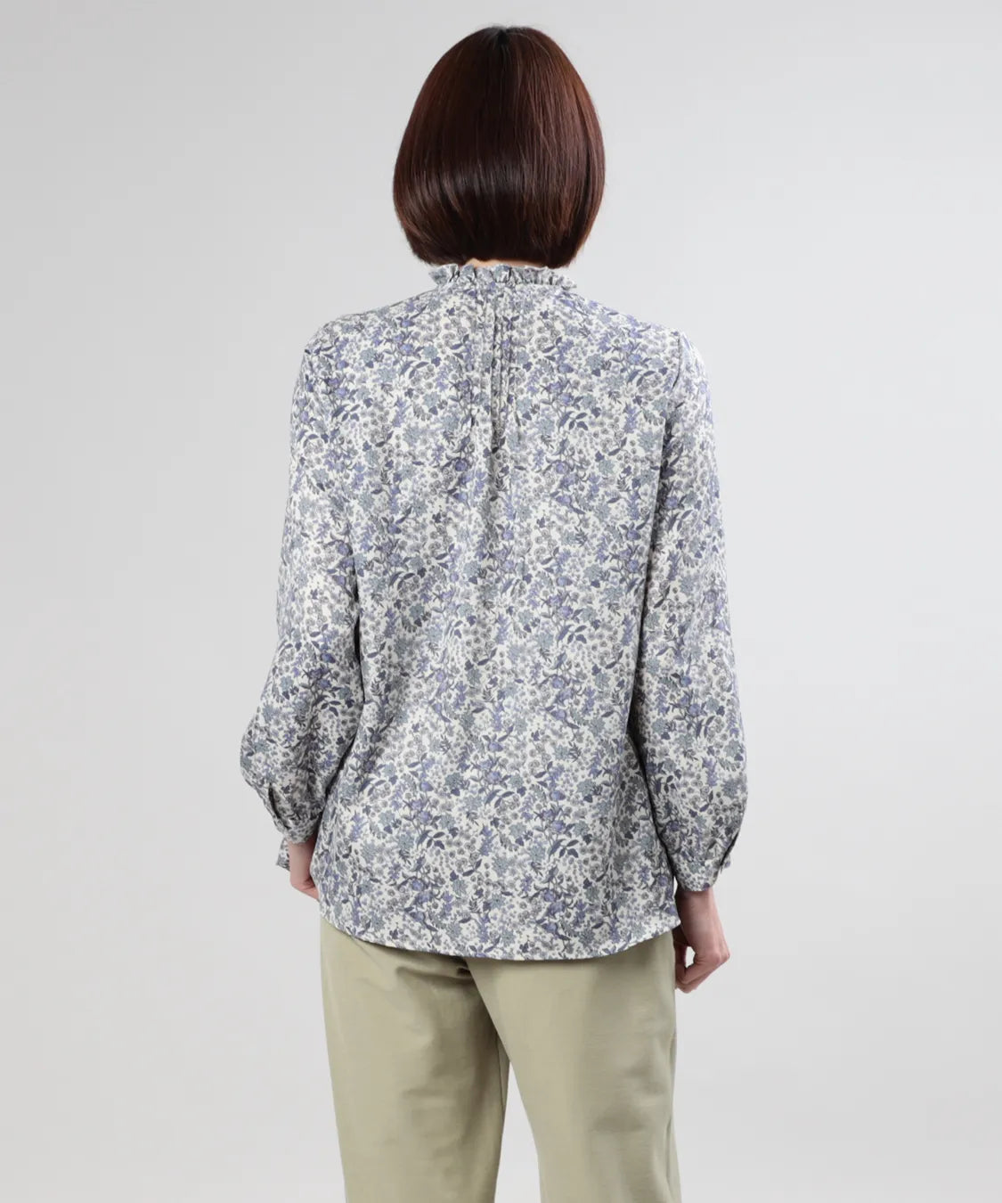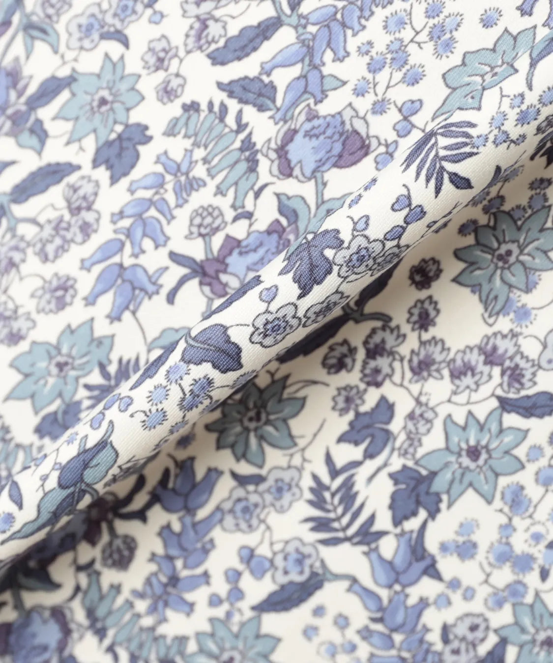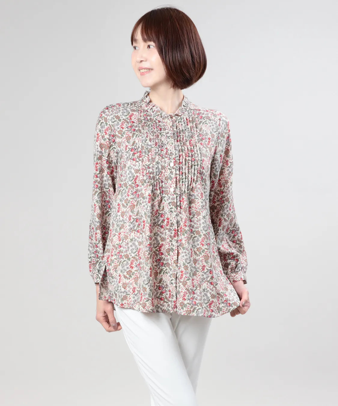 リバティプリントの繊細なフラワーデザインが美しいピンタックスタンドブラウス。胸元にあしらった細やかなピンタックが上品な立体感を生み、華やかな印象を演出します。スタンドカラーが首元をすっきりと見せ、大人らしい洗練された雰囲気に。軽やかな着心地と美しいプリントが調和し、一枚で着映えるブラウスとしてはもちろん、ジャケットインにもおすすめのアイテムです。日常のお出かけからきれいめスタイルまで幅広く活躍する一着です。