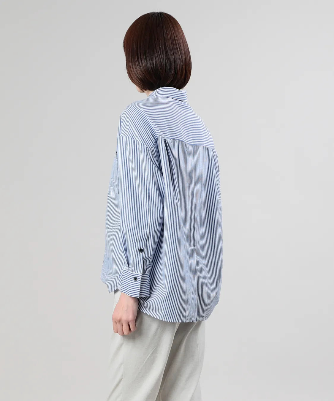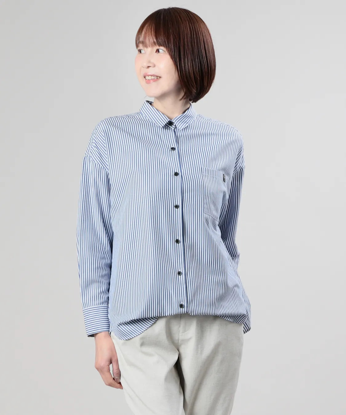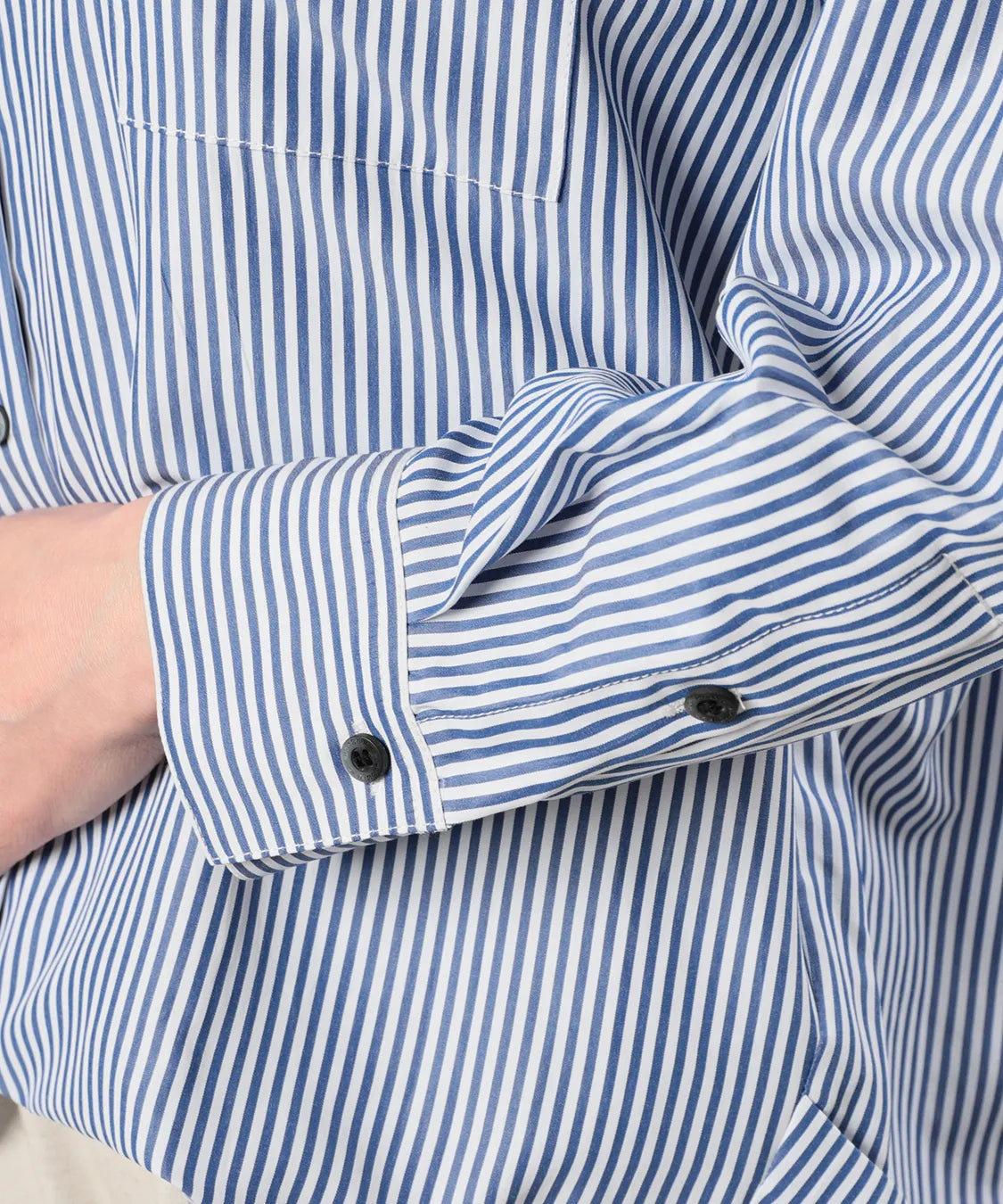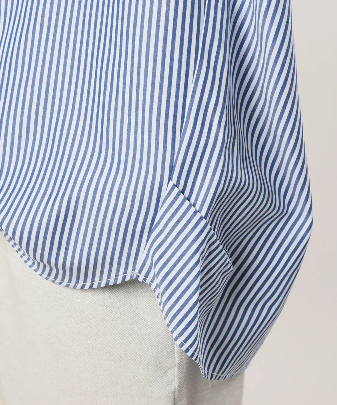 爽やかなストライプ柄が印象的な2WAYシャツ。すっきりとした縦ラインが大人らしい上品さを演出し、軽やかな着こなしを叶えます。裾のスナップボタンでシルエットをアレンジでき、スタイリングに合わせて表情を変えられるのも魅力。ゆとりのあるシルエットでリラックス感がありながら、きちんと感も兼ね備えた一枚です。パンツスタイルにも合わせやすく、日常からお出かけまで幅広く活躍する大人のデザインシャツです。