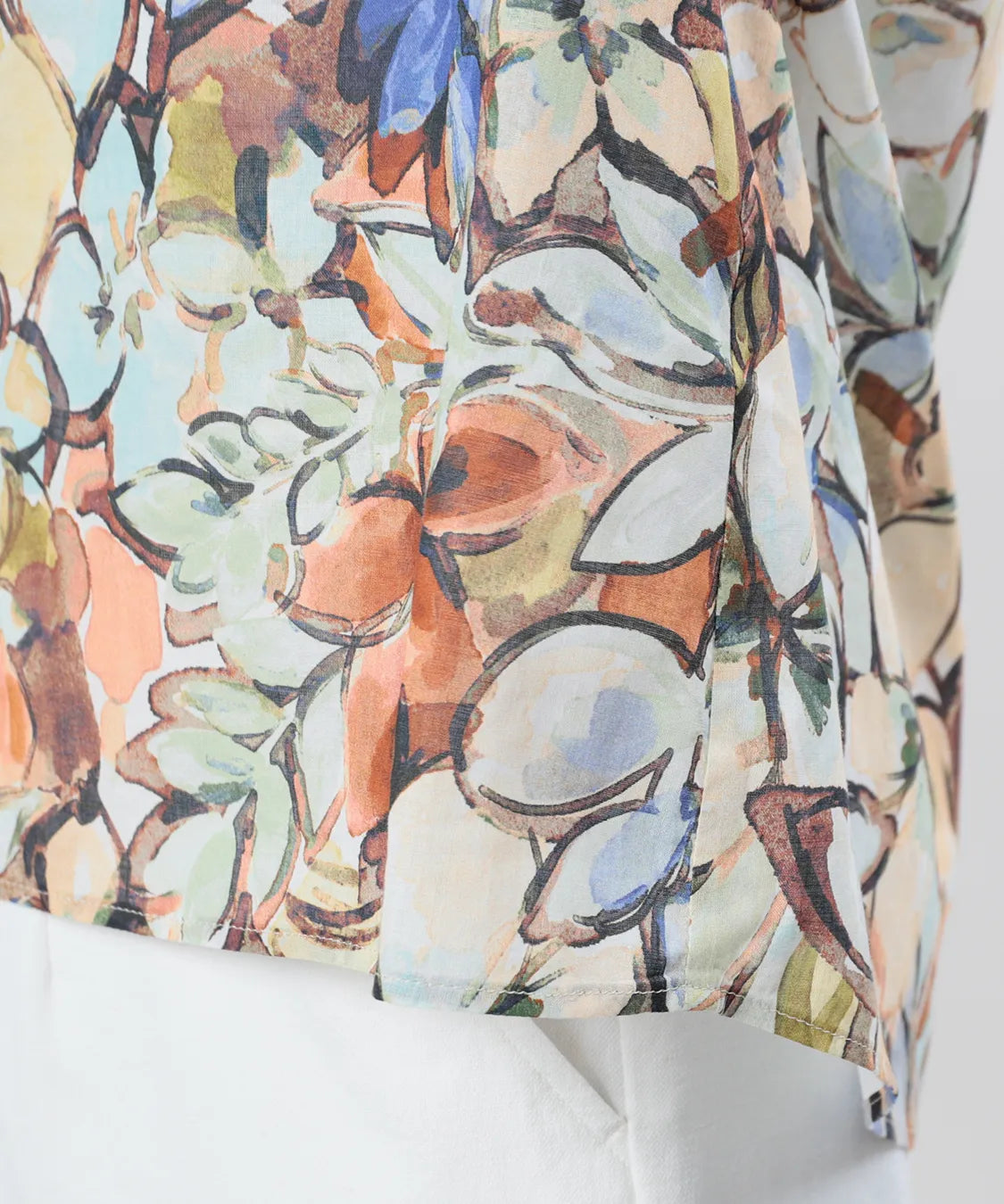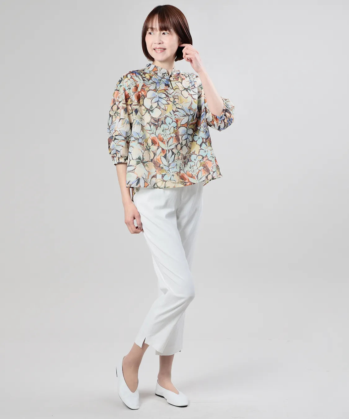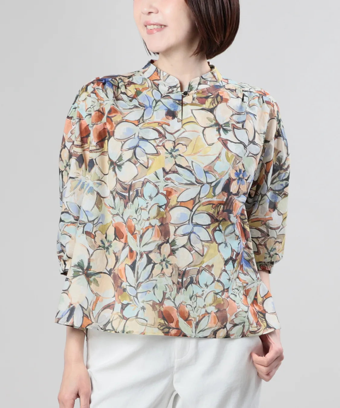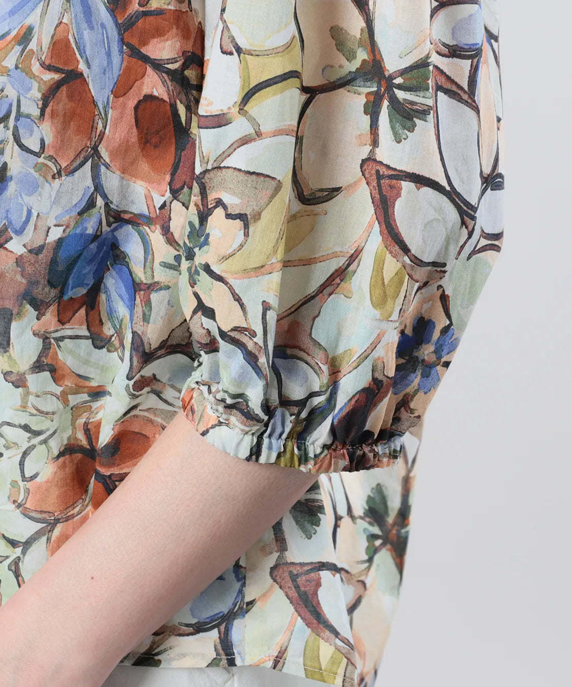 繊細なタッチで描かれたフラワープリントが目を引くデザインブラウス。