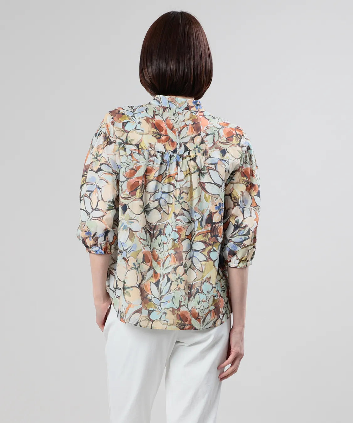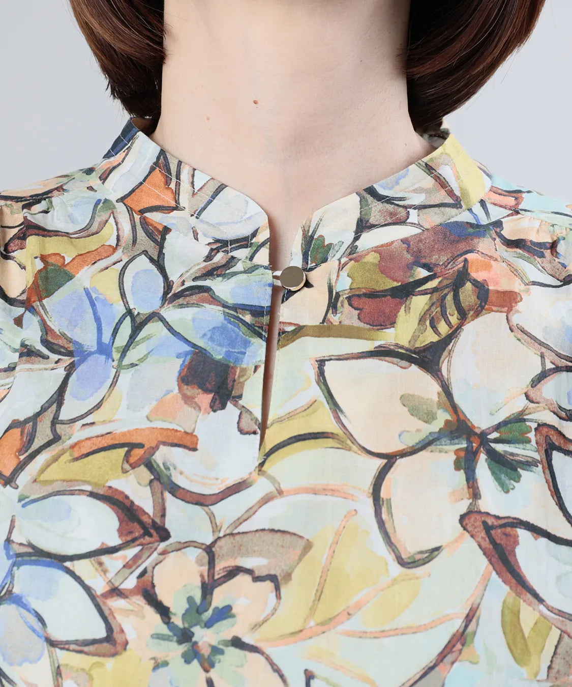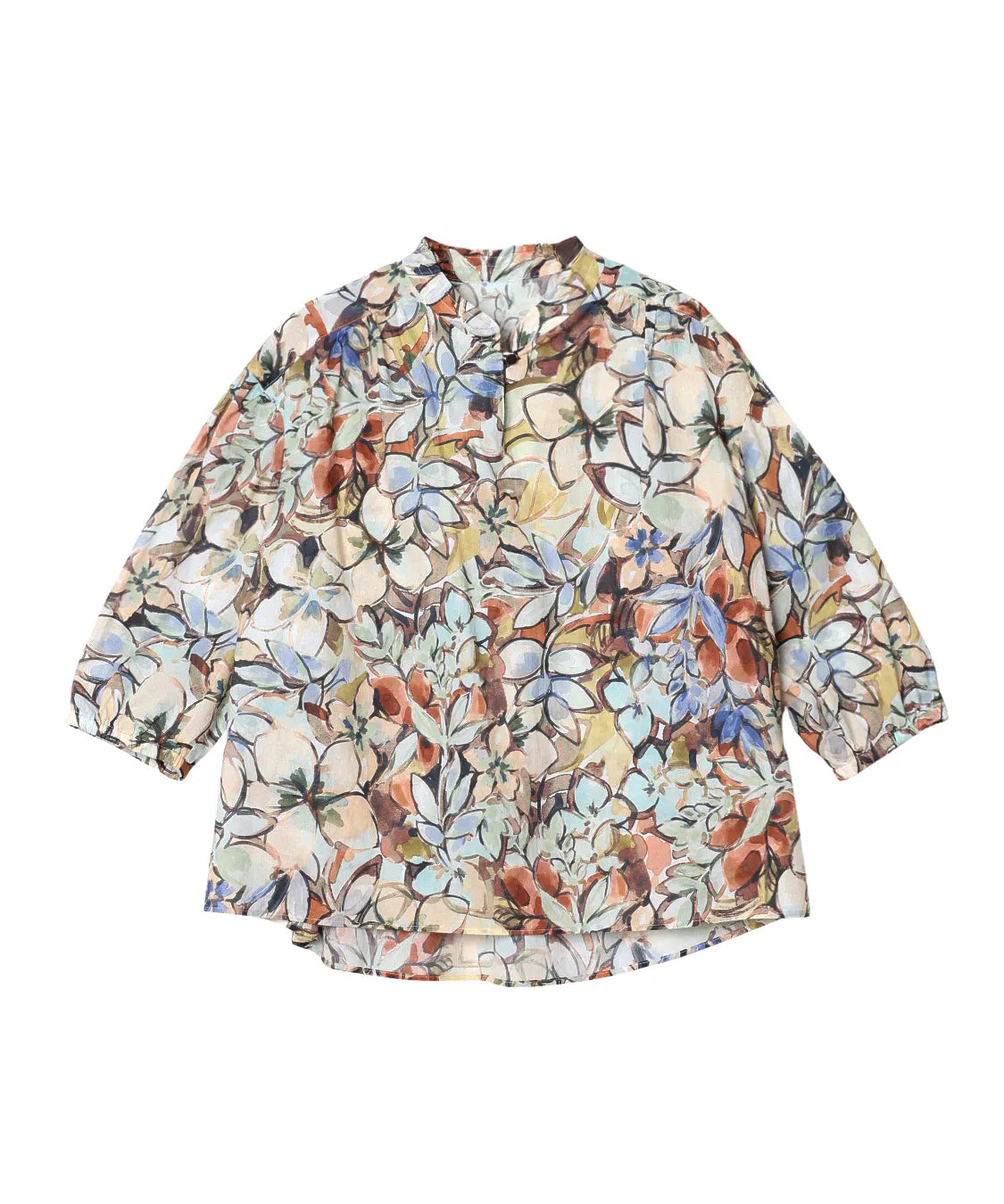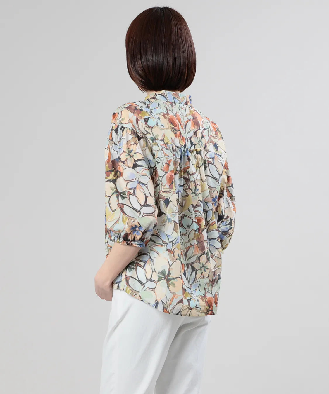 繊細なタッチで描かれたフラワープリントが目を引くデザインブラウス。