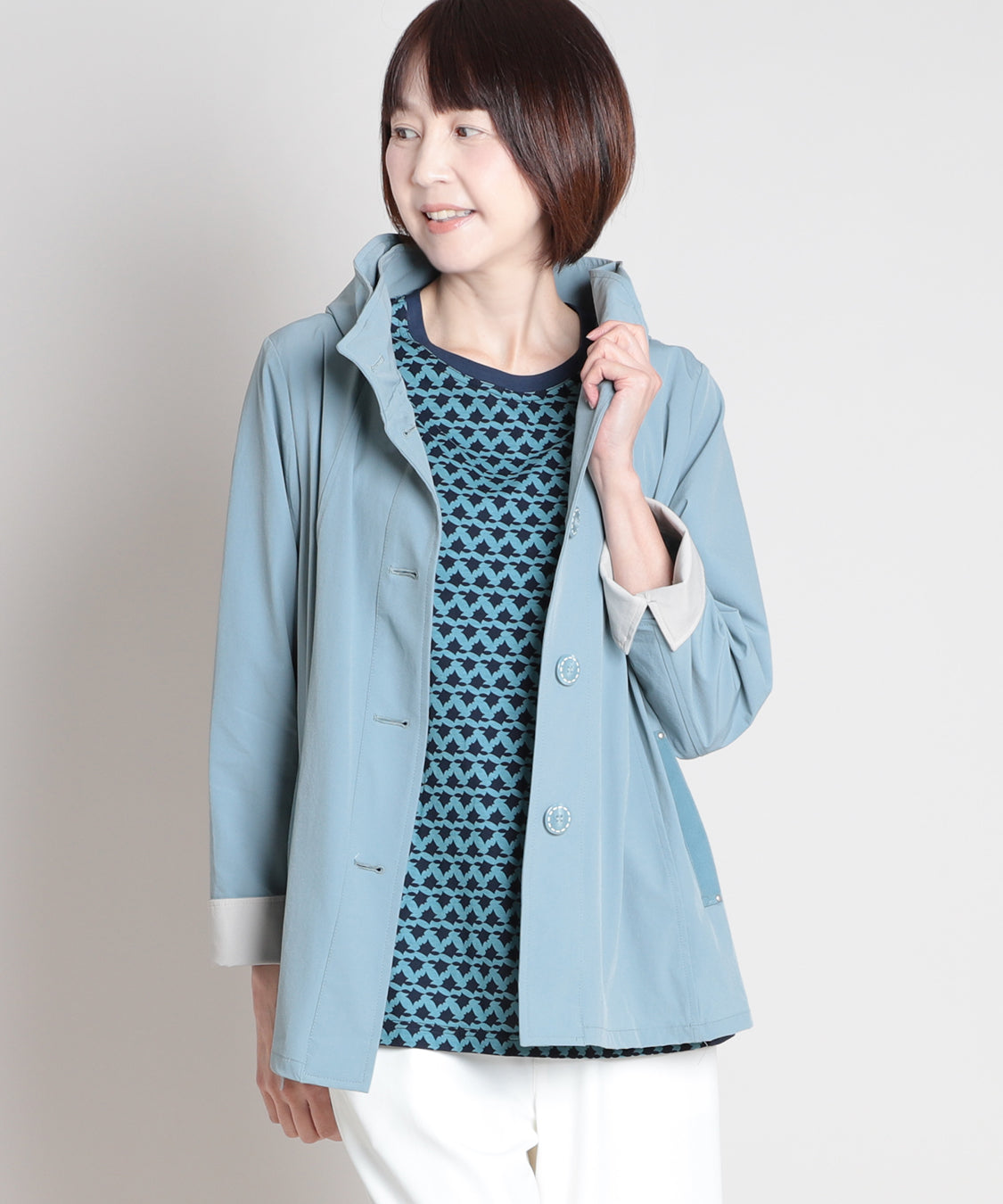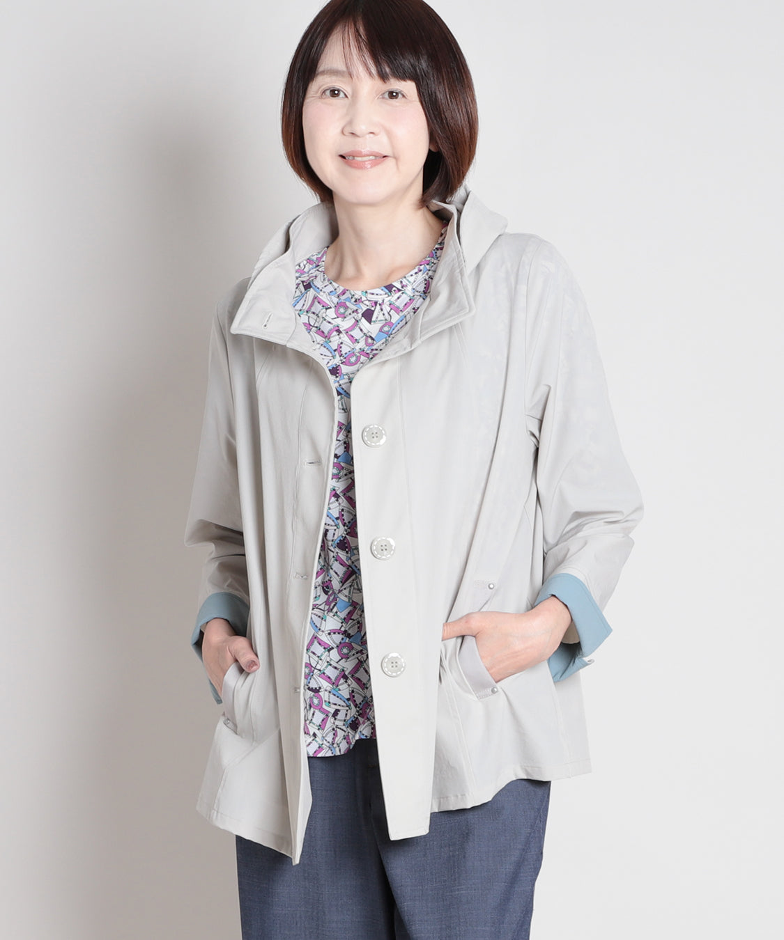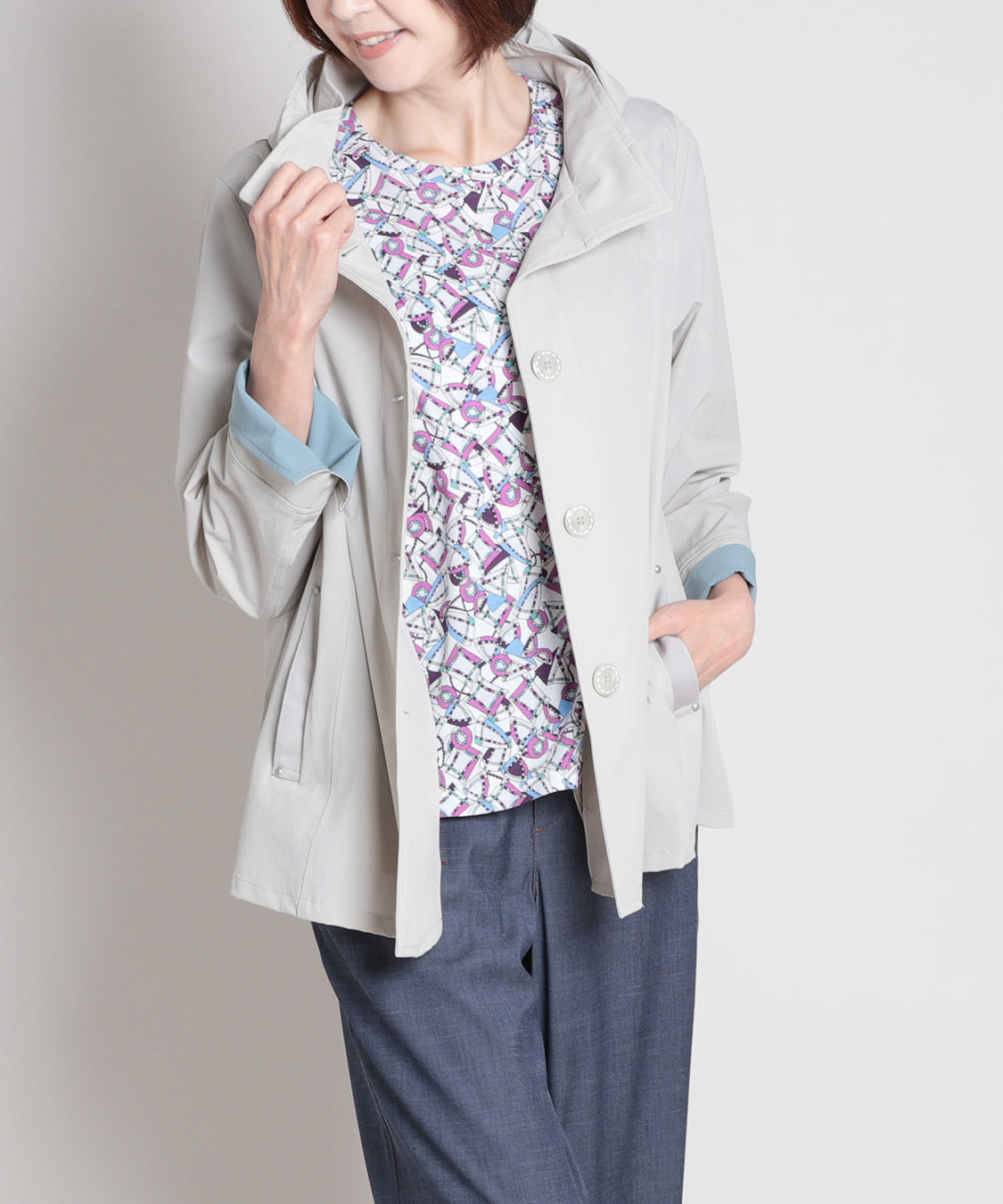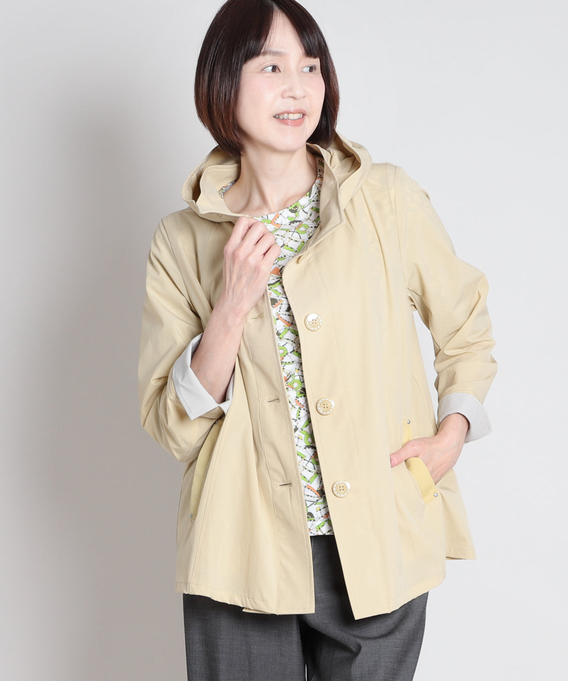 春らしい色柄のトップスと合わせたいスプリングコート。ナイロンストレッチ素材で、柔らかく軽やかな羽織り心地が特徴。袖口を一折りすれば裏色がアクセントに。裏地はなく、軽快に羽織っていただけます。