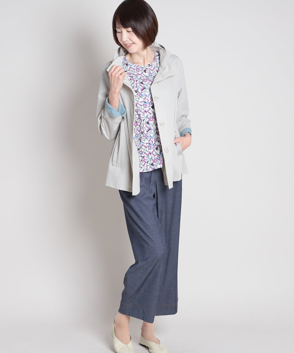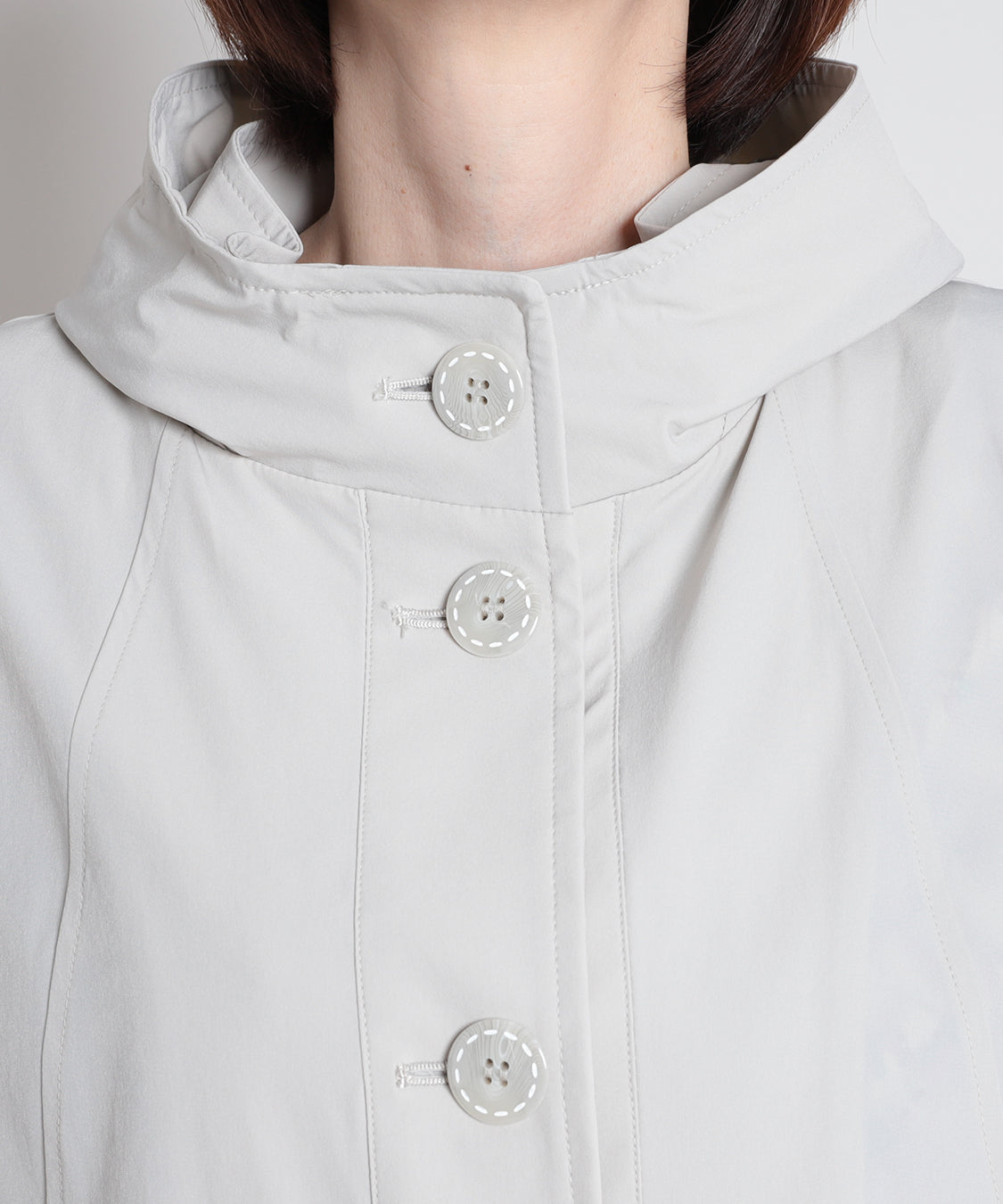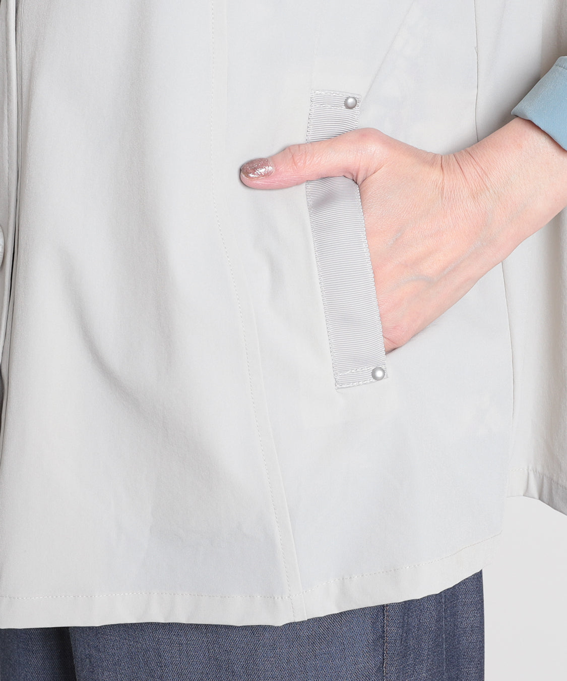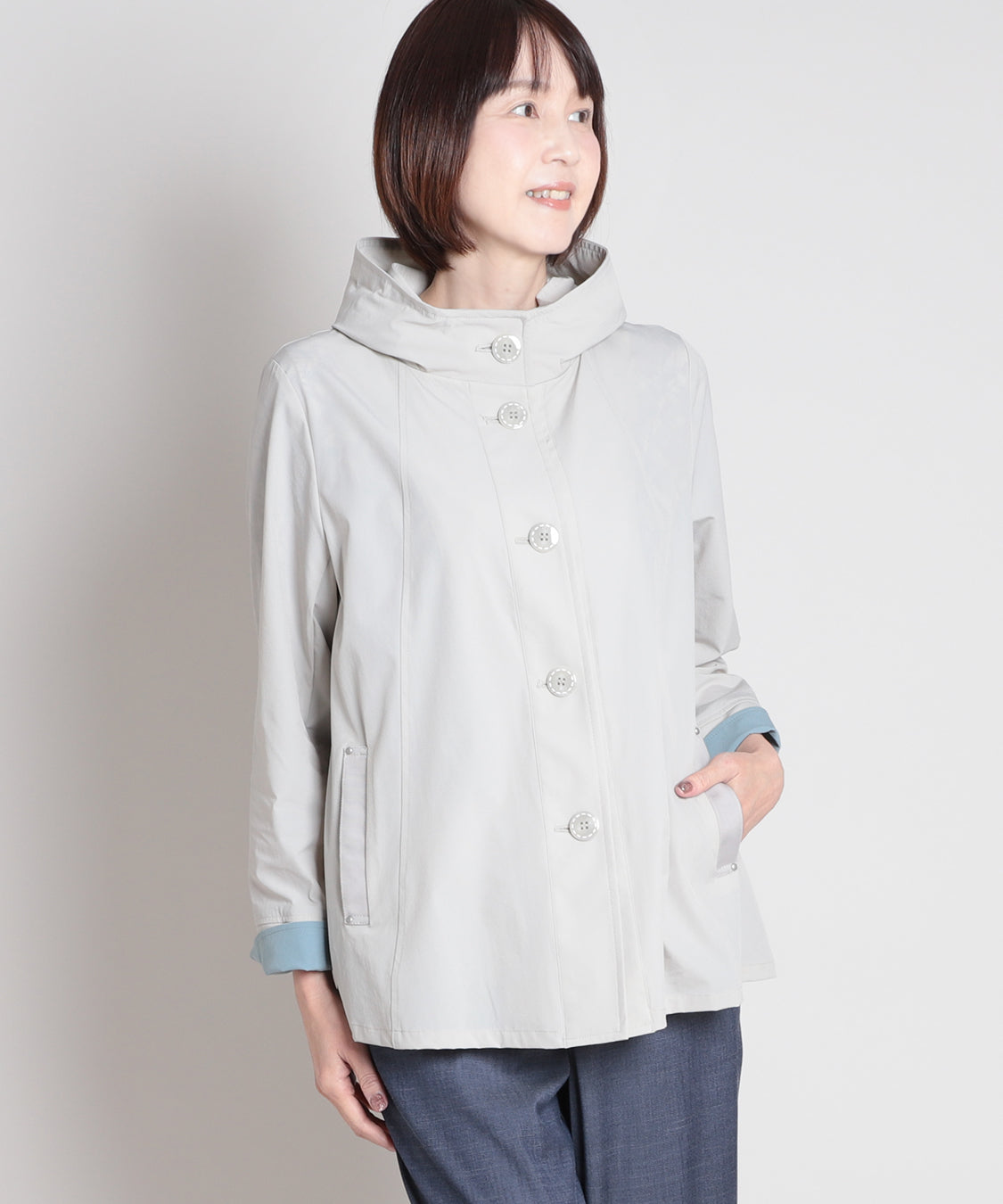春らしい色柄のトップスと合わせたいスプリングコート。ナイロンストレッチ素材で、柔らかく軽やかな羽織り心地が特徴。袖口を一折りすれば裏色がアクセントに。裏地はなく、軽快に羽織っていただけます。
