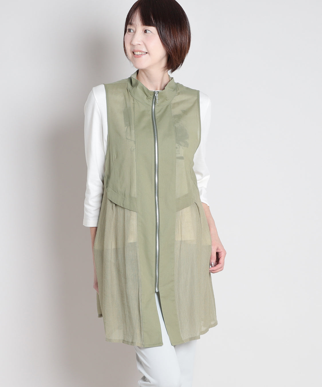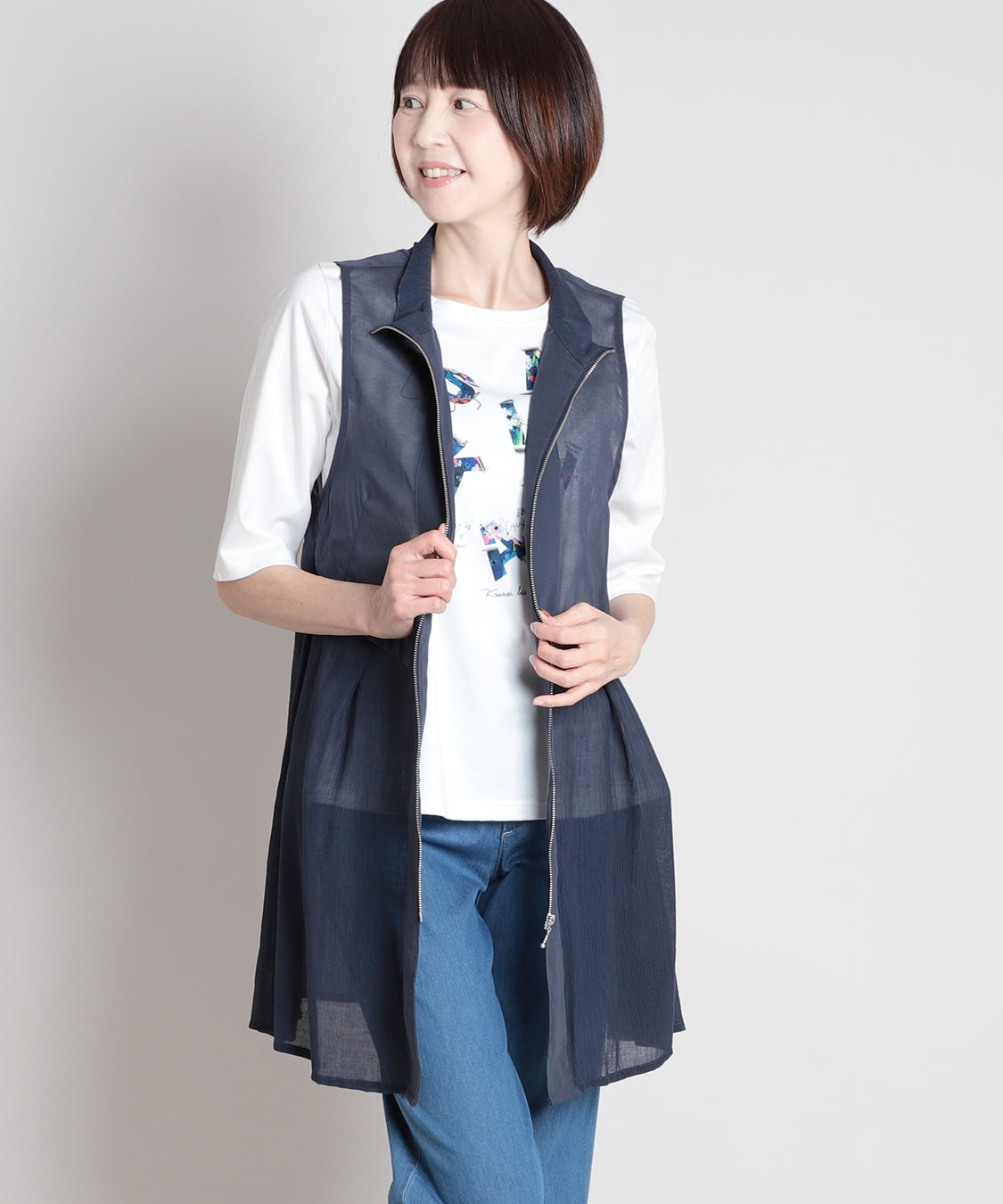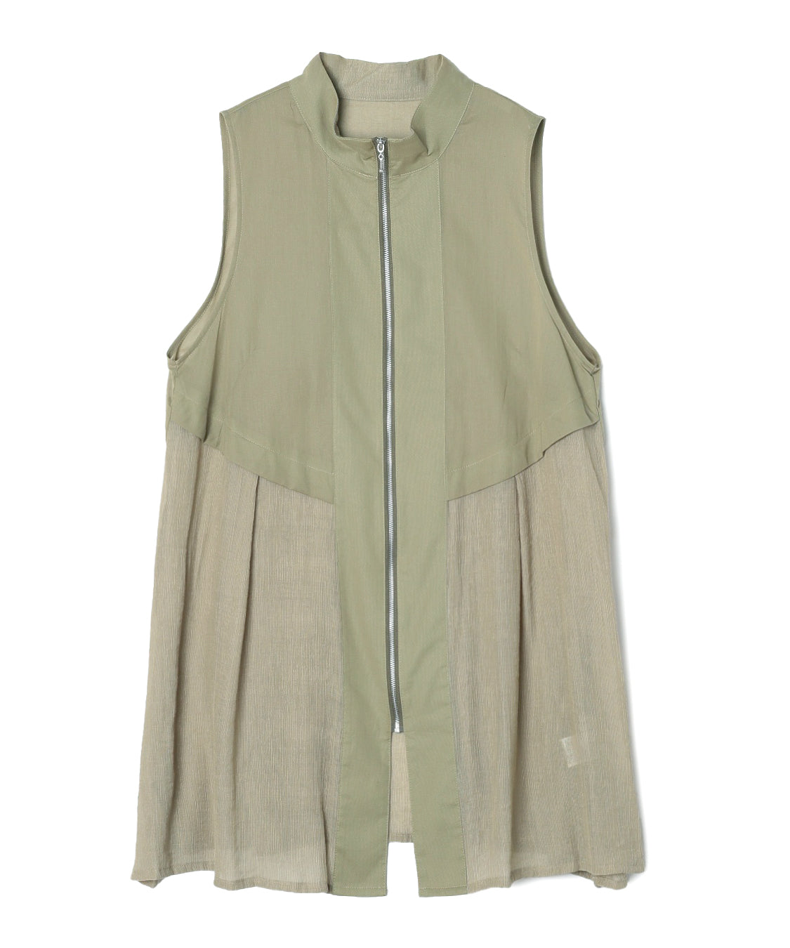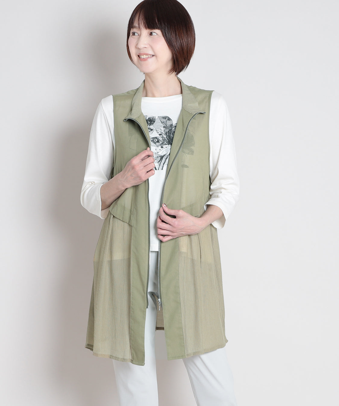 ジップアップのロング丈にショート丈ベストを重ねたような個性あるデザイン。レーヨンとナイロンを合わせた独特のシワ感と清涼感のある軽やかなシアー素材でライトに合わせられるお仕立てです。
