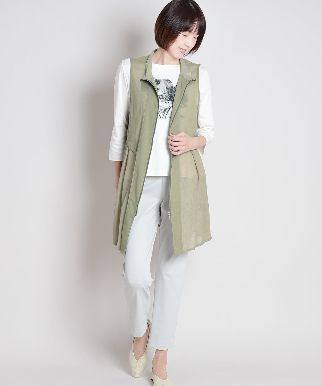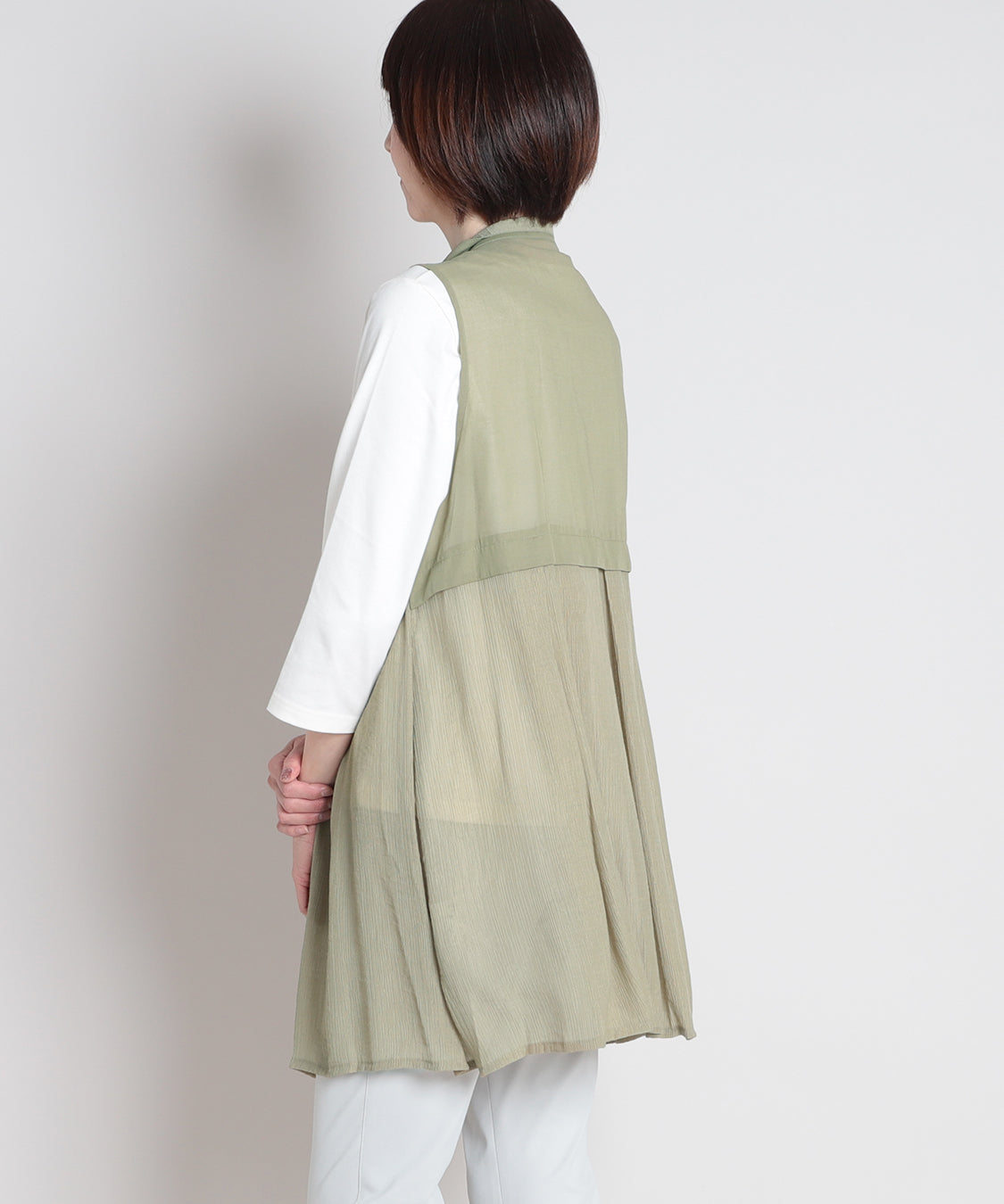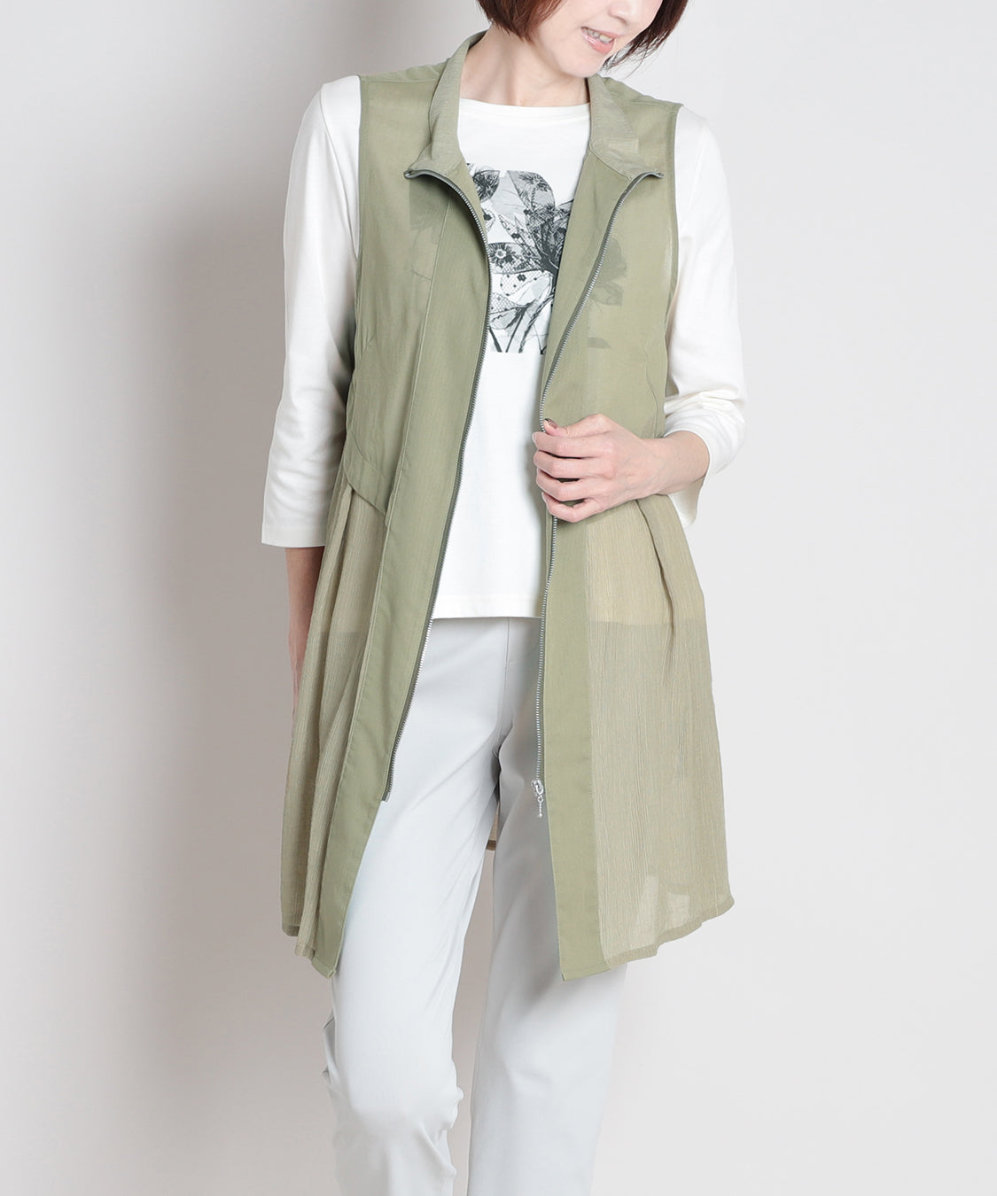 ジップアップのロング丈にショート丈ベストを重ねたような個性あるデザイン。レーヨンとナイロンを合わせた独特のシワ感と清涼感のある軽やかなシアー素材でライトに合わせられるお仕立てです。